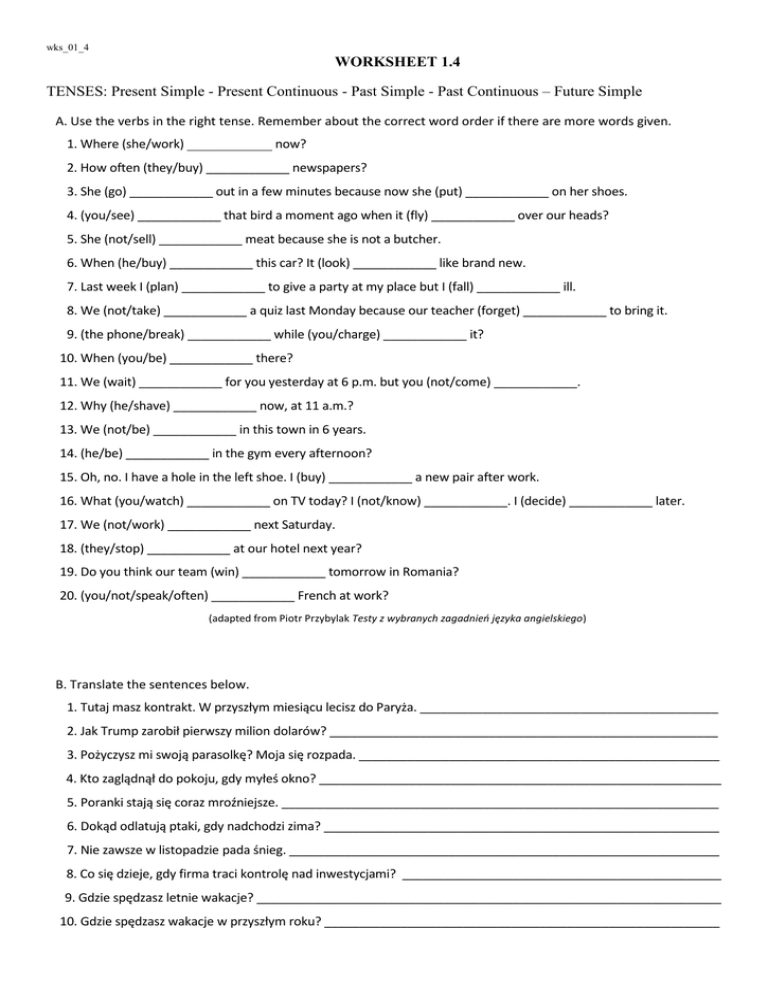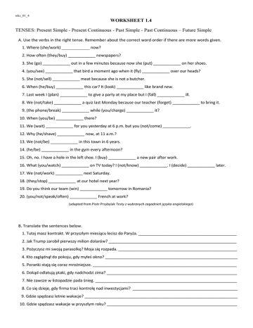 wks_01_4 WORKSHEET 1.4 TENSES: Present Simple - Present Continuous - Past Simple - Past Continuous – Future Simple A. Use the verbs in the right tense. Remember about the correct word order if there are more words given. 1. Where (she/work) ____________ now? 2. How often (they/buy) ____________ newspapers? 3. She (go) ____________ out in a few minutes because now she (put) ____________ on her shoes. 4. (you/see) ____________ that bird a moment ago when it (fly) ____________ over our heads? 5. She (not/sell) ____________ meat because she is not a butcher. 6. When (he/buy) ____________ this car? It (look) ____________ like brand new. 7. Last week I (plan) ____________ to give a party at my place but I (fall) ____________ ill. 8. We (not/take) ____________ a quiz last Monday because our teacher (forget) ____________ to bring it. 9. (the phone/break) ____________ while (you/charge) ____________ it? 10. When (you/be) ____________ there? 11. We (wait) ____________ for you yesterday at 6 p.m. but you (not/come) ____________. 12. Why (he/shave) ____________ now, at 11 a.m.? 13. We (not/be) ____________ in this town in 6 years. 14. (he/be) ____________ in the gym every afternoon? 15. Oh, no. I have a hole in the left shoe. I (buy) ____________ a new pair after work. 16. What (you/watch) ____________ on TV today? I (not/know) ____________. I (decide) ____________ later. 17. We (not/work) ____________ next Saturday. 18. (they/stop) ____________ at our hotel next year? 19. Do you think our team (win) ____________ tomorrow in Romania? 20. (you/not/speak/often) ____________ French at work? (adapted from Piotr Przybylak Testy z wybranych zagadnień języka angielskiego) B. Translate the sentences below. 1. Tutaj masz kontrakt. W przyszłym miesiącu lecisz do Paryża. ___________________________________________ 2. Jak Trump zarobił pierwszy milion dolarów? ________________________________________________________ 3. Pożyczysz mi swoją parasolkę? Moja się rozpada. ____________________________________________________ 4. Kto zaglądnął do pokoju, gdy myłeś okno? __________________________________________________________ 5. Poranki stają się coraz mroźniejsze. _______________________________________________________________ 6. Dokąd odlatują ptaki, gdy nadchodzi zima? _________________________________________________________ 7. Nie zawsze w listopadzie pada śnieg. ______________________________________________________________ 8. Co się dzieje, gdy firma traci kontrolę nad inwestycjami? ______________________________________________ 9. Gdzie spędzasz letnie wakacje? ___________________________________________________________________ 10. Gdzie spędzasz wakacje w przyszłym roku? _________________________________________________________