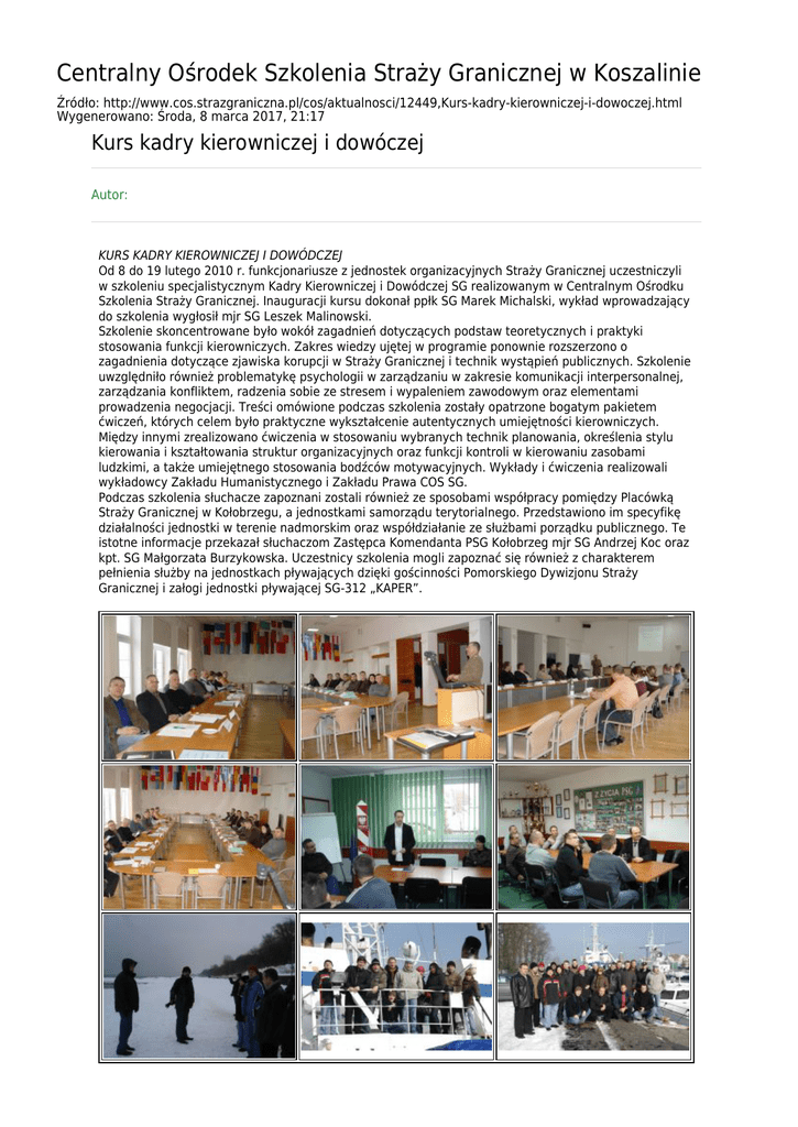 Centralny Ośrodek Szkolenia Straży Granicznej w Koszalinie Źródło: http://www.cos.strazgraniczna.pl/cos/aktualnosci/12449,Kurs-kadry-kierowniczej-i-dowoczej.html Wygenerowano: Środa, 8 marca 2017, 21:17 Kurs kadry kierowniczej i dowóczej Autor: KURS KADRY KIEROWNICZEJ I DOWÓDCZEJ Od 8 do 19 lutego 2010 r. funkcjonariusze z jednostek organizacyjnych Straży Granicznej uczestniczyli w szkoleniu specjalistycznym Kadry Kierowniczej i Dowódczej SG realizowanym w Centralnym Ośrodku Szkolenia Straży Granicznej. Inauguracji kursu dokonał ppłk SG Marek Michalski, wykład wprowadzający do szkolenia wygłosił mjr SG Leszek Malinowski. Szkolenie skoncentrowane było wokół zagadnień dotyczących podstaw teoretycznych i praktyki stosowania funkcji kierowniczych. Zakres wiedzy ujętej w programie ponownie rozszerzono o zagadnienia dotyczące zjawiska korupcji w Straży Granicznej i technik wystąpień publicznych. Szkolenie uwzględniło również problematykę psychologii w zarządzaniu w zakresie komunikacji interpersonalnej, zarządzania konfliktem, radzenia sobie ze stresem i wypaleniem zawodowym oraz elementami prowadzenia negocjacji. Treści omówione podczas szkolenia zostały opatrzone bogatym pakietem ćwiczeń, których celem było praktyczne wykształcenie autentycznych umiejętności kierowniczych. Między innymi zrealizowano ćwiczenia w stosowaniu wybranych technik planowania, określenia stylu kierowania i kształtowania struktur organizacyjnych oraz funkcji kontroli w kierowaniu zasobami ludzkimi, a także umiejętnego stosowania bodźców motywacyjnych. Wykłady i ćwiczenia realizowali wykładowcy Zakładu Humanistycznego i Zakładu Prawa COS SG. Podczas szkolenia słuchacze zapoznani zostali również ze sposobami współpracy pomiędzy Placówką Straży Granicznej w Kołobrzegu, a jednostkami samorządu terytorialnego. Przedstawiono im specyfikę działalności jednostki w terenie nadmorskim oraz współdziałanie ze służbami porządku publicznego. Te istotne informacje przekazał słuchaczom Zastępca Komendanta PSG Kołobrzeg mjr SG Andrzej Koc oraz kpt. SG Małgorzata Burzykowska. Uczestnicy szkolenia mogli zapoznać się również z charakterem pełnienia służby na jednostkach pływających dzięki gościnności Pomorskiego Dywizjonu Straży Granicznej i załogi jednostki pływającej SG-312 „KAPER”. " 2010/02/downloads_wydarzenia_20100223_th_5.JPG