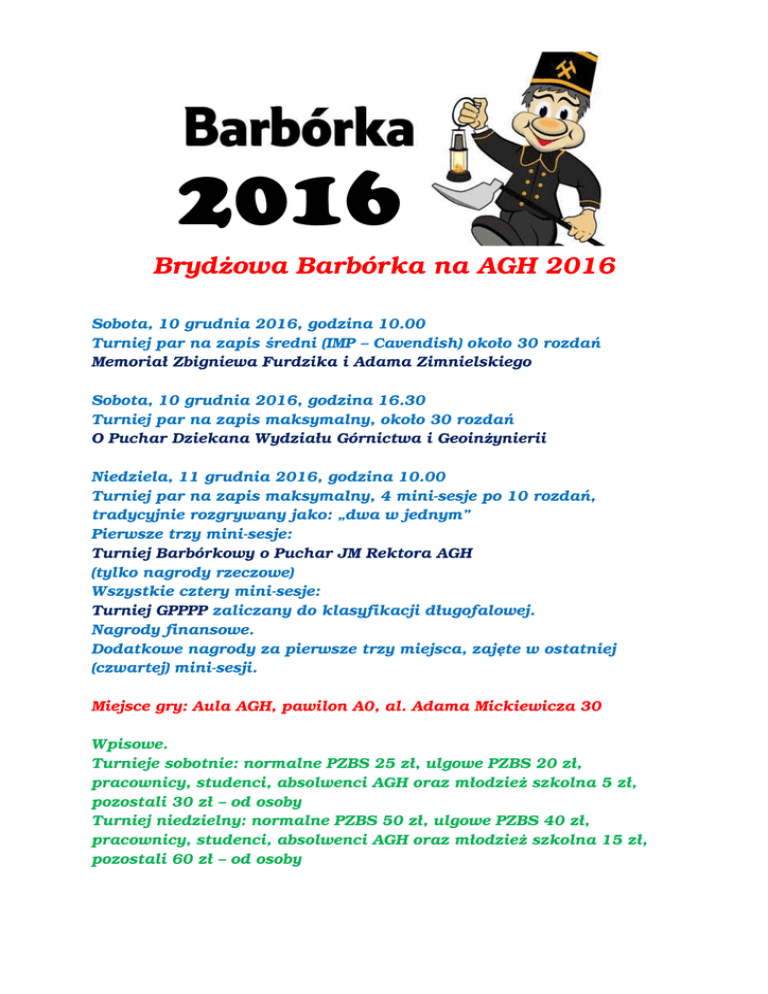 2016 Brydżowa Barbórka na AGH 2016 Sobota, 10 grudnia 2016, godzina 10.00 Turniej par na zapis średni (IMP – Cavendish) około 30 rozdań Memoriał Zbigniewa Furdzika i Adama Zimnielskiego Sobota, 10 grudnia 2016, godzina 16.30 Turniej par na zapis maksymalny, około 30 rozdań O Puchar Dziekana Wydziału Górnictwa i Geoinżynierii Niedziela, 11 grudnia 2016, godzina 10.00 Turniej par na zapis maksymalny, 4 mini-sesje po 10 rozdań, tradycyjnie rozgrywany jako: „dwa w jednym” Pierwsze trzy mini-sesje: Turniej Barbórkowy o Puchar JM Rektora AGH (tylko nagrody rzeczowe) Wszystkie cztery mini-sesje: Turniej GPPPP zaliczany do klasyfikacji długofalowej. Nagrody finansowe. Dodatkowe nagrody za pierwsze trzy miejsca, zajęte w ostatniej (czwartej) mini-sesji. Miejsce gry: Aula AGH, pawilon A0, al. Adama Mickiewicza 30 Wpisowe. Turnieje sobotnie: normalne PZBS 25 zł, ulgowe PZBS 20 zł, pracownicy, studenci, absolwenci AGH oraz młodzież szkolna 5 zł, pozostali 30 zł – od osoby Turniej niedzielny: normalne PZBS 50 zł, ulgowe PZBS 40 zł, pracownicy, studenci, absolwenci AGH oraz młodzież szkolna 15 zł, pozostali 60 zł – od osoby