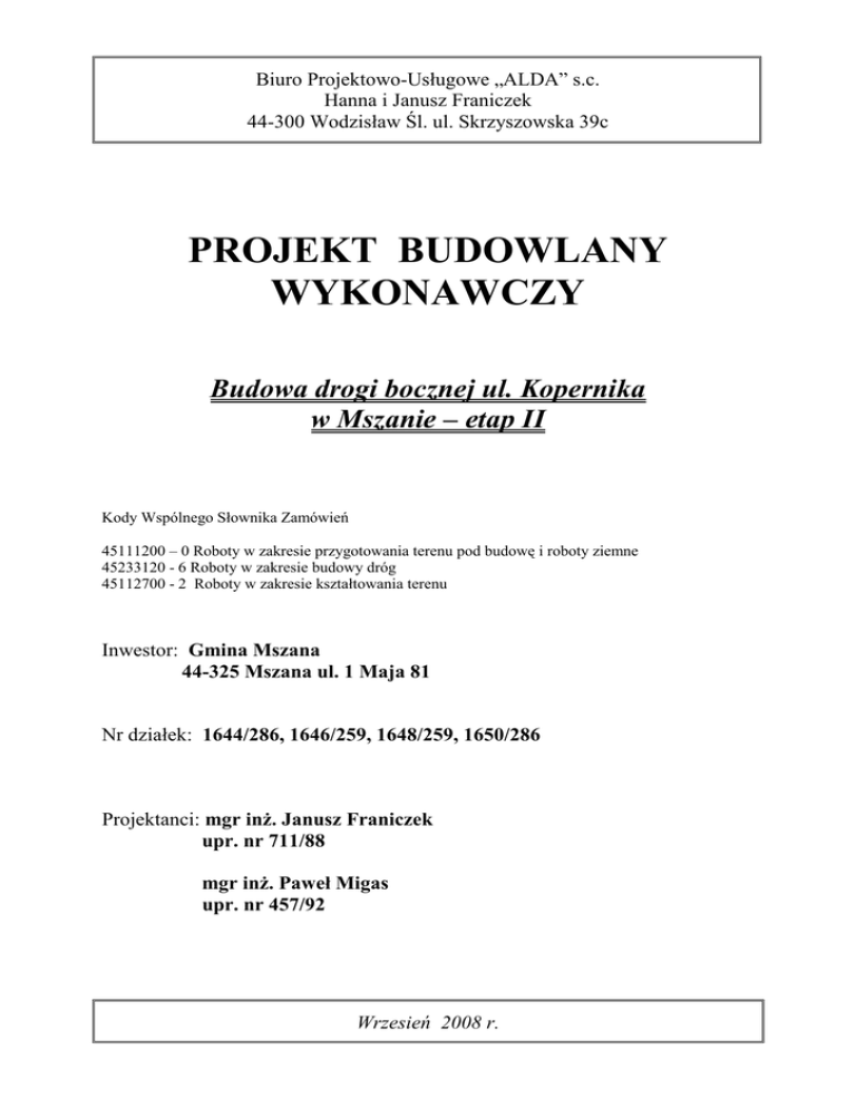 Biuro Projektowo-Usługowe „ALDA” s.c. Hanna i Janusz Franiczek 44-300 Wodzisław Śl. ul. Skrzyszowska 39c PROJEKT BUDOWLANY WYKONAWCZY Budowa drogi bocznej ul. Kopernika w Mszanie – etap II Kody Wspólnego Słownika Zamówień 45111200 – 0 Roboty w zakresie przygotowania terenu pod budowę i roboty ziemne 45233120 - 6 Roboty w zakresie budowy dróg 45112700 - 2 Roboty w zakresie kształtowania terenu Inwestor: Gmina Mszana 44-325 Mszana ul. 1 Maja 81 Nr działek: 1644/286, 1646/259, 1648/259, 1650/286 Projektanci: mgr inŜ. Janusz Franiczek upr. nr 711/88 mgr inŜ. Paweł Migas upr. nr 457/92 Wrzesień 2008 r. SPIS DOKUMENTACJI 1. Część opisowa 1.1 Spis dokumentacji......................................................................................... 1.2 Wypis i wyrys z planu zagospodarowania przestrzennego........................ 1.3 Decyzja o środowiskowych uwarunkowaniach.......................................... 1.4 Plan zagospodarowania terenu..................................................................... 1.5 Informacja z rejestru gruntów...................................................................... 1.6 Opinia OUG w Rybniku............................................................................... 1.7 Uzgodnienia branŜowe................................................................................. 1.8 Oświadczenia, uprawnienia i zaświadczenia o wpisie do izby.................. 1.9 Informacja BIOZ......................................................................................... 1.10 Opis techniczny.......................................................................................... 2. Część rysunkowa 2.1 Mapa orientacyjna – rys. nr 1..................................................................... 2.2 Plan sytuacyny – rys. nr 2........................................................................... 2.3 Profil podłuŜny ulicy – rys. nr 3................................................................ 2.4 Przekroje poprzeczne – rys. nr 4................................................................ 2.5 Przekroje poprzeczne – rys. nr 5................................................................ 2.6 Przekroje poprzeczne – rys. nr 6................................................................ 2.7 Przekroje poprzeczne – rys. nr 7................................................................ 2.8 Przekroje poprzeczne – rys. nr 8............................................................... 2.9 Przekroje poprzeczne – rys. nr 9............................................................... 2.10 Przekroje poprzeczne – rys. nr 10............................................................. 2.11 Przekroje poprzeczne – rys. nr 11............................................................. 2.12 Przekroje poprzeczne – rys. nr 12............................................................. OPIS TECHNICZNY 1. Podstawa opracowania. Podstawą opracowania jest umowa zawarta z Zamawiającym tj. Gminą Mszana oraz: • Rozporządzenie Ministra Transportu i Gospodarki Morskiej z dn. 2 marca 1999r, • Dane wyjściowe do projektowania omówione z Inwestorem, • Podkłady mapowe uzyskane z Biura geodezyjnego, • Własne pomiary oraz przeprowadzone wizje lokalne. 2. Cel i zakres opracowania. Celem opracowania jest zaprojektowanie budowy drugiego odcinka drogi boczej ul. Kopernika w miejscowości Mszana. Projekt jest kontynuacją opracowania „Budowa drogi bocznej ul.Kopernika w Mszanie – etap I.” Opracowywana droga jest drogą gminną. Długość budowanego odcinka drogi (etap II) wynosi 337,62 m. Łączna długość drogi (I i II etap wynosi 578,43m). Początek opracowania znajduje się w miejscu zakończenia opracowania etapu I tj. 240,81m od początku opracowania etapu I.. Opracowanie kończy się na skrzyŜowaniu opracowywanej drogi z ulicą Mickiewicza. W zakres opracowania wchodzi równieŜ powierzchniowe odwodnienie nawierzchni drogi. 3. Opis stanu istniejącego. Obecnie opracowywany odcinek jest drogą gruntową o szerokości 3,00 m. Na rozpatrywanym terenie nie ma kanalizacji deszczowej. Woda opadowa i roztopowa spływa na sąsiadujące łąki i pola. Na końcowym odcinku drogi istnieją obustronne ogrodzenia posesji z siatki ogrodzeniowej na słupkach stalowych . Opracowywany odcinek drogi łączy się z ul. Mickiewicza, będącą w zarządzaniu przez Gminę Mszana. 4. Inwentaryzacja zieleni W pasie drogowym przeznaczonym do budowy ciągu pieszo-jezdnego nie ma drzewostanu kolidującego z pracami projektowymi. Dlatego teŜ nie ma potrzeby wykonania inwentaryzacji zieleni. 5.Warunki gruntowo-wodne Przeprowadzono wykopy kontrolne w czerwcu 2008r. na podstawie których stwierdzono proste warunki gruntowe wyraŜające się występowaniem takich gruntów jak czarnoziem, glina piaszczysta czy iły w jednorodnych warstwach równoległych do powierzchni terenu. Do głębokości 1,0 m nie stwierdzono występowania wód gruntowych, natomiast ze względu na ukształtowanie terenu, następuje średni spływ wód powierzchniowych. Ogólnie naleŜy przyjąć 2 kategorię geotechniczną. 6. Charakterystyka stanu projektowanego. 6.1. Plan zagospodarowania. Zaprojektowano budowę odcinka drogi bocznej ul. Kopernika jako jednojezdniowy ciąg pieszo jezdny (zgodnie z planem zagospodarowania przestrzennego-KX). Nawierzchnia jezdni została przewidziana o kategorii ruchu KR3. Szerokość projektowanej drogi wynosi 5,00 m. Włączenie projektowanego odcinka drogi do ul. Mickiewicza zaprojektowano jako skrzyŜowanie zwykłe. Spadki podłuŜne niwelety projektowanej drogi mieszczą się w granicach od 1,0% do 11,5%. Przy włączeniu ulicy do drogi gminnej spadek podłuŜny wynosi 3 %. Spadek poprzeczny drogi jest jednostronny o wartości 2 %, uwzględniający charakterystykę terenu. Na początkowym odcinku drogi nachylenie jezdni jest skierowane w kierunku zachodnim do projektowanego wodościeku. Na dalszym odcinku