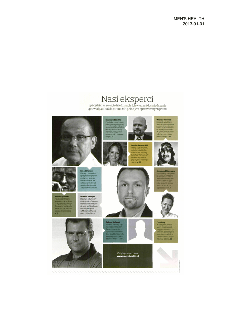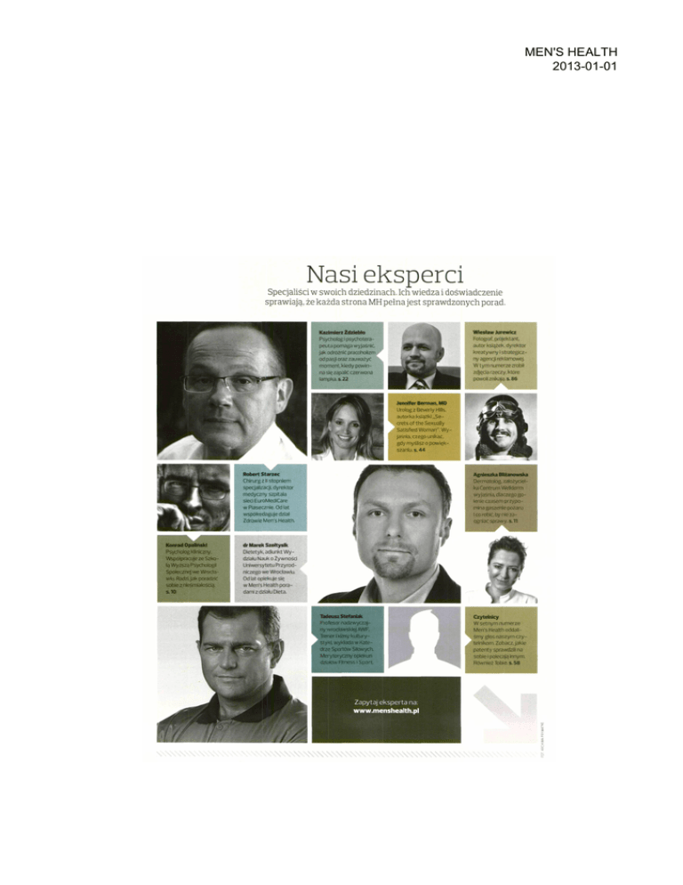 MEN'S HEALTH 2013-01-01 Nasi eksperci Specjaliści w swoich dziedzinach, Ich wiedza i doświadczenie sprawiają, że każda strona MH pełna jest sprawdzonych porad. Jurewicz Fotograf, projektant, autor książek, dyrektor kreatywny i strategicz ny agencji reklamowej. ejW tym numerze zrobił zdjęcia rzeczy, które owoll znikają, s. 86 Kazimierz Żdzlebło Psycholog i psychotera peuta pomaga wyjaśnić, jak odróżnić pracoholizm od pasji oraz zauważyć moment, kiedy powin na się zapalić czerwona lampka, s. 22 Jennlfer Berman, MD Urolog z Beverly Hills, autorka książki „SecretsoftheSexually Satisfied Woman". Wy jaśnia, czego unikać, gdy myślisz o powięk szaniu, s. 44 Robert Starzec Chirurg z II stopniem specjalizacji, dyrektor medyczny szpitala sieci EuroMediCare w Piasecznie. Od lat współredaguje dział Zdrowie Men's Health. Konrad Opaliński Psycholog kliniczny. Współpracuje ze Szko ta Wyższa Psychologii Społecznej we Wrocła wiu. Radzi, jak poradzić sobie z nieśmiałością. s.10 Agnieszka Bllżanowska Dermatolog, założyciel ka Centrum Wellderm wyjaśnia, dlaczego go lenie czasem przypo mina gaszenie pożaru i co robić, by nie za ogniać sprawy, s. 11 dr Marek Szołtysik Dietetyk, adiunkt Wy działu Nauk o Żywności Uniwersytetu Przyrod niczego we Wrocławiu. Od lat opiekuje się w Men's Health pora dami z działu Dieta. Tadeusz Stefaniak Profesor nadzwyczaj ny wrocławskiej AWF. Trener I klasy kultury styki, wykłada w Kate drze Sportów Sitowych, Merytoryczny opiekun działów Fitness i Sport. elnicy W setnym numerze Men's Health oddali śmy głos naszym czy telnikom. Zobacz, jakie patenty sprawdzili na sobie i polecają Innym. Również Tobie. s. 58 Zapytaj eksperta na; www.menshealth.pl \\\\\\\\\\\\ \\\\\\\\\\\\\\\\\\\\\\\\\\\^ I