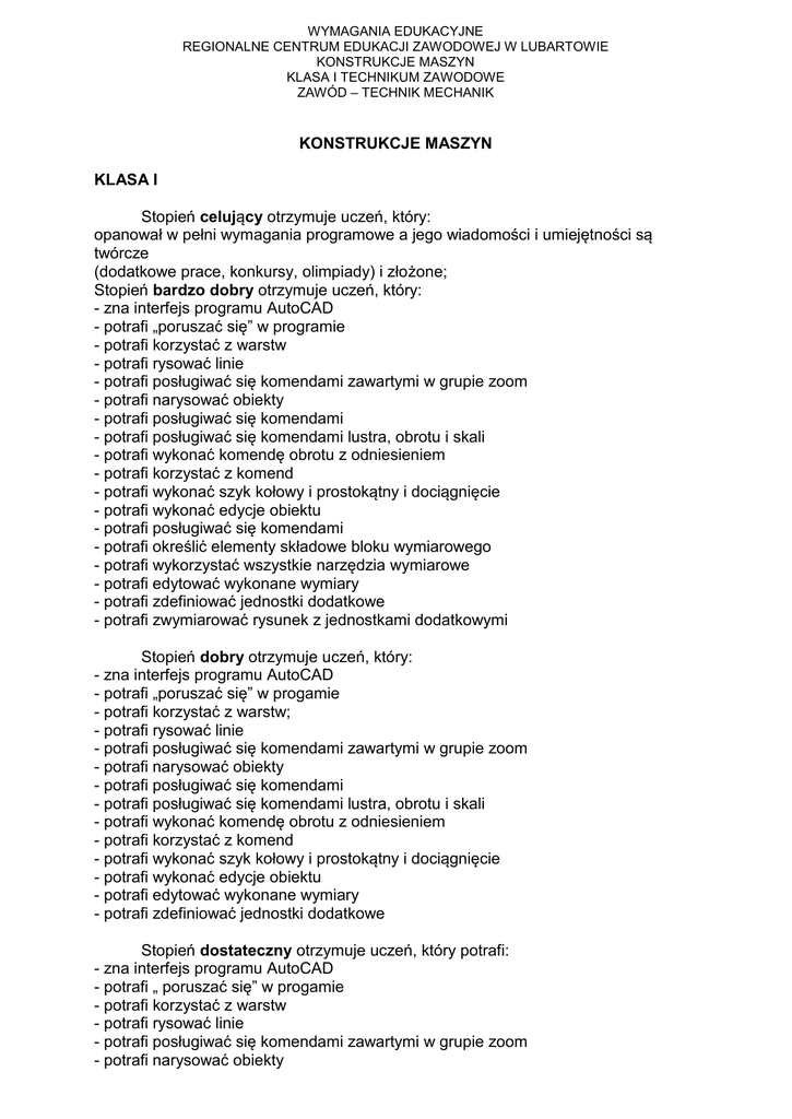 WYMAGANIA EDUKACYJNE REGIONALNE CENTRUM EDUKACJI ZAWODOWEJ W LUBARTOWIE KONSTRUKCJE MASZYN KLASA I TECHNIKUM ZAWODOWE ZAWÓD – TECHNIK MECHANIK KONSTRUKCJE MASZYN KLASA I Stopień celujący otrzymuje uczeń, który: opanował w pełni wymagania programowe a jego wiadomości i umiejętności są twórcze (dodatkowe prace, konkursy, olimpiady) i złożone; Stopień bardzo dobry otrzymuje uczeń, który: - zna interfejs programu AutoCAD - potrafi „poruszać się” w programie - potrafi korzystać z warstw - potrafi rysować linie - potrafi posługiwać się komendami zawartymi w grupie zoom - potrafi narysować obiekty - potrafi posługiwać się komendami - potrafi posługiwać się komendami lustra, obrotu i skali - potrafi wykonać komendę obrotu z odniesieniem - potrafi korzystać z komend - potrafi wykonać szyk kołowy i prostokątny i dociągnięcie - potrafi wykonać edycje obiektu - potrafi posługiwać się komendami - potrafi określić elementy składowe bloku wymiarowego - potrafi wykorzystać wszystkie narzędzia wymiarowe - potrafi edytować wykonane wymiary - potrafi zdefiniować jednostki dodatkowe - potrafi zwymiarować rysunek z jednostkami dodatkowymi Stopień dobry otrzymuje uczeń, który: - zna interfejs programu AutoCAD - potrafi „poruszać się” w progamie - potrafi korzystać z warstw; - potrafi rysować linie - potrafi posługiwać się komendami zawartymi w grupie zoom - potrafi narysować obiekty - potrafi posługiwać się komendami - potrafi posługiwać się komendami lustra, obrotu i skali - potrafi wykonać komendę obrotu z odniesieniem - potrafi korzystać z komend - potrafi wykonać szyk kołowy i prostokątny i dociągnięcie - potrafi wykonać edycje obiektu - potrafi edytować wykonane wymiary - potrafi zdefiniować jednostki dodatkowe Stopień dostateczny otrzymuje uczeń, który potrafi: - zna interfejs programu AutoCAD - potrafi „ poruszać się” w progamie - potrafi korzystać z warstw - potrafi rysować linie - potrafi posługiwać się komendami zawartymi w grupie zoom - potrafi narysować obiekty WYMAGANIA EDUKACYJNE REGIONALNE CENTRUM EDUKACJI ZAWODOWEJ W LUBARTOWIE KONSTRUKCJE MASZYN KLASA I TECHNIKUM ZAWODOWE ZAWÓD – TECHNIK MECHANIK - potrafi posługiwać się komendami lustra, obrotu i skali - potrafi wykonać komendę obrotu z odniesieniem - potrafi wykonać szyk kołowy i prostokątny i dociągnięcie - potrafi wykonać edycje obiektu - potrafi edytować wykonane wymiary Stopień dopuszczający otrzymuje uczeń, który potrafi: - zna interfejs programu AutoCAD - potrafi „poruszać się” w programie - potrafi korzystać z warstw - potrafi rysować linie - potrafi posługiwać się komendami zawartymi w grupie zoom - potrafi narysować obiekty Opracował : Jarosław Siwiec