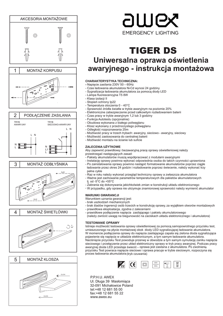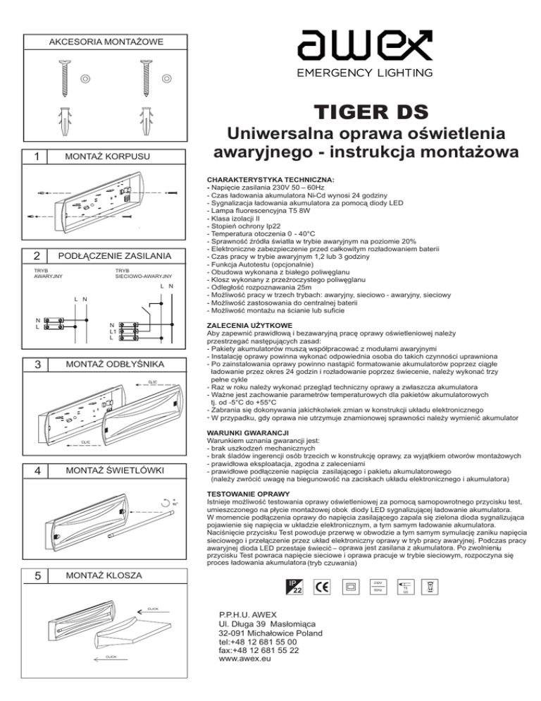 AKCESORIA MONTA¯OWE TIGER DS 1 2 Uniwersalna oprawa oœwietlenia awaryjnego - instrukcja monta¿owa MONTA¯ KORPUSU POD£¥CZENIE ZASILANIA TRYB AWARYJNY TRYB SIECIOWO-AWARYJNY L N L N N L 3 4 N L1 L MONTA¯ ODB£YŒNIKA MONTA¯ ŒWIETLÓWKI CHARAKTERYSTYKA TECHNICZNA: - Napiêcie zasilania 230V 50 – 60Hz - Czas ³adowania akumulatora Ni-Cd wynosi 24 godziny - Sygnalizacja ³adowania akumulatora za pomoc¹ diody LED - Lampa fluorescencyjna T5 8W - Klasa izolacji II - Stopieñ ochrony Ip22 - Temperatura otoczenia 0 - 40°C - Sprawnoœæ Ÿród³a œwiat³a w trybie awaryjnym na poziomie 20% - Elektroniczne zabezpieczenie przed ca³kowitym roz³adowaniem baterii - Czas pracy w trybie awaryjnym 1,2 lub 3 godziny - Funkcja Autotestu (opcjonalnie) - Obudowa wykonana z bia³ego poliwêglanu - Klosz wykonany z przeŸroczystego poliwêglanu - Odleg³oœæ rozpoznawania 25m - Mo¿liwoœæ pracy w trzech trybach: awaryjny, sieciowo - awaryjny, sieciowy - Mo¿liwoœæ zastosowania do centralnej baterii - Mo¿liwoœæ monta¿u na œcianie lub suficie ZALECENIA U¯YTKOWE Aby zapewniæ prawid³ow¹ i bezawaryjn¹ pracê oprawy oœwietleniowej nale¿y przestrzegaæ nastêpuj¹cych zasad: - Pakiety akumulatorów musz¹ wspó³pracowaæ z modu³ami awaryjnymi - Instalacjê oprawy powinna wykonaæ odpowiednia osoba do takich czynnoœci uprawniona - Po zainstalowania oprawy powinno nast¹piæ formatowanie akumulatorów poprzez ci¹g³e ³adowanie przez okres 24 godzin i roz³adowanie poprzez œwiecenie, nale¿y wykonaæ trzy pe³ne cykle - Raz w roku nale¿y wykonaæ przegl¹d techniczny oprawy a zw³aszcza akumulatora - Wa¿ne jest zachowanie parametrów temperaturowych dla pakietów akumulatorowych tj. od -5°C do +55°C - Zabrania siê dokonywania jakichkolwiek zmian w konstrukcji uk³adu elektronicznego - W przypadku, gdy oprawa nie utrzymuje znamionowej sprawnoœci nale¿y wymieniæ akumulator WARUNKI GWARANCJI Warunkiem uznania gwarancji jest: - brak uszkodzeñ mechanicznych - brak œladów ingerencji osób trzecich w konstrukcjê oprawy, za wyj¹tkiem otworów monta¿owych - prawid³owa eksploatacja, zgodna z zaleceniami - prawid³owe pod³¹czenie napiêcia zasilaj¹cego i pakietu akumulatorowego (nale¿y zwróciæ uwagê na biegunowoœæ na zaciskach uk³adu elektronicznego i akumulatora) TESTOWANIE OPRAWY Istnieje mo¿liwoœæ testowania oprawy oœwietleniowej za pomoc¹ samopowrotnego przycisku test, umieszczonego na p³ycie monta¿owej obok diody LED sygnalizuj¹cej ³adowanie akumulatora. W momencie pod³¹czenia oprawy do napiêcia zasilaj¹cego zapala siê zielona dioda sygnalizuj¹ca pojawienie siê napiêcia w uk³adzie elektronicznym, a tym samym ³adowanie akumulatora. Naciœniêcie przycisku Test powoduje przerwê w obwodzie a tym samym symulacjê zaniku napiêcia sieciowego i prze³¹czenie przez uk³ad elektroniczny oprawy w tryb pracy awaryjnej. Podczas pracy awaryjnej dioda LED przestaje œwieciæ – oprawa jest zasilana z akumulatora. Po zwolnieniu przycisku Test powraca napiêcie sieciowe i oprawa pracuje w trybie sieciowym, rozpoczyna siê proces ³adowania akumulatora (tryb czuwania). 5 MONTA¯ KLOSZA IP 22 CLICK CLICK P.P.H.U. AWEX Ul. D³uga 39 Mas³omi¹ca 32-091 Micha³owice Poland tel:+48 12 681 55 00 fax:+48 12 681 55 22 www.awex.eu 230V 50Hz T5 G5