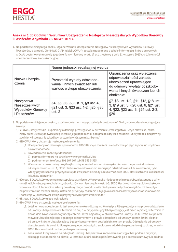 Infolinia 801 107 107*, 58 555 5 555 * opłata za połączenie zgodna z cennikiem operatora www.ergohestia.pl Aneks nr 1 do Ogólnych Warunków Ubezpieczenia Następstw Nieszczęśliwych Wypadków Kierowcy i Pasażerów, o symbolu CB-NNWK-01/14 1. Na podstawie niniejszego aneksu Ogólne Warunki Ubezpieczenia Następstw Nieszczęśliwych Wypadków Kierowcy i Pasażerów, o symbolu CB-NNWK-01/14 (dalej: „OWU”), zostają uzupełnione o tabelę informującą, które z zawartych w OWU postanowień regulują zagadnienia wymienione w art. 17 ust. 1 ustawy z dnia 11 września 2015 r. o działalności ubezpieczeniowej i reasekuracyjnej: Numer jednostki redakcyjnej wzorca Nazwa ubezpieczenia Następstwa Nieszczęśliwych Wypadków Kierowcy i Pasażerów Przesłanki wypłaty odszkodowania i innych świadczeń lub wartość wykupu ubezpieczenia: Ograniczenia oraz wyłączenia odpowiedzialności zakładu ubezpieczeń uprawniające do odmowy wypłaty odszkodowania i innych świadczeń lub ich obniżenia: §4, §5, §6, §8 ust. 1, §8 ust. 4, §21 ust. 3, §23 ust. 1-2, §25, §30 ust. 2 §7, §8 ust. 1-2, §11, §12, §18 ust. 3, §19 ust. 3, §20 ust. 6, §21 ust. 4, §22, §23 ust. 3, §24 ust. 2-3, §29 2. Na podstawie niniejszego aneksu, z zachowaniem w mocy pozostałych postanowień OWU, wprowadza się następujące zmiany: 1) §3 OWU, który zostaje uzupełniony o definicję przestępstwa w brzmieniu: „Przestępstwo – czyn człowieka, zabroniony przez ustawę obowiązującą w czasie jego popełnienia, pod groźbą kary jako zbrodnia lub występek, bezprawny, zawiniony i społecznie szkodliwy, w stopniu wyższym niż znikomy.” 2) §19 OWU, który otrzymuje następujące brzmienie: „1. Ubezpieczony ma obowiązek powiadomić ERGO Hestię o zdarzeniu niezwłocznie po jego zajściu lub uzyskaniu o nim wiadomości. 2. Powiadomienie może być dokonane: 1) poprzez formularz na stronie: www.ergohestia.pl, lub 2) pod numerem telefonu: 801 107 107 lub 58 555 5 555. 3. W razie naruszenia z winy umyślnej lub rażącego niedbalstwa obowiązku niezwłocznego zawiadomienia, o którym mowa w ust. 1, ERGO Hestia może odpowiednio zmniejszyć odszkodowanie lub świadczenie, tylko wtedy gdy naruszenie przyczyniło się do zwiększenia szkody lub uniemożliwiło ERGO Hestii ustalenie okoliczności i skutków zdarzenia.” 3) §20 ust. 6 OWU, który otrzymuje następujące brzmienie: „W przypadku niedopełnienia przez Ubezpieczonego z winy umyślnej lub rażącego niedbalstwa, obowiązków wymienionych w ust. 1–3, ERGO Hestia odmówi wypłaty odszkodowania w całości lub części za szkodę powstałą z tego powodu – o ile niedopełnienie tych obowiązków miało wpływ na powstanie lub rozmiar szkody, ustalenie przyczyny zdarzenia lub jego okoliczności oraz wysokości odszkodowania i pozostaje w jakimkolwiek związku przyczynowym z powstałą szkodą.” 4) §31 ust. 3 OWU, który ulega wykreśleniu 5) §34 OWU, który otrzymuje następujące brzmienie: „1. Jeżeli umowa ubezpieczenia jest zawarta na okres dłuższy niż 6 miesięcy, Ubezpieczający ma prawo odstąpienia od umowy ubezpieczenia w terminie 30 dni, a w przypadku gdy Ubezpieczający jest przedsiębiorcą, w terminie 7 dni od dnia zawarcia umowy ubezpieczenia. Jeżeli najpóźniej w chwili zawarcia umowy ERGO Hestia nie poinformowała Ubezpieczającego będącego konsumentem o prawie odstąpienia od umowy, termin 30 dni biegnie od dnia, w którym Ubezpieczający będący konsumentem dowiedział się o tym prawie. Odstąpienie od umowy ubezpieczenia nie zwalnia Ubezpieczającego z obowiązku zapłacenia składki ubezpieczeniowej za okres, w jakim ERGO Hestia udzielała ochrony ubezpieczeniowej. 2. Konsument, który zawarł na odległość umowę ubezpieczenia, może od niej odstąpić bez podania przyczyn, składając oświadczenie na piśmie, w terminie 30 dni od dnia poinformowania go o zawarciu umowy lub od dnia A/KM/OW022/1405 1 Infolinia 801 107 107*, 58 555 5 555 * opłata za połączenie zgodna z cennikiem operatora www.ergohestia.pl potwierdzenia informacji, o których mowa w art. 39 ust. 1 ustawy z dnia 30 maja 2014 roku o prawach konsumenta, o ile jest termin późniejszy. Termin uważa się za zachowany, jeżeli przed jego upływem oświadczenie zostało wysłane. 3. Odstąpienie od umowy ubezpieczenia nie zwalnia Ubezpieczającego z obowiązku zapłaty składki za okres, w którym ERGO Hestia udzielała ochrony ubezpieczeniowej. 4. Ubezpieczający może złożyć odstąpienie w sposób określony w §38. 5. Ubezpieczający może w każdym czasie wypowiedzieć umowę ubezpieczenia ze skutkiem natychmiastowym. 6. W razie zbycia pojazdu wskazanego w umowie ubezpieczenia, prawa z umowy ubezpieczenia mogą być przeniesione na nabywcę przedmiotu ubezpieczenia. Przeniesienie tych praw wymaga zgody ERGO Hestii. 7. W razie przeniesienia praw, o których mowa w ust. 6, na nabywcę przedmiotu przechodzą także obowiązki, które ciążyły na zbywcy. Pomimo przejścia obowiązków zbywca odpowiada solidarnie z nabywcą za zapłatę składki przypadającej za czas do chwili przejścia przedmiotu ubezpieczenia na nabywcę. 8. Jeżeli prawa, o których mowa w ust. 6, nie zostały przeniesione na nabywcę przedmiotu ubezpieczenia, stosunek ubezpieczenia ulega rozwiązaniu z chwilą przejścia przedmiotu ubezpieczenia na nabywcę. 9. W przypadku przeniesienia własności pojazdu: 1) z leasingodawcy na leasingobiorcę, 2) z banku na kredytobiorcę, umowa ubezpieczenia nie ulega rozwiązaniu, po przeniesieniu własności pojazdu Ubezpieczający ma możliwość wypowiedzenia umowy ubezpieczenia ze skutkiem na dzień doręczenia ERGO Hestii oświadczenia Ubezpieczającego. 10. Przepisów ust. 6 – 8 nie stosuje się przy przenoszeniu wierzytelności, jakie powstały lub mogą powstać wskutek zajścia przewidzianego w umowie ubezpieczenia wypadku (np. odszkodowanie).” 6) §36 OWU, który otrzymuje następujące brzmienie: „1. pow