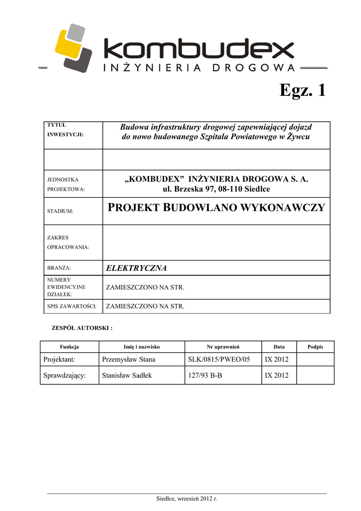 Egz. 1 TYTUŁ Budowa infrastruktury drogowej zapewniającej dojazd do nowo budowanego Szpitala Powiatowego w Żywcu INWESTYCJI: „KOMBUDEX” INŻYNIERIA DROGOWA S. A. ul. Brzeska 97, 08-110 Siedlce JEDNOSTKA PROJEKTOWA: STADIUM: PROJEKT BUDOWLANO WYKONAWCZY ZAKRES OPRACOWANIA: BRANŻA: ELEKTRYCZNA NUMERY EWIDENCYJNE DZIAŁEK: ZAMIESZCZONO NA STR. SPIS ZAWARTOŚCI: ZAMIESZCZONO NA STR. ZESPÓŁ AUTORSKI : Funkcja Imię i nazwisko Nr uprawnień Data Projektant: Przemysław Stana SLK/0815/PWEO/05 IX 2012 Sprawdzający: Stanisław Sadłek 127/93 B-B IX 2012 Siedlce, wrzesień 2012 r. Podpis TOM 2 - PROJEKT ARCHITEKTONICZNO-BUDOWLANY - CZĘŚĆ DROGOWA OŚWIADCZENIE Przedmiotowa dokumentacja projektowa Budowa infrastruktury drogowej zapewniającej dojazd do nowobudowanego Szpitala Powiatowego w Żywcu jest wykonana zgodnie z umową, obowiązującymi przepisami techniczno – budowlanymi oraz normami i jest kompletna z punktu widzenia celu któremu ma służyć „KOMBUDEX” INŻYNIERIA DROGOWA S. A.- 08-110 Siedlce, ul. Brzeska 97, tel./fax 25-63-238-50;25- 63-279-06 2 TOM 2 - PROJEKT ARCHITEKTONICZNO-BUDOWLANY - CZĘŚĆ DROGOWA ZAWARTOŚĆ OPRACOWANIA 1. Opis techniczny 2. Rysunki • nr 1 plan zagospodarowania droga powiatowa • nr 2 plan zagospodarowania droga gminna 3. Informacja dotycząca bezpieczeństwa i ochrony zdrowia „KOMBUDEX” INŻYNIERIA DROGOWA S. A.- 08-110 Siedlce, ul. Brzeska 97, tel./fax 25-63-238-50;25- 63-279-06 3 TOM 2 - PROJEKT ARCHITEKTONICZNO-BUDOWLANY - CZĘŚĆ DROGOWA 4 OPIS TECHNICZNY 1 Podstawa opracowania: – – – – – zlecenie i wytyczne Inwestora na wykonanie opracowania. rysunki budowlane. warunki przebudowy urządzeń własności TAURON S.A. obowiązujące przepisy, normy i katalogi. wizja lokalna w terenie. 2 Zakres opracowania: Opracowanie niniejsze obejmuje projekt budowy oświetlenia ulicznego, wraz z przebudową urządzeń TAURON S.A, kolidujących z projektowaną budową drogi dojazdowej do Szpitala 3 Stan istniejący: Istniejąca stacja transformatorowa słupowa15/0,4 kV S-720 Żywiec Sporysz Isep, zasilana z linii napowietrznej 15kV w układzie trójkątnym, kolidująca z projektowaną drogą. Istniejące wyprowadzenie obwodów nn i oświetlenia ulicznego kolidujące z projektowaną drogą. 4 Oświetlenie uliczne Dla projektowanej drogi dojazdowej wraz z rondem przyjęto klasę oświetleniową CE2. W związku z tym należy zapewnić natężenie oświetlenia Imin=20lx. Oświetlenie włączone zostanie w sieć oświetlenia dróg miejskich w Żywcu. Zasilanie należy wyprowadzić ze stacji transformatorowej S-720 Sporysz Isep. Stacja posiada punkt zapalania oświetlenia. Zasilanie latarni należy wykonać linią kablową YAKXS 4x35 ułożoną w projektowanym chodniku lub poboczu projektowanej drogi, chronioną na całej długości rurą DVKØ110. Na całej długości linii, we wspólnym wykopie należy ułożyć bednarkę FeZn 25x4, za pomocą której należy spiąć wszystkie latarnie. Jako latarnie oświetleniowe przewidziano słupy aluminiowe na fundamencie prefabrykowanym. Latarnie należy zabudować bezpośrednio za projektowanym chodnikiem, a w miejscach gdzie chodnik nie jest projektowany, w takiej odległości od drogi, aby pozostała przestrzeń na jego budowę. W centralnym punkcie ronda zabudowana zostanie latarnia z wysięgnikiem umożliwiającym zabudowę trzech opraw. Całość robót należy wykonać zgodnie z N-SEP-E-004, szczegóły przedstawiono na planie zagospodarowania terenu. „KOMBUDEX” INŻYNIERIA DROGOWA S. A.- 08-110 Siedlce, ul. Brzeska 97, tel./fax 25-63-238-50;25- 63-279-06 TOM 2 - PROJEKT ARCHITEKTONICZNO-BUDOWLANY - CZĘŚĆ DROGOWA 5 5 Przebudowa urządzeń TAURON S.A. Zgodnie z warunkami przebudowy nr 06/RD-4/ZS/AW/3930/2012 z dnia 10 VIII 2012r., przebudowie podlegają następujące elementy: – – – – Stacja transformatorowa słupowa S-720 Sporysz Isep. Wyprowadzenie obwodów na istniejącą sieć nn. Wyprowadzenie obwodów na istniejącą siec oświetlenia ulicznego. Linia kablowa nn typu YAKY 4x120 relacji ZK-6704. 5.1 Przebudowa Stacji transformatorowej Istniejącą stacje transformatorową słupową 15/0,4kV S-720 Sporysz Isep, należy zdemontować. W lokalizacji niekolidującej z projektowaną drogą należy zabudować nową stacje transformatorową typu STN24-20/630/I. Stacja powinna umożliwiać zabudowę transformatora o mocy 630kVA oraz zostać wyposażona zgodnie z dołączonym schematem. W szczególności należy zabudować dwie skrzynie stacyjne oraz punkt zapalania oświetlenia. Stacja zasilana będzie z napowietrznej linii 15kV, nieizolowanej, w układzie trójkątnym. Prace należy wykonać zgodnie z: • • • Standardem ENION linia napowietrzna SN – 7/1/B/2009. Standardem ENION stacja transformatorowa słupowa SN/nn – 6/01/B/2009 Normą N SEP 003 elektroenergetyczne linie napowietrzne projektowanie i budowa. 5.2 Przebudowa wyprowadzeń obwodów nn i oświetlenia ulicznego Istniejące wyprowadzenia obwodów, wraz ze słupem Kr-10 zlokalizowanym obok istniejącej stacji, należy zdemontować. Z rozdzielnicy nn, projektowanej stacji transformatorowej należy wyprowadzić następujące obwody: – – – – – – Obwód sieć napowietrzna ul. Isep w stronę Żywca, linia kablowa YAKXS 4x120 + linia oświetlenia ulicznego YAKXS 4x35, do słupa (podlegającego przebudowie) obok budynku nr 114. Obwód sieć napowietrzna ul. Habdasówka, AsXS 4x95 + linia oświetlenia ulicznego AsXS 4x25, do istniejącego słupa obok budynku nr 1. Obwód linia kablowa relacji ZK6704 (ul. Pola Lisickich), YAKXS 4x120 (linia przebudowywana). Obwód linia kablowa YAKY 4x120 relacji ZK7504, linie należy odkopać i wprowadzić do nowej stacji. Obwód linia kablowa YAKY 4x120 oraz YAKY 4x150 relacji Trakpol, linie należy odkopać i wprowadzić do nowej stacji. Obwód linia kablowa oświetlenia ulicznego ul. Isep w kierunku Trzebini YAKXS 4x35. Szczegóły pokazane Prace należy wykonać zgodnie z: