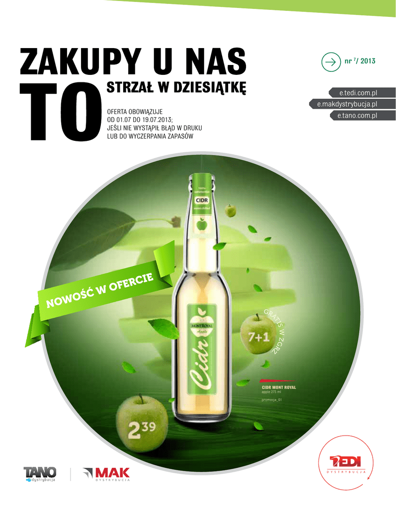 nr 7/ 2013 e.tedi.com.pl e.makdystrybucja.pl e.tano.com.pl OFERTA OBOWIĄZUJE OD 01.07 DO 19.07.2013; JEŚLI NIE WYSTĄPIŁ BŁĄD W DRUKU LUB DO WYCZERPANIA ZAPASÓW gr a ti s w z gr z. ość w o N rcie fe wo cidr MONT ROYAL apple 275 ml promocja_01 Do wyczerpania zapasów 092 229 napoje Tymbark - Jabłko - brzoskwinia - Jabłko - mięta - Jabłko - arbuz - Jabłko - agrest - Pomarańcza - brzoskwinia - Wiśnia - jabłko - Cytryna - mięta - Malina - mięta 0,25 l 121 Tymbark GazowanY promocja_02 Tymbark GazowanY Gazzzowana cytryna 1,5 l - Gazzzowana cytryna - Gazzzowany grejpfrut - Gazzzowana pomarańcza 0,5 l promocja_03 promocja_04 329 197 Aseptic Napoje Tymbark - Jabłko - mięta - Jabłko - brzoskwinia - Jabłko - czerwona porzeczka - Jabłko - białe winogrono - Wiśnia - jabłko - Pomarańcza - brzoskwinia 2l - Jabłko - brzoskwinia - Jabłko - mięta - Pomarańcza - brzoskwinia - Wiśnia - jabłko - Jabłko - czerwona porzeczka - Jabłko - białe winogrono 1l promocja_05 promocja_06a TYMBARK 439 519 519 439 - nektar czerwony grejpfut - nektar pomarańcza - nektar pomarańcza z hiszpańską mandarynką - sok jabłko 2l promocja_06b 179 3 zgrz. Zbyszko 3 - 3 cola&nada 2l gaz - nowość - 3 cytryny gaz 1,5l + 500 ml gratis - 3 pomarańcze gaz 1,5l + 500 ml gratis - 3 limonki gaz 1,5l + 500 ml gratis - 3 czerwone pomarańcze gaz 1,5l + 500 ml gratis - 3 witaminy ace gaz 1,5l + 500 ml gratis - 3 grejpfruty gaz 1,5l + 500 ml gratis - tonik 1,5l + 500 ml gratis - 3 fresch citrus gaz 1,5l + 500ml gratis promocja_07 109 129 Maxer 169 GO citro, cola, oranżada biał, oranżada czerwona, orange 2l promocja_08 go max multifruit, cherry 0,591 l limon, multifruit, cherry 1,5 l promocja_09 promocja_10 8+1 5+1 oranżada YO per 1,25l dodatkowo gratis w zgrz. + Hula Gula Hellena napoje pomarańcza, winogrono, wiśnia, grejpfrut rubinowy, czarna porzeczka, jabłko gruszka, jabłko+mięta, śliwkowa, brzoskwinia - morela, czerwona porzeczka - agrest, n.gaz 1,75 l czerwona, biała, niebieska 1,5 l promocja_11 promocja_12 5+1 Hellena cytryna, pomarańcza, limonka 1,25 l + 3+1 15+1 oranżada YO per 1,25l dodatkowo tonic Hellena 1,25l dodatkowo oranżada Yo oranżada Hellena puszka 0,25 l biała, żółta, czerwona 1,25 l promocja_14 promocja_15 promocja_13 tedi nr 7/ 2013 www.e.tedi.com.pl www.e.makdystrybucja.pl www.e.tano.com.pl + woda Żywiec malina 1,5 l cytryna 0,5l n.gaz promocja_16 5+1 gratis w zgrz. 5+1 2 pakiety na sklep woda Żywiec woda Żywiec - cytryna-mięta „żywioł wody” - czarna porzeczka i żurawina „żywioł ziemi” 0,5 l promocja_17 - cytryna-mięta „żywioł wody” - pomarańcza i imbir „żywioł ognia” - grapefruit „żywioł powietrza” - czarna - porzeczka i żurawina „żywioł ziemi” 1,5 l gaz; n.gaz 0,5 l promocja_18 153 099 Augustowianka wody smakowe cytryna, grejpfrut, jabłko, limetka-mięta, pomarańcza, truskawka gaz i n.gaz 1,5 l promocja_19 181 Augustowianka Augustowianka 078 6+1 Augustowianka Augustowianka wody smakowe cytryna, truskawka gaz i n.gaz 0,5 l woda czysta gaz i n.gaz 1,5 l woda czysta gaz i n.gaz 0,5 l promocja_20 promocja_21 promocja_22 181 Augustowianka kwas chlebowy 1,5 l podpiwek ‚1,5 l promocja_23 promocja_24 173 Cena po rabacie 20% Schweppes tonic; orange; citrus mix; lemon 0,5 l 2 22 Dr Pepper 0,5 l promocja_25 smaki lata dżem brzoskwinia, truskawka, wiśnia 275 g promocja_26a 2 35 smaki lata powidła śliwkowe 300 g 7+1 gratis w zgrz. smaki lata syrop malina, wiśnia promocja_26b promocja_27 tedi nr 7/ 2013 www.e.tedi.com.pl www.e.makdystrybucja.pl www.e.tano.com.pl 18+6 10 zgrz. 20+4 5 zgrz. 22+2 2 zgrz. MPOWER puszka 0,25 l promocja_28 212 10+1 MPOWER butelka 1 l promocja_29 055 napój Twist jabłko, cola, owoce leśne, truskawka, wiśnia 0,2 l promocja_30 super cena pytaj Handlowca 089 mentos Lizak melody pops 15 g mint; 38 g promocja_32 promocja_31 0 65 Fruittella Pixels 16 g promocja_34 109 super cena pytaj Handlowca Fruittella owoc ogród, rainbow, truskawka stick 41g promocja_35 Chupa Chups Lizak - Torba promocja_33 195 0 82 Fruittella żelki misie, serduszka, smoczki, snake xxl, super drinks, zwierzaczki 100 g promocja_37 Fruittella UFO’s 25 g promocja_36 108 Chupa lizak xxl trio display 29 g promocja_38 169 Mentos guma 3d - arbuz-ananas-mel - black-kiwi-straw - enigma - fresh mint - lemon-grapef-oran - trus-jabłko-malina 16 g STAND 5+1x12x16 g promocja_39 095 Big Babol - cola lemon - truskawka - tutti frutti 27.6 g www.e.tedi.com.pl www.e.makdystrybucja.pl www.e.tano.com.pl 065 Mentos Fruittella promocja_41 promocja_42 mini słój 10,5 g promocja_40 tedi nr 7/ 2013 053 mini słój 25 g 969 Lizak serduszka asortyment (100 szt. po 8 g) promocja_43 079 159 345 sos Modnello czosnkowy promocja_55 orzeszki solone; 100 g promocja_51 Landrynki Kriss o smaku owocowym, miętowym i lodowym; 80 g promocja_47 0 42 339 gumy kulki 30 g (10 szt. po 3 g) promocja_44 3 59 339 sos Modnello BBQ (barbecue) promocja_56 orzeszki solone; 150 g promocja_52 BONOMI Savoiardi, Glassate; 200 g promocja_48 0 79 kakaowy, mleczny, orzechowy; 60 g promocja_45 2 49 wafelki MAX Kriss 089 366 sos Modnello PIRI PIRI promocja_57 orzeszki miód i papryka; 150g promocja_53 Rogalik Kriss czekoladowy, karmelowy; 55g promocja_49 049 Filutki 20 g promocja_46 729 459 Nutkao 200 g promocja_54 699 Sok Z Granatu 1l Nutkao 300 g promocja_50 promocja_58 029 5+1 4+1 gratis w zgrz. 5 Coco Jambo 29 lizaki TUBA 180 szt. promocja_79 Coco Jambo szampan brzoskwinia truskawka wiśnia 0.75 l 099 promocja_78 Coco Jambo żelki misie, malinki 80 g promocja_80 5% 209 DODATKOWY RABAT paluszki 137 paluszki solone solone, sezamowe, cebulowe 70 g Puchatek 275g paluszki Natures czekodraże czekodraże-orzech 50 g czosnkowo - ziołowe 70 g promocja_83 promocja_82 promocja_81 prz zakupie 2 zgrz. w dowolnym miksie dadatkowy rabat 4% przy zakupie 4 zgrz. dodatkowo rabat 6% paluszki Junior Ekland 250 g malina, cyrtyna, owoce leśne, wieloowocowy 300 g ekland Junior promocja_84 brzoskw