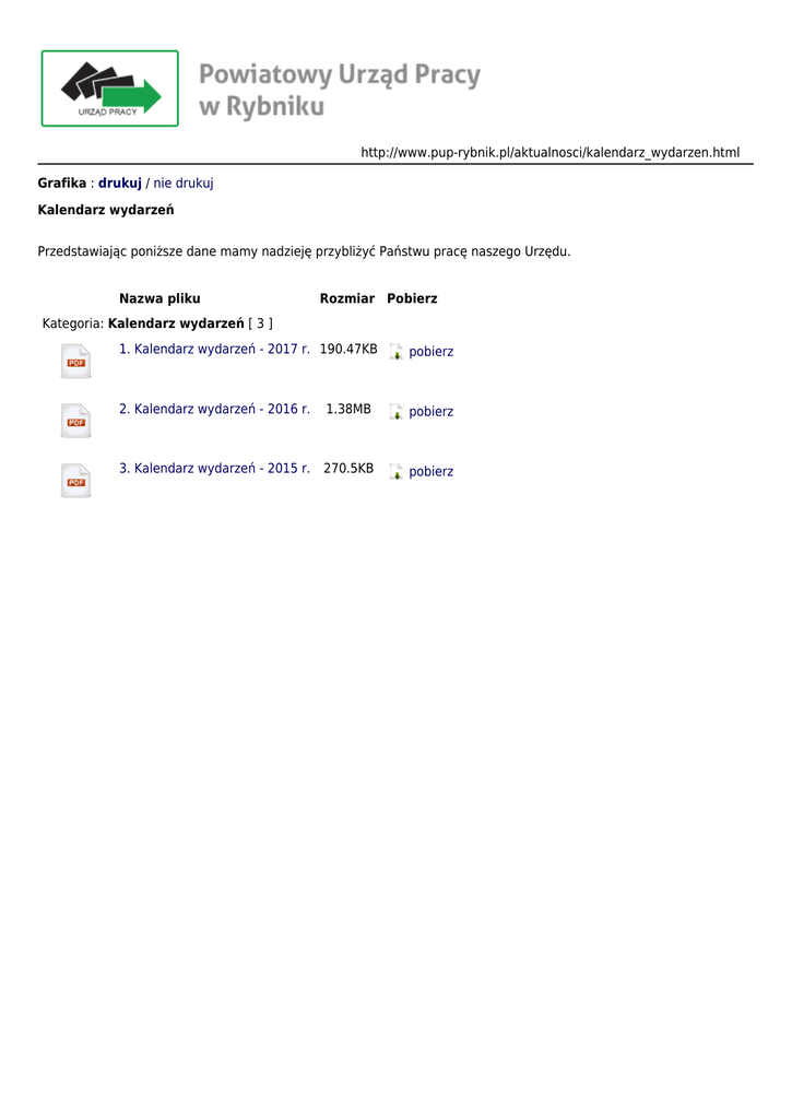 http://www.pup-rybnik.pl/aktualnosci/kalendarz_wydarzen.html Grafika : drukuj / nie drukuj Kalendarz wydarzeń Przedstawiając poniższe dane mamy nadzieję przybliżyć Państwu pracę naszego Urzędu. Nazwa pliku Rozmiar Pobierz Kategoria: Kalendarz wydarzeń [ 3 ] 1. Kalendarz wydarzeń - 2017 r. 190.47KB pobierz 2. Kalendarz wydarzeń - 2016 r. 1.38MB pobierz 3. Kalendarz wydarzeń - 2015 r. 270.5KB pobierz