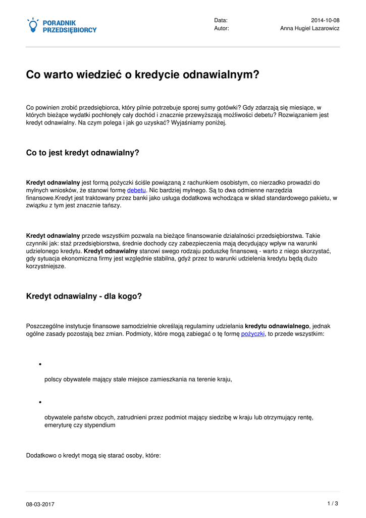 Data: Autor: 2014-10-08 Anna Hugiel Lazarowicz Co warto wiedzieć o kredycie odnawialnym? Co powinien zrobić przedsiębiorca, który pilnie potrzebuje sporej sumy gotówki? Gdy zdarzają się miesiące, w których bieżące wydatki pochłonęły cały dochód i znacznie przewyższają możliwości debetu? Rozwiązaniem jest kredyt odnawialny. Na czym polega i jak go uzyskać? Wyjaśniamy poniżej. Co to jest kredyt odnawialny? Kredyt odnawialny jest formą pożyczki ściśle powiązaną z rachunkiem osobistym, co nierzadko prowadzi do mylnych wniosków, że stanowi formę debetu. Nic bardziej mylnego. Są to dwa odmienne narzędzia finansowe.Kredyt jest traktowany przez banki jako usługa dodatkowa wchodząca w skład standardowego pakietu, w związku z tym jest znacznie tańszy. Kredyt odnawialny przede wszystkim pozwala na bieżące finansowanie działalności przedsiębiorstwa. Takie czynniki jak: staż przedsiębiorstwa, średnie dochody czy zabezpieczenia mają decydujący wpływ na warunki udzielonego kredytu. Kredyt odnawialny stanowi swego rodzaju poduszkę finansową - warto z niego skorzystać, gdy sytuacja ekonomiczna firmy jest względnie stabilna, gdyż przez to warunki udzielenia kredytu będą dużo korzystniejsze. Kredyt odnawialny - dla kogo? Poszczególne instytucje finansowe samodzielnie określają regulaminy udzielania kredytu odnawialnego, jednak ogólne zasady pozostają bez zmian. Podmioty, które mogą zabiegać o tę formę pożyczki, to przede wszystkim: polscy obywatele mający stałe miejsce zamieszkania na terenie kraju, obywatele państw obcych, zatrudnieni przez podmiot mający siedzibę w kraju lub otrzymujący rentę, emeryturę czy stypendium Dodatkowo o kredyt mogą się starać osoby, które: 08-03-2017 1/3 Data: Autor: 2014-10-08 Anna Hugiel Lazarowicz systematycznie zasilają rachunek osobisty środkami z tytułu wynagrodzenia, emerytury bądź renty, posiadają rachunek przez określony czas - przeważnie przez co najmniej 3 miesiące, posiadają zdolność kredytową , które nie spowodowały niedopuszczalnego salda debetowego. Kredyt odnawialny - jak go uzyskać? Kredyt odnawialny z reguły przyznawany jest na rok. W ten sposób można pożyczyć sumę, która jest nawet 8-krotnością miesięcznych wpływów na konto (górny limit zależy od polityki poszczególnych banków). Podpisując umowę z bankiem o udzielenie kredytu odnawialnego, należy przedstawić zaświadczenie o osiąganych dochodach. Większość banków po upływie roku automatycznie przedłuża pożyczkę na kolejny okres (jeżeli kredytobiorca korzystał z niego w sposób regulaminowy). Kredyt odnawialny - zalety Bezsprzeczną zaletą kredytu odnawialnego jest jego wygoda. Po podpisaniu z bankiem umowy kredytowej można wykorzystywać limit wielokrotnie oraz w dowolnym czasie (dogodnym dla przedsiębiorcy). Dodatkowo istotną korzyścią jest koszt kredytu odnawialnego - w przypadku nie wykorzystania w całości przyznanych środków odsetki nie są naliczane. Naliczane są jedynie od rzeczywistego zadłużenia. Poza tym w trakcie korzystania z kredytu odnawialnego banki nie wymagają od klientów każdorazowego udowadniania zdolności kredytowej przy wypłacie gotówki. Kredyt odnawialny - wady 08-03-2017 2/3 Data: Autor: 2014-10-08 Anna Hugiel Lazarowicz Przy podejmowaniu decyzji o ubieganiu się o kredyt odnawialny warto zwrócić uwagę na potencjalne zagrożenia. Przede wszystkim przy korzystaniu z niego należy być czujnym oraz rzetelnym - w przypadku upływu terminu spłaty kredytu banki naliczają odsetki, które mogą wynieść nawet do 30 % kwoty kredytu. Kolejna pułapką, w którą można wpaść, jest traktowanie limitu kredytu odnawialnego jako realnego pieniądza do wydania. W ten sposób potrzeby konsumenckie rosną wraz faktycznymi wydatkami. Zaczyna się wtedy pojawiać sytuacja, gdy kredytobiorca wydaje więcej niż pierwotnie planował, przez co okres spłaty wydłuża się. Więcej na temat kredytów znajdziesz w artykule Kredyt w działalności gospodarczej. © Copyright | Wszystkie prawa zastrzeżone 2006-2017 Web INnovative Software Sp. z o.o., Bolesława Krzywoustego 105/21 51-166 Wrocław, [email protected] KRS 0000342082, NIP 8982167294, Kapitał 60 000zł 08-03-2017 Powered by TCPDF (www.tcpdf.org) 3/3