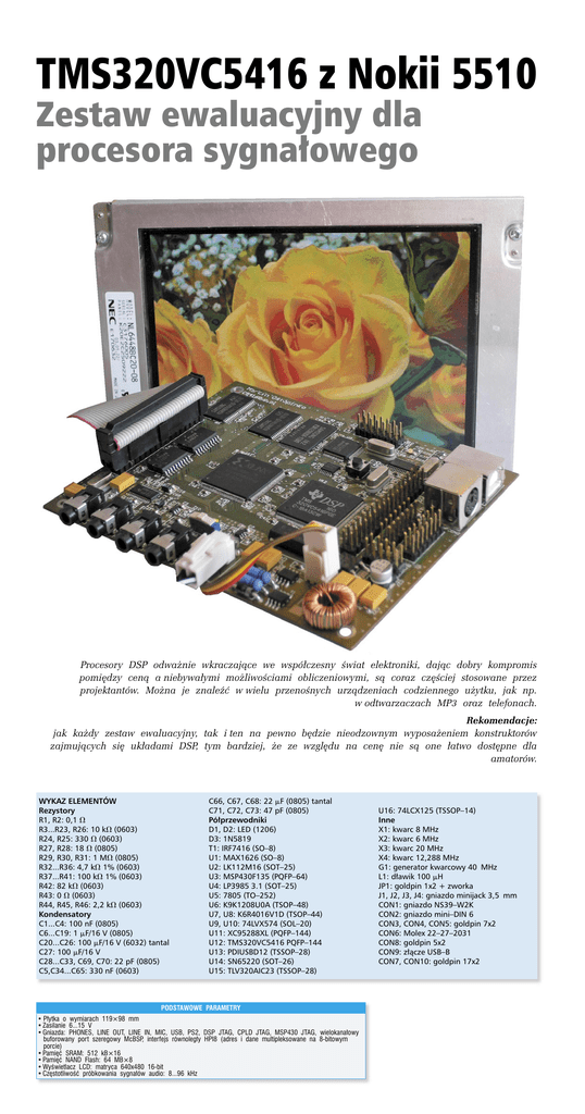 TMS320VC5416 z Nokii 5510 Zestaw ewaluacyjny dla procesora sygnałowego Procesory DSP odważnie wkraczające we współczesny świat elektroniki, dając dobry kompromis pomiędzy ceną a niebywałymi możliwościami obliczeniowymi, są coraz częściej stosowane przez projektantów. Można je znaleźć w wielu przenośnych urządzeniach codziennego użytku, jak np. w odtwarzaczach MP3 oraz telefonach. Rekomendacje: jak każdy zestaw ewaluacyjny, tak i ten na pewno będzie nieodzownym wyposażeniem konstruktorów zajmujących się układami DSP, tym bardziej, że ze względu na cenę nie są one łatwo dostępne dla amatorów. WYKAZ ELEMENTÓW Rezystory R1, R2: 0,1 V R3...R23, R26: 10 kV (0603) R24, R25: 330 V (0603) R27, R28: 18 V (0805) R29, R30, R31: 1 MV (0805) R32...R36: 4,7 kV 1% (0603) R37...R41: 100 kV 1% (0603) R42: 82 kV (0603) R43: 0 V (0603) R44, R45, R46: 2,2 kV (0603) Kondensatory C1...C4: 100 nF (0805) C6...C19: 1 mF/16 V (0805) C20...C26: 100 mF/16 V (6032) tantal C27: 100 mF/16 V C28...C33, C69, C70: 22 pF (0805) C5,C34...C65: 330 nF (0603) C66, C67, C68: 22 mF (0805) tantal C71, C72, C73: 47 pF (0805) Półprzewodniki D1, D2: LED (1206) D3: 1N5819 T1: IRF7416 (SO–8) U1: MAX1626 (SO–8) U2: LK112M16 (SOT–25) U3: MSP430F135 (PQFP–64) U4: LP3985 3.1 (SOT–25) U5: 7805 (TO–252) U6: K9K1208U0A (TSOP–48) U7, U8: K6R4016V1D (TSOP–44) U9, U10: 74LVX574 (SOL–20) U11: XC95288XL (PQFP–144) U12: TMS320VC5416 PQFP–144 U13: PDIUSBD12 (TSSOP–28) U14: SN65220 (SOT–26) U15: TLV320AIC23 (TSSOP–28) PODSTAWOWE PARAMETRY • Płytka o wymiarach 119×98 mm • Zasilanie 6...15 V • Gniazda: PHONES, LINE OUT, LINE IN, MIC, USB, PS2, DSP JTAG, CPLD JTAG, MSP430 JTAG, wielokanałowy buforowany port szeregowy McBSP, interfejs równoległy HPI8 (adres i dane multipleksowane na 8-bitowym porcie) • Pamięć SRAM: 512 kB×16 • Pamięć NAND Flash: 64 MB×8 • Wyświetlacz LCD: matryca 640x480 16-bit • Częstotliwość próbkowania sygnałów audio: 8...96 kHz U16: 74LCX125 (TSSOP–14) Inne X1: kwarc 8 MHz X2: kwarc 6 MHz X3: kwarc 20 MHz X4: kwarc 12,288 MHz G1: generator kwarcowy 40 MHz L1: dławik 100 mH JP1: goldpin 1x2 + zworka J1, J2, J3, J4: gniazdo minijack 3,5 mm CON1: gniazdo NS39–W2K CON2: gniazdo mini–DIN 6 CON3, CON4, CON5: goldpin 7x2 CON6: Molex 22–27–2031 CON8: goldpin 5x2 CON9: złącze USB–B CON7, CON10: goldpin 17x2