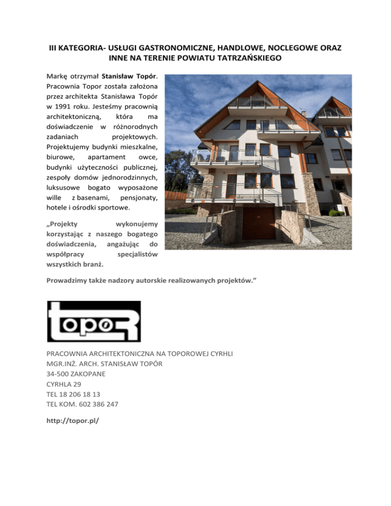 III KATEGORIA- USŁUGI GASTRONOMICZNE, HANDLOWE, NOCLEGOWE ORAZ INNE NA TERENIE POWIATU TATRZAŃSKIEGO Markę otrzymał Stanisław Topór. Pracownia Topor została założona przez architekta Stanisława Topór w 1991 roku. Jesteśmy pracownią architektoniczną, która ma doświadczenie w różnorodnych zadaniach projektowych. Projektujemy budynki mieszkalne, biurowe, apartament owce, budynki użyteczności publicznej, zespoły domów jednorodzinnych, luksusowe bogato wyposażone wille z basenami, pensjonaty, hotele i ośrodki sportowe. „Projekty wykonujemy korzystając z naszego bogatego doświadczenia, angażując do współpracy specjalistów wszystkich branż. Prowadzimy także nadzory autorskie realizowanych projektów.” PRACOWNIA ARCHITEKTONICZNA NA TOPOROWEJ CYRHLI MGR.INŻ. ARCH. STANISŁAW TOPÓR 34-500 ZAKOPANE CYRHLA 29 TEL 18 206 18 13 TEL KOM. 602 386 247 http://topor.pl/