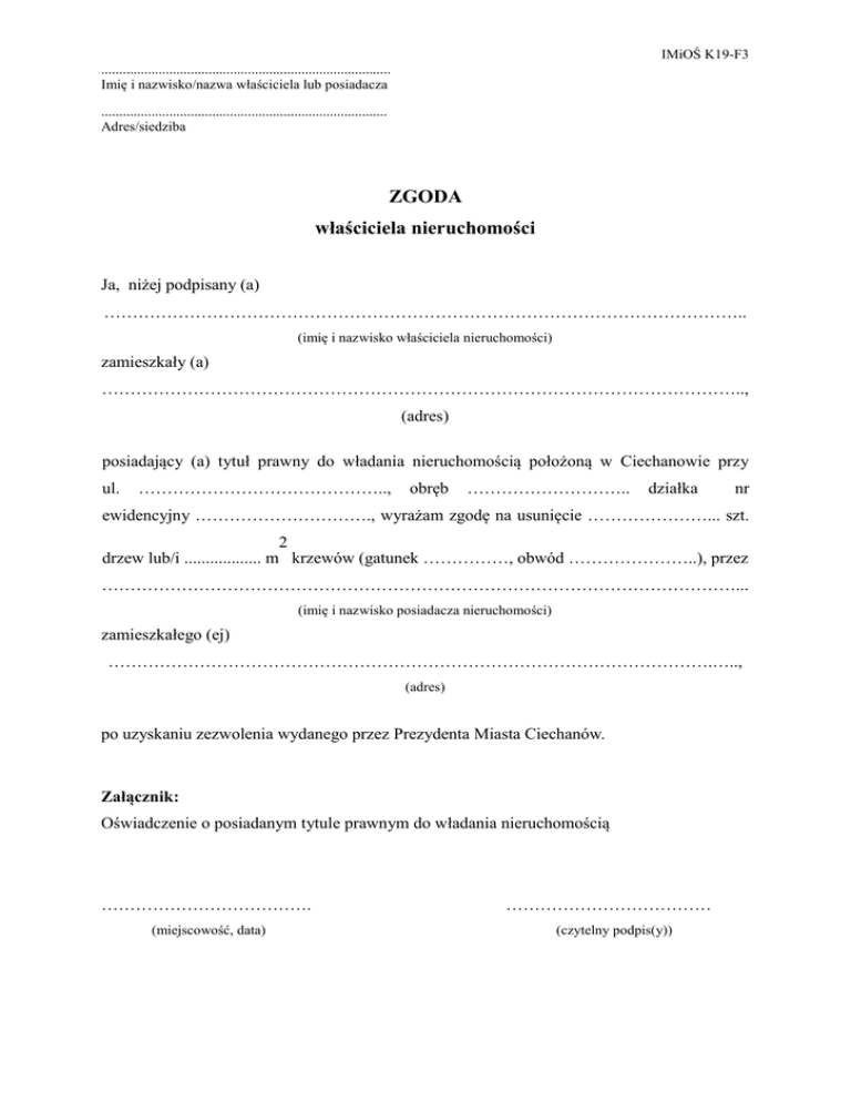 IMiOŚ K19-F3 ................................................................................. Imię i nazwisko/nazwa właściciela lub posiadacza ................................................................................ Adres/siedziba ZGODA właściciela nieruchomości Ja, niżej podpisany (a) ………………………………………………………………………………………………….. (imię i nazwisko właściciela nieruchomości) zamieszkały (a) ………………………………………………………………………………………………….., (adres) posiadający (a) tytuł prawny do władania nieruchomością położoną w Ciechanowie przy ul. …………………………………….., obręb ……………………….. działka nr ewidencyjny …………………………., wyrażam zgodę na usunięcie …………………... szt. 2 drzew lub/i .................. m krzewów (gatunek ……………, obwód …………………..), przez …………………………………………………………………………………………………... (imię i nazwisko posiadacza nieruchomości) zamieszkałego (ej) …………………………………………………………………………………………….….., (adres) po uzyskaniu zezwolenia wydanego przez Prezydenta Miasta Ciechanów. Załącznik: Oświadczenie o posiadanym tytule prawnym do władania nieruchomością ………………………………. (miejscowość, data) ……………………………… (czytelny podpis(y))