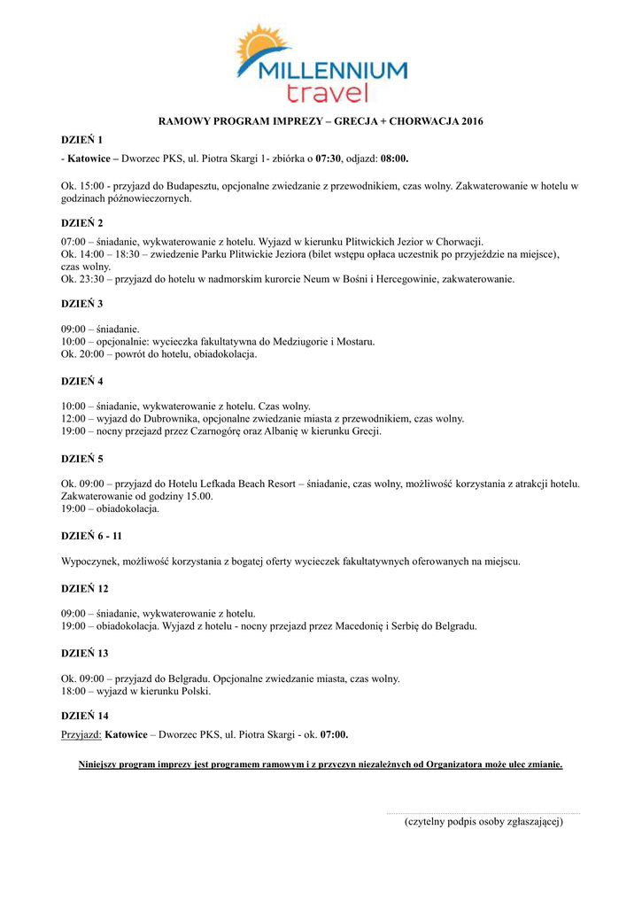 RAMOWY PROGRAM IMPREZY – GRECJA + CHORWACJA 2016 DZIEŃ 1 - Katowice – Dworzec PKS, ul. Piotra Skargi 1- zbiórka o 07:30, odjazd: 08:00. Ok. 15:00 - przyjazd do Budapesztu, opcjonalne zwiedzanie z przewodnikiem, czas wolny. Zakwaterowanie w hotelu w godzinach późnowieczornych. DZIEŃ 2 07:00 – śniadanie, wykwaterowanie z hotelu. Wyjazd w kierunku Plitwickich Jezior w Chorwacji. Ok. 14:00 – 18:30 – zwiedzenie Parku Plitwickie Jeziora (bilet wstępu opłaca uczestnik po przyjeździe na miejsce), czas wolny. Ok. 23:30 – przyjazd do hotelu w nadmorskim kurorcie Neum w Bośni i Hercegowinie, zakwaterowanie. DZIEŃ 3 09:00 – śniadanie. 10:00 – opcjonalnie: wycieczka fakultatywna do Medziugorie i Mostaru. Ok. 20:00 – powrót do hotelu, obiadokolacja. DZIEŃ 4 10:00 – śniadanie, wykwaterowanie z hotelu. Czas wolny. 12:00 – wyjazd do Dubrownika, opcjonalne zwiedzanie miasta z przewodnikiem, czas wolny. 19:00 – nocny przejazd przez Czarnogórę oraz Albanię w kierunku Grecji. DZIEŃ 5 Ok. 09:00 – przyjazd do Hotelu Lefkada Beach Resort – śniadanie, czas wolny, możliwość korzystania z atrakcji hotelu. Zakwaterowanie od godziny 15.00. 19:00 – obiadokolacja. DZIEŃ 6 - 11 Wypoczynek, możliwość korzystania z bogatej oferty wycieczek fakultatywnych oferowanych na miejscu. DZIEŃ 12 09:00 – śniadanie, wykwaterowanie z hotelu. 19:00 – obiadokolacja. Wyjazd z hotelu - nocny przejazd przez Macedonię i Serbię do Belgradu. DZIEŃ 13 Ok. 09:00 – przyjazd do Belgradu. Opcjonalne zwiedzanie miasta, czas wolny. 18:00 – wyjazd w kierunku Polski. DZIEŃ 14 Przyjazd: Katowice – Dworzec PKS, ul. Piotra Skargi - ok. 07:00. Niniejszy program imprezy jest programem ramowym i z przyczyn niezależnych od Organizatora może ulec zmianie. …………………………………………………………………………………..………..… (czytelny podpis osoby zgłaszającej)