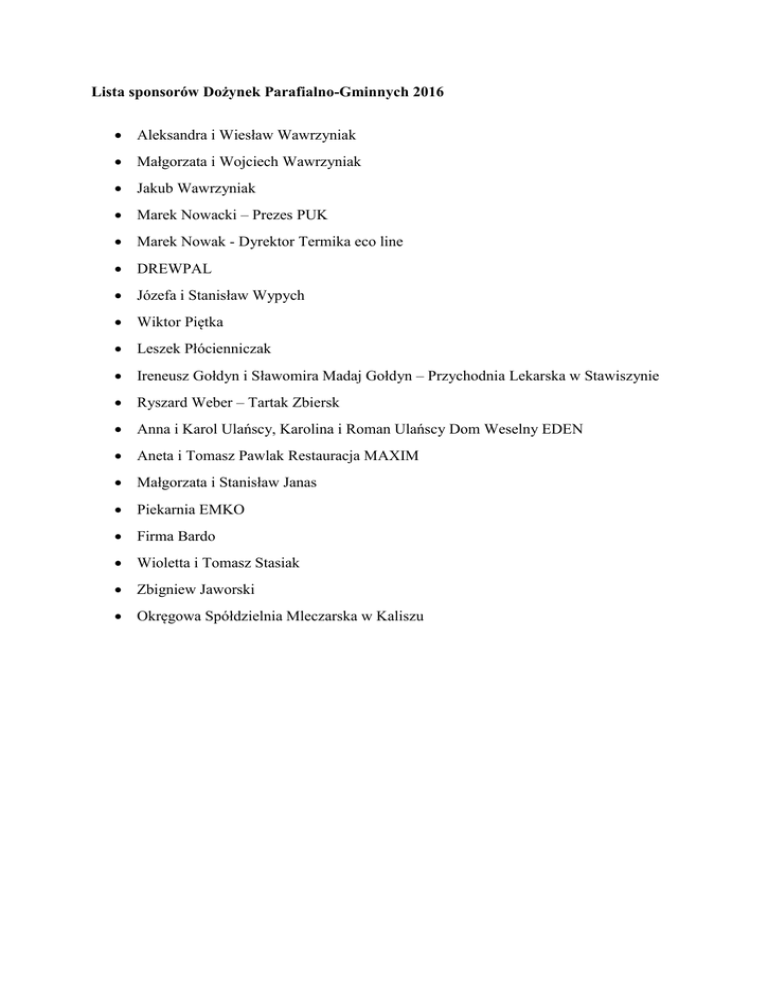Lista sponsorów Dożynek Parafialno-Gminnych 2016 Aleksandra i Wiesław Wawrzyniak Małgorzata i Wojciech Wawrzyniak Jakub Wawrzyniak Marek Nowacki – Prezes PUK Marek Nowak - Dyrektor Termika eco line DREWPAL Józefa i Stanisław Wypych Wiktor Piętka Leszek Płócienniczak Ireneusz Gołdyn i Sławomira Madaj Gołdyn – Przychodnia Lekarska w Stawiszynie Ryszard Weber – Tartak Zbiersk Anna i Karol Ulańscy, Karolina i Roman Ulańscy Dom Weselny EDEN Aneta i Tomasz Pawlak Restauracja MAXIM Małgorzata i Stanisław Janas Piekarnia EMKO Firma Bardo Wioletta i Tomasz Stasiak Zbigniew Jaworski Okręgowa Spółdzielnia Mleczarska w Kaliszu