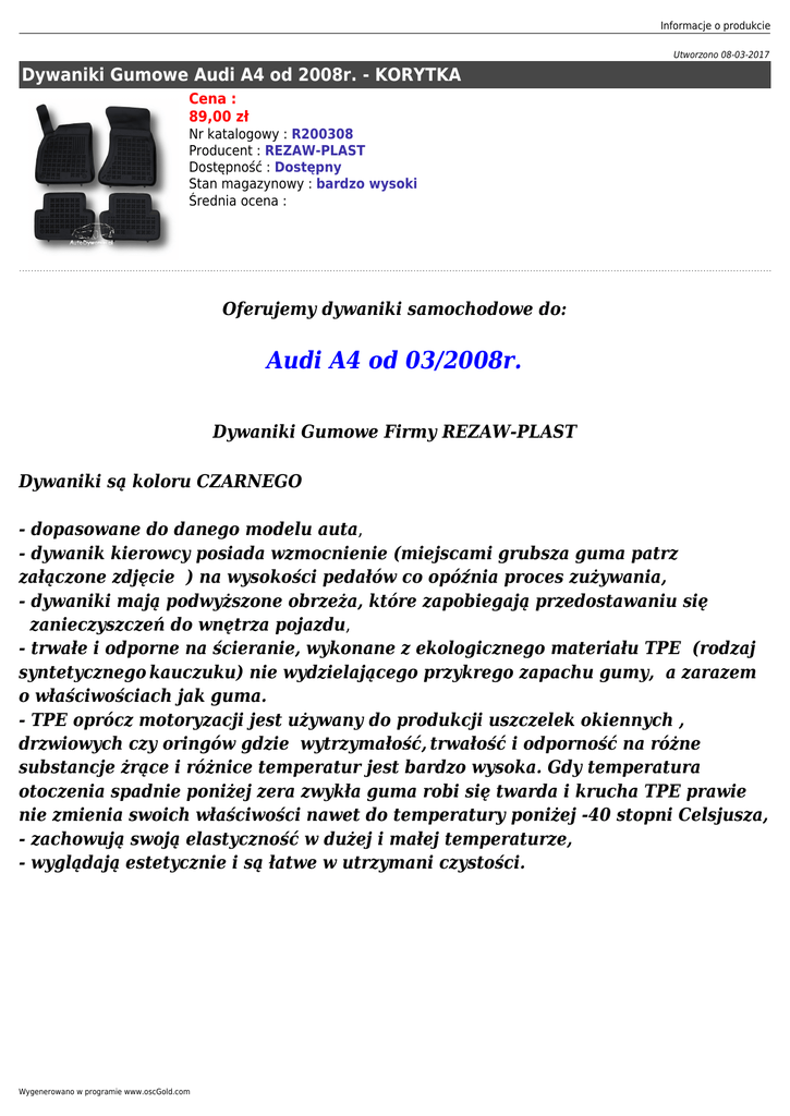 Informacje o produkcie Utworzono 08-03-2017 Dywaniki Gumowe Audi A4 od 2008r. - KORYTKA Cena : 89,00 zł Nr katalogowy : R200308 Producent : REZAW-PLAST Dostępność : Dostępny Stan magazynowy : bardzo wysoki Średnia ocena : Oferujemy dywaniki samochodowe do: Audi A4 od 03/2008r. Dywaniki Gumowe Firmy REZAW-PLAST Dywaniki są koloru CZARNEGO - dopasowane do danego modelu auta, - dywanik kierowcy posiada wzmocnienie (miejscami grubsza guma patrz załączone zdjęcie ) na wysokości pedałów co opóźnia proces zużywania, - dywaniki mają podwyższone obrzeża, które zapobiegają przedostawaniu się zanieczyszczeń do wnętrza pojazdu, - trwałe i odporne na ścieranie, wykonane z ekologicznego materiału TPE (rodzaj syntetycznego kauczuku) nie wydzielającego przykrego zapachu gumy, a zarazem o właściwościach jak guma. - TPE oprócz motoryzacji jest używany do produkcji uszczelek okiennych , drzwiowych czy oringów gdzie wytrzymałość, trwałość i odporność na różne substancje żrące i różnice temperatur jest bardzo wysoka. Gdy temperatura otoczenia spadnie poniżej zera zwykła guma robi się twarda i krucha TPE prawie nie zmienia swoich właściwości nawet do temperatury poniżej -40 stopni Celsjusza, - zachowują swoją elastyczność w dużej i małej temperaturze, - wyglądają estetycznie i są łatwe w utrzymani czystości. Wygenerowano w programie www.oscGold.com