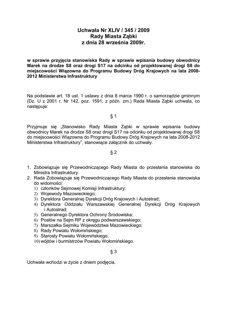 Uchwała Nr XLIV / 345 / 2009 Rady Miasta Ząbki z dnia 28 września 2009r. w sprawie przyjęcia stanowiska Rady w sprawie wpisania budowy obwodnicy Marek na drodze S8 oraz drogi S17 na odcinku od projektowanej drogi S8 do miejscowości Wiązowna do Programu Budowy Dróg Krajowych na lata 20082012 Ministerstwa Infrastruktury Na podstawie art. 18 ust. 1 ustawy z dnia 8 marca 1990 r. o samorządzie gminnym (Dz. U z 2001 r. Nr 142, poz. 1591, z późn. zm.) Rada Miasta Ząbki uchwala, co następuje: §1 Przyjmuje się „Stanowisko Rady Miasta Ząbki w sprawie wpisania budowy obwodnicy Marek na drodze S8 oraz drogi S17 na odcinku od projektowanej drogi S8 do miejscowości Wiązowna do Programu Budowy Dróg Krajowych na lata 2008-2012 Ministerstwa Infrastruktury”, stanowiące załącznik do uchwały. §2 1. Zobowiązuje się Przewodniczącego Rady Miasta do przesłania stanowiska do Ministra Infrastruktury. 2. Rada Zobowiązuje się Przewodniczącego Rady Miasta do przesłania stanowiska do widomości: 1) członków Sejmowej Komisji Infrastruktury; 2) Wojewody Mazowieckiego; 3) Dyrektora Generalnej Dyrekcji Dróg Krajowych i Autostrad; 4) Dyrektora Oddziału Warszawskiej Generalnej Dyrekcji Dróg Krajowych i Autostrad; 5) Generalnego Dyrektora Ochrony Środowiska; 6) Posłów na Sejm RP z okręgu podwarszawskiego; 7) Marszałka Sejmiku Województwa Mazowieckiego; 8) Rady Powiatu Wołomińskiego; 9) Starosty Powiatu Wołomińskiego; 10) wójtów i burmistrzów Powiatu Wołomińskiego. §3 Uchwała wchodzi w życie z dniem podjęcia. Załącznik do uchwały Nr XLIV/345/2009 Rady Miasta Ząbki z dnia 28 września 2009 r. Stanowisko Rady Miasta Ząbki z dnia 28 września 2009 r. w sprawie wpisania budowy obwodnicy Marek na drodze S8 oraz drogi S17 na odcinku od projektowanej drogi S8 do miejscowości Wiązowna do Programu Budowy Dróg Krajowych na lata 2008-2012 Ministerstwa Infrastruktury Rada Miasta Ząbki zwraca się do Ministra Infrastruktury o wpisanie w roku 2009 budowy obwodnicy Marek na drodze S8 oraz drogi S17 na odcinku od projektowanej drogi S8 do miejscowości Wiązowna do Programu Budowy Dróg Krajowych na lat 2008-2012. Szybki wzrost ludności w mieście Ząbki jak i w zachodniej części Powiatu Wołomińskiego oraz gwałtowny rozwój gospodarczy tych rejonów powoduje zwiększenie ruchu ulicznego. Brak ponadpowiatowej infrastruktury drogowej, pozwalającej ominąć silnie zurbanizowane rejony miast, jest przyczyną pogłębiającego się paraliżu komunikacyjnego. Sytuacja ta stanowi zagrożenie dla zdrowia i życia mieszkańców naszego miasta. Planowana budowa obwodnicy Marek na drodze S8 i drogi S17 znacznie przyczyni się do przeniesienia obecnego ruchu tranzytowego poza miasto Ząbki, obniżenia zanieczyszczenia środowiska i zmniejszenia poziomu hałasu. Wszelkie środki, podejmowane przez władze miasta w zakresie infrastruktury drogowej, nie są w stanie zapewnić bezpieczeństwa mieszkańców wobec stale zwiększającego się ruchu ulicznego. Obecnie droga krajowa nr 8 przechodząca przez sąsiednie miasto Marki nie spełnia swojego zadania z powodu lokalizacji. Przechodząc przez środek miasta, z licznymi skrzyżowaniami na dość długim odcinku, jest przyczyną tamowania ruchu tranzytowego i nadmiernej uciążliwości dla mieszkańców. Kierowcy, w celu ominięcia zatorów, korzystają z dróg gminnych sąsiednich miast, jak Ząbki czy Zielonka. Drogi gminne i powiatowe, nie przeznaczone do przenoszenia tak dużego obciążenia komunikacyjnego, szybko ulegają zniszczeniu, co dodatkowo powoduje powstawanie zagrożeń w ruchu ulicznym. Koszty związane z zaistniałą sytuacją, ponoszone z budżetów gmin i powiatu Wołomińskiego stanowią znaczną część środków przeznaczanych na inwestycje. Stanowi to olbrzymie obciążenie finansowe samorządów, kosztem inwestycji takich jak szkoły, przedszkola czy obiekty rekreacyjno-sportowe. Poważny i niepokojący jest fakt, że budowa obwodnicy Marek nie znalazła się w Programie Budowy Dróg Krajowych na lata 2008-2012 oraz w Programie Operacyjnym Infrastruktura i Środowisko. W związku z powyższym zaniepokojeni mieszkańcy zaczynają tworzyć niezależne komitety i grupy, których zadaniem jest zwrócenie uwagi władz na ten poważny problem. Rada Miasta Ząbki zwraca się z prośbą o jak najszybsze rozpoczęcie budowy obwodnicy na drodze S8 i drogi S17. Każdy dzień opóźnienia powyższej inwestycji przekłada się bezpośrednio na szybko rosnącą frustrację mieszkańców, na ich zdrowie i życie.