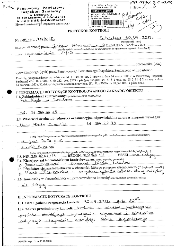 lt11./IT/lU.0.ィ.M.e 種ヽi 一 Urzad Miasta Lubarteu 千一.tkも PahsIWoWy PowiatQWy ul.Jana Pa高aII12 str。naノ」.2.才.… 看靴曲事hM凪S lnspektor Sanitarny HpIYne重o dn.30−05−201Z w Luba殖OWic Przのeto prze之. QgnleSZka 時sok 2日00Lubar‘‘W●uLLubcleh103 霊器器器器蕊霊三。g。 PROTOKOLKONTROLI NrO周年融、摘剛姐 przeprowadzonqPrZeZ upowamionego(−yCh)przezPahstwowegoPowiatowegoInspektoraSanitamegowLubartowie・ Kontroleprzeprowadzononapodstawieart・liah25ust・lustawyzdnla14marca1985r・OPahstwow車nspe坤 sanitam諒Dz・UiZ2011r・Nr212・pOZ・1263・準痛WZWiazkuar167§lorazart・68§li§2ustawyzdnia 14czerwca1960r.Kodekspostepowaniaadmnistrac加ego(Dz・U・Z2000r・nr98,pOZlO71・ZP62m・Zm)・ ●I.INFORMACJEDOTYCZACEKONTROLOWANEGOZAKLADU/OBIEKTU I.1.ZakIad/obiektkontrolowaqy・hehuznaz開adre寝擁)Il・Ji勅 I.2.WlaSciciel/osobalubjednostkaorganizacyjnaodpowiedzialnazaprzestrzeganiewymagah: .噂話・鮎・霜…・航‘諒油…………………・晶…・羅・・損‥萄・・… (擁ina諦∫ko/函an抑‘∼/inwestor焼anzaioのCIelsk′柄pめpHukt南的)Wlln八時m諭,個性I脇1函Il碓Tの (adreszamieszkanla/adresJiedlttV′んprDPadkujp練直回旋jadrejyZa〝融kantawJZySL潮岬dlnikew・〃eM77碕ks) ●:‥謹畿藍輩葦輩葦諜諦畳L…高専も‥ 1−′今へ. ゝ子が ふ  ̄ 繕謙譲悪罵鷲率譲蕊藍諌 l Q l∴J I.6.InneosobywobecnoScl,kt6rychprzeprowadzonokontrol函Inieina掴ko′e一,′ennialnieadre所 読∴高専萄 H.INFORMACJEDOTYCZACEKONTROLI II.1.Dataigodzinarozpoczeciakontroli∴・約・、 II2ZakresprzedmlOtOWykontrol1時最短」高鳥、騎e 昨準舶呼Yu気 ヽ TJ【 J 」も FIIPT101Wydlzdn・13102008で・ 園田匿国 Protok61kontrolinr洲組視.・.緒雄!化′ ∴str。na.&.Z6.. 、 、 ⅡI.WYNIKtKONTROLI: 目 メ 方 HI・1・Inn)rmaCjeokontrolowanymza肘adzie/obiekcie(stanjbmaln。−p酬nJ川r所 競誓器競業誓誓嘉誓嵩霧需莞端霧綜霧駕 曾い…鉦(Q2時 え _) ヽ 私記如上…か人丸血…Q 主宰 d 詰聖壷膏ふふふ年中−i謹言▲∴ 寄主、和 し続柄 駁止 しJ V0星人e O 《轡転一里 1、 − すねA……嶋読、霊、へ・Y、ノ合・象 lヽノ糟∧ nC}NVLI 煽繭亭主や「亨塵点し・0品。画等生 臨語気j r噂l人波の軸心竺卑 し 高調華や尋恥諒⊥e高鍋王手・心痛聞く車高一 高軌読点黒牛 四囲四国圏 忠心最古点魚油持し彼ら・g振高言工人強気えー」つふう ¢噂諒 QV∽ NQ L飯硯¢ 肝心 繭鴫 d一船穂 蛤証高言甲高時子強売品点心五戒亘理融点航空中高搬出胸高 d∴∴0 NQ 、ヽ∴∴ −ヽ ● 同最専売細工畔中型 鯨擁高 一画工呼 芯様様、p勧\撮_、¢末 斑気 品uQ無塩Q Fi/PTY01wydIzdn13102008r 滋宣言∴i y pr。t。k6Ik。n..。linr鵬亜∴潮偽拘 stronaな.Z6… .声ノ 目し¢一㌢11 III.2.WyposaZenieuzytepodczaskontroli* …e姐と{o笠 III.3.PodczaskontrolidobadahlaboratoryJnyChpobranopr6bki−nrPrOtOkoIu/6W* III.4.Korzystano*zwynik6wbadahipomiar6W: 皿.5.Dokumentyocenianewtrakciekontroli: Ⅳ・NieprawidrowoScistwierdzonepodczas kontrolizpodaniemprzepIS6wprawnych,kt6re naruszono*: FllPH01wyd.lzdn・1310・2008r 嘗一・打壊 pr。t。k6匝n.r。lin,0鵬∴日.時蘭煩槻i∴str。。。虹zb; V.Wykazdokument6wza壇CZOnyChdoprotokohl* 葦蛋覇 zastl・zezeniaos6buczestniczacychwkontroli・ uwagllZaStrZeZeniadoopISanegOWPrOtOkolestanufaktycznego: ● vII.ZastwierdzonenieprawiqIowoSciwymippionewprotokolewpkt・ mandatkamyna.….合印,WAd.・鉦′、…匪q…\近しつむ、、・a WwysokoSci……………………naPOdstawieart・ (nrmandalukarnego) hOd重a、†′apraWna) UpowaZnielhedonakIadaniagrzywienwdrodzemandatukamegozdnia………………・m・… PoprawkiiuzTPehheniadoprotok中一nanleSiono逸事≡空夢諒 ●器霧驚繋霧繁務霧霧慧競禁霧㌢ (竃繋競業認諾許車掌誓 碑㍗\点、\信雄 FIIPTIOIwyd.12.dn.13.102008r・ 韓童虹∴∴i∴∴ ら Dataigodz.zakohczenia Protokd王kontrolinr釧医Ⅲ持戒聞坤俄∴∴∴strona5..25∴ 鋤気 有性 乙禅Ily。ZaSk。ntr。虹4..如eL.無声へ _一上告∪山肌 高士日高品u間潤一刷12 04/ん巧 Sと⊃んつ。UJ1/ン ¢0物証nめpiec諦StrOりん彩れaMC履ko周TOlo†↓′anegOZakiadu) StarszyTcchnik ¢0佃は0∫6bobecn)−chpodcza諒omTOli) ⊂−一つ畑 、じ∴主点い子i_、jiの POTWIERDZENIEODBIORUPROTOKOLUPRZEZSTRON耳 ●pr。t。k6Ik。ntr。Hsanitamかtrzymabm(−am)wdniu仇鞍点・や粒 Inspe ktor pのルrL S ohん}シ向1 °‘常雄薙鱒織機鰯㌫㌫毒 POUCZENIE:Strona/osobaupowa血ionawtemhnie7dnioddatydoreczenianinlq〕SZegOprOtOkoh mozezgIosiezastrzeZeniadoustalehstanufaktycznego・ 砂nlkikontrolidoり,CZqWamnk6wskonlrolowanegozaktaduhblektuwczasieimidscutn倣niakontroli StT・Onanakazeb,metapJepOS砲,01mniamapraWOWglqdul〝dokumentaqewsledzibieStadl・ *−WprりpadkLt0勿0−壷水川egの母型i′la塵)il函Sa信,房edooiCa′’’ **一読ajcIwezakrejl冶 F一/PTl01wydlZdn1310・2008「