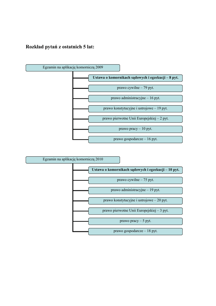 Rozkład pytań z ostatnich 5 lat: Egzamin na aplikację komorniczą 2009 Ustawa o komornikach sądowych i egzekucji – 8 pyt. prawo cywilne – 79 pyt. prawo administracyjne – 16 pyt. prawo konstytucyjne i ustrojowe – 19 pyt. prawo pierwotne Unii Europejskiej – 2 pyt. prawo pracy – 10 pyt. prawo gospodarcze – 16 pyt. Egzamin na aplikację komorniczą 2010 Ustawa o komornikach sądowych i egzekucji – 10 pyt. prawo cywilne – 75 pyt. prawo administracyjne – 19 pyt. prawo konstytucyjne i ustrojowe – 20 pyt. prawo pierwotne Unii Europejskiej – 3 pyt. prawo pracy – 5 pyt. prawo gospodarcze – 18 pyt. Egzamin na aplikację komorniczą 2011 Ustawa o komornikach sądowych i egzekucji – 12 pyt. prawo cywilne – 85 pyt. prawo administracyjne – 17 pyt. prawo konstytucyjne i ustrojowe – 13 pyt. prawo pierwotne Unii Europejskiej – 3 pyt. prawo pracy – 5 pyt. prawo gospodarcze – 15 pyt. Egzamin na aplikację komorniczą 2012 Ustawa o komornikach sądowych i egzekucji – 17 pyt. prawo cywilne – 87 pyt. prawo administracyjne – 12 pyt. prawo konstytucyjne i ustrojowe – 17 pyt. prawo pierwotne Unii Europejskiej – 3 pyt. prawo pracy – 4 pyt. prawo gospodarcze – 10 pyt. Egzamin na aplikację komorniczą 2013 Ustawa o komornikach sądowych i egzekucji – 5 pyt. prawo cywilne – 87 pyt. prawo administracyjne – 24 pyt. prawo konstytucyjne i ustrojowe – 12 pyt. prawo pierwotne Unii Europejskiej – 2 pyt. prawo pracy – 7 pyt prawo gospodarcze – 13 pyt. Akty normatywne zaliczone do poszczególnych grup: PRAWO CYWILNE: ustawa z 23.4.1964 r. – Kodeks cywilny ustawa z 17.11.1964 r. – Kodeks postępowania cywilnego ustawa z 24.6.1994 r. o własności lokali ustawa z 15.12.2000 r. o spółdzielniach mieszkaniowych ustawa z 25.2.1964 r. – Kodeks rodzinny i opiekuńczy ustawa z 21.6.2001 r. o ochronie praw lokatorów, mieszkaniowym zasobie gminy i o zmianie Kodeksu cywilnego 7. ustawa z 4.2.2011 – Prawo prywatne międzynarodowe 8. ustawa z 27.7.2002 r. o szczególnych warunkach sprzedaży konsumenckiej oraz o zmianie Kodeksu cywilnego 1. 2. 3. 4. 5. 6. PRAWO ADMINISTRACYJNE: ustawa z 8.3.1990 r. o samorządzie gminnym ustawa z 5.6.1998 r. o samorządzie powiatowym ustawa z 5.6.1998 r. o samorządzie województwa ustawa z 23.1.2009 r. o wojewodzie i administracji rządowej w województwa ustawa z 20.6.2002 r. o bezpośrednim wyborze wójta, burmistrza i prezydenta miasta ustawa z 24.7.1998 r. o wprowadzenia zasadniczego trójstopniowego podziału terytorialnego państwa 7. ustawa z 14.6.1960 r. – Kodeks postępowania administracyjnego 8. ustawa z 8.8.1996 r. o Radzie Ministrów 9. ustawa z 21.5.1999 r. o broni i amunicji 10. ustawa z 27.7.2005 r. – Prawo o szkolnictwie wyższym 1. 2. 3. 4. 5. 6. 11. ustawa z 29.8.1997 r. o ochronie danych osobowych 12. ustawa z 15.7.2011 r. o kontroli w administracji rządowej 13. ustawa z 21.11.2008 r. o służbie cywilnej 14. ustawa z 29.8.1997 r. – Ordynacja podatkowa PRAWO KONSTYTUCYJNE I USTROJOWE: 1. 2. 3. 4. 5. Konstytucja RP z 2.4.1997 r. ustawa z 27.7.2001 r. – Prawo o ustroju sądów powszechnych ustawa z 25.7.2002 r. – Prawo o ustroju sądów administracyjnych ustawa z 23.11.2002 r. o Sądzie Najwyższym ustawa z 8.7.2005 r. o Prokuratorii Generalnej Skarbu Państwa PRAWO PRACY: ustawa z 26.6.1974 r. – Kodeks pracy PRAWO GOSPODARCZE: 1. 2. 3. 4. 5. 6. 7. 8. ustawa z 2.7.2004 r. o swobodzie działalności gospodarczej ustawa z 28.2.2003 r. – Prawo upadłościowe i naprawcze ustawa z 15.9.2000 r. – Kodeks spółek handlowych ustawa z 20.8.1997 r. o Krajowym Rejestrze Sądowym ustawa z 16.9.1982 r. – Prawo spółdzielcze ustawa z 19.11.1999 r. – Prawo działalności gospodarczej ustawa z 11.3.2004 r. o podatku od towarów i usług ustawa z 27.8.2009 r. o finansach publicznych PRAWO UNII EUROPEJSKIEJ 1. Traktat z 7.2.1992 r. o Unii Europejskiej 2. Traktat z 25.3.1957 r. o funkcjonowaniu Unii Europejskiej