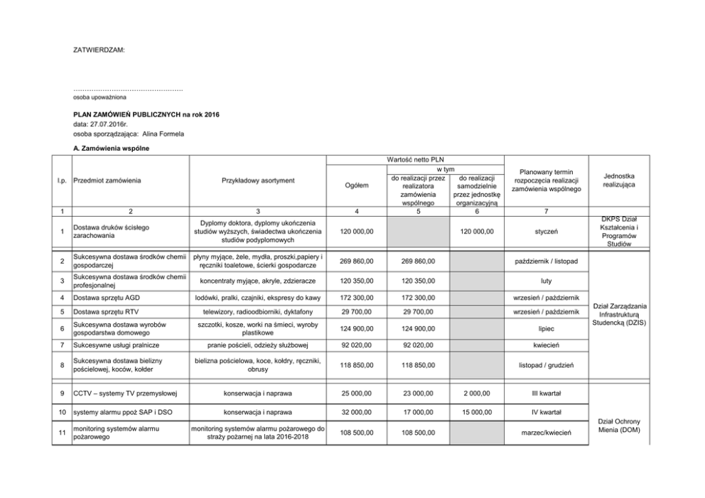 ZATWIERDZAM: …………………………………………. osoba upoważniona PLAN ZAMÓWIEŃ PUBLICZNYCH na rok 2016 data: 27.07.2016r. osoba sporządzająca: Alina Formela A. Zamówienia wspólne l.p. Przedmiot zamówienia 1 2 Przykładowy asortyment Ogółem 3 4 Wartość netto PLN w tym do realizacji przez do realizacji realizatora samodzielnie zamówienia przez jednostkę wspólnego organizacyjną 5 6 Planowany termin rozpoczęcia realizacji zamówienia wspólnego 7 1 Dostawa druków ścisłego zarachowania Dyplomy doktora, dyplomy ukończenia studiów wyższych, świadectwa ukończenia studiów podyplomowych 120 000,00 2 Sukcesywna dostawa środków chemii gospodarczej płyny myjące, żele, mydła, proszki,papiery i ręczniki toaletowe, ścierki gospodarcze 269 860,00 269 860,00 październik / listopad 3 Sukcesywna dostawa środków chemii profesjonalnej koncentraty myjące, akryle, zdzieracze 120 350,00 120 350,00 luty 4 Dostawa sprzętu AGD lodówki, pralki, czajniki, ekspresy do kawy 172 300,00 172 300,00 wrzesień / październik 5 Dostawa sprzętu RTV telewizory, radioodbiorniki, dyktafony 29 700,00 29 700,00 wrzesień / październik 6 Sukcesywna dostawa wyrobów gospodarstwa domowego szczotki, kosze, worki na śmieci, wyroby plastikowe 124 900,00 124 900,00 lipiec 7 Sukcesywne usługi pralnicze pranie pościeli, odzieży służbowej 92 020,00 92 020,00 kwiecień 8 Sukcesywna dostawa bielizny pościelowej, koców, kołder bielizna pościelowa, koce, kołdry, ręczniki, obrusy 118 850,00 118 850,00 listopad / grudzień 9 CCTV – systemy TV przemysłowej konserwacja i naprawa 25 000,00 23 000,00 2 000,00 III kwartał 10 systemy alarmu ppoż SAP i DSO konserwacja i naprawa 32 000,00 17 000,00 15 000,00 IV kwartał 11 monitoring systemów alarmu pożarowego monitoring systemów alarmu pożarowego do straży pożarnej na lata 2016-2018 108 500,00 120 000,00 108 500,00 Jednostka realizująca styczeń marzec/kwiecień DKPS Dział Kształcenia i Programów Studiów Dział Zarządzania Infrastrukturą Studencką (DZIS) Dział Ochrony Mienia (DOM) 12 ubezpieczenie majątku oraz OC Politechniki Gdańskiej na lata 20162018 13 Dostawa czasopism krajowych 14 Dostawa czasopism zagranincznych 15 Dostawa książek krajowych 16 Dostawa książek importowanych 17 Dostawa baz danych 18 Dostawa norm 19 500 000,00 500 000,00 124 805,00 124 105,00 700,00 IV kwartał 84 280,00 82 480,00 1 800,00 III kwartał Podręczniki, słowniki, książki naukowe, encyklopedie 248 600,00 245 600,00 3 000,00 I-IV kwartał Podręczniki, słowniki, książki naukowe, encyklopedie 181 150,00 175 650,00 5 500,00 I-IV kwartał Bazy specjalistyczne zagraniczne i krajowe 531 548,00 526 048,00 5 500,00 III-IV kwartał Normy polskie i zagraniczne 21 620,00 18 450,00 3 170,00 I-IV kwartał Dostawa narzędzi ręcznych i elektrycznych (wiertarki, szlifierki, pilniki, młotki itp.) 174 650,00 155 650,00 19 000,00 kwiecień. 20 Dostawa wyrobów metalowych (gwoździe, śruby, kształtki, wkrętaki) 35 030,00 28 500,00 6 530,00 poniżej 30 000 Euro 21 Dostawa aparatów telefonicznych i faksów aparaty telefoniczne, faksy 56 500,00 29 300,00 27 200,00 poniżej 30 000 Euro 22 Usługi telefonii komórkowej - umowa do 31.01.2018r. 23 Usługi telefonii stacjonarnej - umowa do 31.10.2017r. 24 Dostawa i przegląd sprzętu p-poż. 25 Usługi okresowych przeglądów przewodów kominowych i wentylacyjnych 26 Dostawa gazów 27 Usługa konserwacji dźwigów 650 000,00 650 000,00 29 Usługa wykonania przeglądów/ pomiarów instalacji odgromowych 40 000,00 40 000,00 poniżej 30 000 Euro 30 Usługa przeglądów instalacji gazowych 20 000,00 20 000,00 poniżej 30 000 Euro 31 Dostawa materiałów elektrycznych 800 000,00 800 000,00 październik 32 Usługa konserwacji klimatyzacji i wentylacji 390 000,00 390 000,00 październik 33 Usługa konserwacji kuchenek gazowych 40 000,00 40 000,00 poniżej 30 000 Euro Dzienniki, czasopisma techniczne, czasopisma naukowe Czasopisma drukowane, czasopism w dostępie wyłącznie online Gaśnice, prądownice, węże 83 000,00 83 000,00 poniżej 30 000 Euro 48 000,00 48 000,00 poniżej 30 000 Euro - żarówki, świetlówki, baterie, oprawy, przedłużacze kwiecień/maj Bibliotek Główna (BG) umowa zawrta do sierpień / wrzesień 2017 Dział Eksploatacji (DE) grudzień 34 Serwis systemów telekomunikacyjnych (TDM + VoIP) 35 Dostawa produktów leczniczych 36 72 000,00 72 000,00 (zaopatrzenie apteczek) 51 800,00 50 000,00 1 800,00 listopad Dostawa mebli biurowych szafy, biurka, zabudowy, regały, kontenerki, stoły 915 850,00 213 800,00 702 050,00 IV kwartał 37 Dostawa krzeseł, foteli, stołów szkolnych krzesła obrotowe, krzesła uczniowskie, fotele 232 250,00 122 300,00 109 950,00 IV kwartał 38 Dostawa kserokopiarek 84 000,00 78 500,00 5 500,00 II-III kwartał 39 Dostawa odzieży i środków BHP 160 000,00 160 000,00 II kwartał 40 Usługi wywozów odpadów segregowanych 115 000,00 115 000,00 I kwartał 41 Dostawa sprzętu multimedialnego 1 458 787,00 1 187 400,00 42 Dostawa zamków i okuć budowlanych 50 000,00 50 000,00 43 Dostawa materiałów hydraulicznych 356 950,00 350 000,00 44 Dostawa pieczątek 10 000,00 10 000,00 I kwartał 45 Dostawa materiałów eksploatacyjnych do drukarek, faksów i urządzeń wielofunkcyjnych 1 280 690,00 1 280 690,00 IV kwartał 46 Usługa mycia okien i powierzchni szklanych 110 000,00 110 000,00 czerwiec poniżej 30 000 euro 47 Usługa rezerwacji, sprzedaży i dostarczanie biletów krajowych i międzynarodowych biletów lotniczych na potrzeby PG 48 kamery, ekran, projektory multimedialne, rzutnik multimedialny, sieciowe urządzenie wielofunkcyjne poniżej 30 000 Euro 271 387,00 II-III kwartał Dział Spraw Pracowniczych (DSP) Dział Gospodarczy (DG) poniżej 30 000 Euro 6 950,00 IV kwartał Bilety lotnicze krajowe i międzynarodowe 3 600 000,00 3 600 000,00 luty Sprzęt komputerowy komputery stacjonarne i przenośne, monitory oraz serwery, stacje robocze 1 850 800,00 70