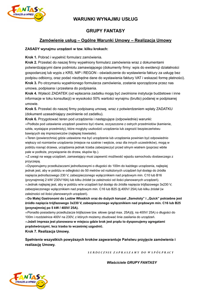 WARUNKI WYNAJMU USŁUG GRUPY FANTASY Zamówienie usług – Ogólne Warunki Umowy – Realizacja Umowy ZASADY wynajmu urządzeń w tzw. kilku krokach: Krok 1. Pobrać i wypełnić formularz zamówienia. Krok 2. Przesłać do naszej firmy wypełniony formularz zamówienia wraz z dokumentami potwierdzającymi dane podmiotu zamawiającego (dokumenty firmy: wpis do ewidencji działalności gospodarczej lub wypis z KRS, NIP i REGON - oświadczenie do wystawienia faktury za usługę bez podpisu odbiorcy, oraz podać niezbędne dane do wystawienia faktury VAT i wskazać formę płatności). Krok 3. Po otrzymaniu wypełnionego formularza zamówienia, zostanie sporządzona przez nas umowa, podpisana i przesłana do podpisania. Krok 4. Wpłacić ZADATEK (od wpłacania zadatku mogą być zwolnione instytucje budżetowe i inne informacje w toku konsultacji) w wysokości 50% wartości wynajmu (brutto) podanej w podpisanej umowie. Krok 5. Przesłać do naszej firmy podpisaną umowę, wraz z potwierdzeniem wpłaty ZADATKU (dokument uzasadniający zwolnienie od zadatku). Krok 6. Przygotować teren pod urządzenia i następujące (odpowiednie) warunki: • Podłoże pod ustawienie urządzeń powinno być równe, oczyszczone z ostrych przedmiotów (kamienie, szkła, wystające przedmioty), które mogłyby uszkodzić urządzenia lub zagrozić bezpieczeństwu bawiących się imprezowiczów (najlepiej trawiaste). • Teren (powierzchnia) gdzie ustawione ma być urządzenie lub urządzenia powinien być odpowiednio większy od rozmiarów urządzenia (miejsce na szatnie i wejście, oraz dla innych uczestników), mogą w pobliżu rosnąć drzewa, urządzenia jednak trzeba zabezpieczyć przed silnym wiatrem (poprzez wbite pale w podłoże, przywiązanie do drzew, słupów itp.). • Z uwagi na wagę urządzeń, zamawiający musi zapewnić możliwość wjazdu samochodu dostawczego z przyczepą. • Dysponujemy przedłużaczami jednofazowymi o długości do 100m do każdego urządzenia, najlepiej jednak jest, aby w pobliżu w odległości do 50 metrów od rozłożonych urządzeń był dostęp do źródła napięcia jednofazowego 230 V, zabezpieczonego wyłącznikiem nad prądowym min. C10 lub B16 (przynajmniej 2 kW/ 230V/16A) lub kilku źródeł (w zależności od ilości planowanych urządzeń). • Jednak najlepiej jest, aby w pobliżu w/w urządzeń był dostęp do źródła napięcia trójfazowego 3x230 V, zabezpieczonego wyłącznikiem nad prądowym min. C16 lub B25 (tj.400V/ 25A) lub kilku źródeł (w zależności od ilości planowanych urządzeń). • Do Małej Gastronomi do Lodów Włoskich oraz do dużych karuzel „Samoloty” i „Quick” potrzebne jest źródło napięcia trójfazowego 3x230 V, zabezpieczonego wyłącznikiem nad prądowym min. C16 lub B25 (przynajmniej po 5 kW / 400V/ 25A). • Ponadto posiadamy przedłużacze trójfazowe tzw. siłowe (prąd max. 25A)(tj. na 400V/ 25A) o długości do 100m i rozdzielnice 400V na 230V, z których możemy zbudować linie zasilania do urządzeń. • Jeżeli impreza jest planowana w miejscu gdzie brak jest prądu to dysponujemy agregatami prądotwórczymi, lecz trzeba to wcześniej uzgodnić. Krok 7. Realizacja Umowy. Spełnienie wszystkich powyższych kroków zagwarantuje Państwu przyjęcie zamówienia i realizację Umowy. S E R D E C ZNI E Z A P R A S Z A M Y DO W S P Ó Ł P R AC Y Właściciele GRUPY FANTASY