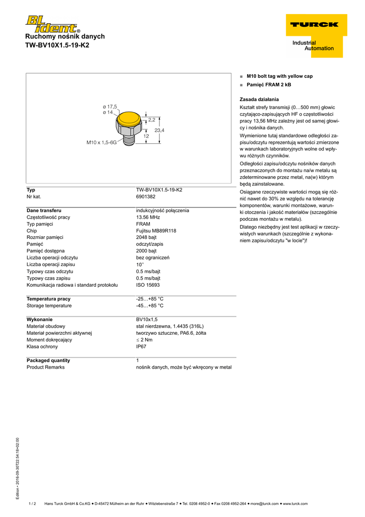 Ruchomy nośnik danych TW-BV10X1.5-19-K2 ■ M10 bolt tag with yellow cap ■ Pamięć FRAM 2 kB Zasada działania Kształt strefy transmisji (0…500 mm) głowic czytająco-zapisujących HF o częstotliwości pracy 13,56 MHz zależny jest od samej głowicy i nośnika danych. Wymienione tutaj standardowe odległości zapisu/odczytu reprezentują wartości zmierzone w warunkach laboratoryjnych wolne od wpływu różnych czynników. Typ Nr kat. TW-BV10X1.5-19-K2 6901382 Dane transferu Częstotliwość pracy Typ pamięci Chip Rozmiar pamięci Pamięć Pamięć dostępna Liczba operacji odczytu Liczba operacji zapisu Typowy czas odczytu Typowy czas zapisu Komunikacja radiowa i standard protokołu indukcyjność połączenia 13.56 MHz FRAM Fujitsu MB89R118 2048 bajt odczyt/zapis 2000 bajt bez ograniczeń 10 0.5 ms/bajt 0.5 ms/bajt ISO 15693 Temperatura pracy Storage temperature -25…+85 °C -45…+85 °C Wykonanie Materiał obudowy Materiał powierzchni aktywnej Moment dokręcający Klasa ochrony BV10x1,5 stal nierdzewna, 1.4435 (316L) tworzywo sztuczne, PA6.6, żółta ð 2 Nm IP67 Packaged quantity Product Remarks 1 nośnik danych, może być wkręcony w metal Odległości zapisu/odczytu nośników danych przeznaczonych do montażu na/w metalu są zdeterminowane przez metal, na(w) którym będą zainstalowane. Osiągane rzeczywiste wartości mogą się różnić nawet do 30% ze względu na tolerancję komponentów, warunki montażowe, warunki otoczenia i jakość materiałów (szczególnie podczas montażu w metalu). Dlatego niezbędny jest test aplikacji w rzeczywistych warunkach (szczególnie z wykonaniem zapisu/odczytu "w locie")! Edition • 2016-09-30T22:54:18+02:00 10 1/2 Hans Turck GmbH & Co.KG ñ D-45472 Mülheim an der Ruhr ñ Witzlebenstraße 7 ñ Tel. 0208 4952-0 ñ Fax 0208 4952-264 ñ [email protected] ñ www.turck.com Ruchomy nośnik danych TW-BV10X1.5-19-K2 Kompatybilność z programatorem ręcznym PD-IDENT-HF-RWBTA (7030601) Programator ręczny do lokalnego zapisu i odczytu nośników danych. Wyposażony w interfejsy WLAN 802.11a/b/ g/n i Bluetooth; zawiera stację bazową z zasilaczem, przewód USB i oprogramowanie TURCK RFID TA-HF. PD-IDENT-HF-S2D-RWBTA (7030602) Programator ręczny do lokalnego zapisu i odczytu nośników danych. Wyposażony w interfejsy WLAN 802.11a/b/g/ n i Bluetooth oraz skaner kodów kreskowych 2D; zawiera uchwyt pistoletowy, stację bazową z zasilaczem, przewód USB i oprogramowanie TURCK RFID TA-HF. Edition • 2016-09-30T22:54:18+02:00 PD-IDENT-HF-L1D-RBUP-SMART (7030564) Programator ręczny do lokalnego zapisu i odczytu nośników danych. Funkcja klawiatury (HID) służąca bezprzewodowemu transferowi danych za pomocą Bluetooth (również do urządzeń IOS) lub USB. Laserowy skaner kodów kreskowych 1 D i tylko trzy przyciski ułatwiają jego obsługę. 2/2 Hans Turck GmbH & Co.KG ñ D-45472 Mülheim an der Ruhr ñ Witzlebenstraße 7 ñ Tel. 0208 4952-0 ñ Fax 0208 4952-264 ñ [email protected] ñ www.turck.com