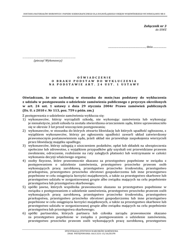 DOSTAWA MATERIAŁÓW BIUROWYCH I PAPIERU KSEROGRAFICZNEGO DLA DOLNOŚLĄSKIEGO URZĘDU WOJEWÓDZKIEGO WE WROCŁAWIU NR II Załącznik nr 3 do SIWZ ........................................................., dnia .................... ……………………………………………………………. (pieczęć Wykonawcy) OŚWIADCZENIE O BRAKU PODSTAW DO WYKLUCZENIA NA PODSTAWIE ART. 24 UST. 1 USTAWY Oświadczam, że nie zachodzą w stosunku do mnie/nas podstawy do wykluczenia z udziału w postępowaniu o udzielenie zamówienia publicznego z przyczyn określonych w art. 24 ust. 1 ustawy z dnia 29 stycznia 2004r Prawo zamówień publicznych (Dz. U. z 2010 r. Nr 113, poz. 759 z późn. zm.) Z postępowania o udzielenie zamówienia wyklucza się: 1) wykonawców, którzy wyrządzili szkodę, nie wykonując zamówienia lub wykonując je nienależycie, jeżeli szkoda ta została stwierdzona orzeczeniem sądu, które uprawomocniło się w okresie 3 lat przed wszczęciem postępowania; 2) wykonawców, w stosunku do których otwarto likwidację lub których upadłość ogłoszono, z wyjątkiem wykonawców, którzy po ogłoszeniu upadłości zawarli układ zatwierdzony prawomocnym postanowieniem sądu, jeżeli układ nie przewiduje zaspokojenia wierzycieli przez likwidację majątku upadłego; 3) wykonawców, którzy zalegają z uiszczeniem podatków, opłat lub składek na ubezpieczenia społeczne lub zdrowotne, z wyjątkiem przypadków gdy uzyskali oni przewidziane prawem zwolnienie, odroczenie, rozłożenie na raty zaległych płatności lub wstrzymanie w całości wykonania decyzji właściwego organu; 4) osoby fizyczne, które prawomocnie skazano za przestępstwo popełnione w związku z postępowaniem o udzielenie zamówienia, przestępstwo przeciwko prawom osób wykonujących pracę zarobkową, przestępstwo przeciwko środowisku, przestępstwo przekupstwa, przestępstwo przeciwko obrotowi gospodarczemu lub inne przestępstwo popełnione w celu osiągnięcia korzyści majątkowych, a także za przestępstwo skarbowe lub przestępstwo udziału w zorganizowanej grupie albo związku mających na celu popełnienie przestępstwa lub przestępstwa skarbowego; 5) spółki jawne, których wspólnika prawomocnie skazano za przestępstwo popełnione w związku z postępowaniem o udzielenie zamówienia, przestępstwo przeciwko prawom osób wykonujących pracę zarobkową, przestępstwo przeciwko środowisku, przestępstwo przekupstwa, przestępstwo przeciwko obrotowi gospodarczemu lub inne przestępstwo popełnione w celu osiągnięcia korzyści majątkowych, a także za przestępstwo skarbowe lub przestępstwo udziału w zorganizowanej grupie albo związku mających na celu popełnienie przestępstwa lub przestępstwa skarbowego; 6) spółki partnerskie, których partnera lub członka zarządu prawomocnie skazano za przestępstwo popełnione w związku z postępowaniem o udzielenie zamówienia, przestępstwo przeciwko prawom osób wykonujących pracę zarobkową, przestępstwo SPECYFIKACJA ISTOTNYCH WARUNKÓW ZAMÓWIENIA ZNAK POSTĘPOWANIA: OA.II.3231-15/10/ZP/PN DOSTAWA MATERIAŁÓW BIUROWYCH I PAPIERU KSEROGRAFICZNEGO DLA DOLNOŚLĄSKIEGO URZĘDU WOJEWÓDZKIEGO WE WROCŁAWIU NR II przeciwko środowisku, przestępstwo przekupstwa, przestępstwo przeciwko obrotowi gospodarczemu lub inne przestępstwo popełnione w celu osiągnięcia korzyści majątkowych, a także za przestępstwo skarbowe lub przestępstwo udziału w zorganizowanej grupie albo związku mających na celu popełnienie przestępstwa lub przestępstwa skarbowego; 7) spółki komandytowe oraz spółki komandytowo-akcyjne, których komplementariusza prawomocnie skazano za przestępstwo popełnione w związku z postępowaniem o udzielenie zamówienia, przestępstwo przeciwko prawom osób wykonujących pracę zarobkową, przestępstwo przeciwko środowisku, przestępstwo przekupstwa, przestępstwo przeciwko obrotowi gospodarczemu lub inne przestępstwo popełnione w celu osiągnięcia korzyści majątkowych, a także za przestępstwo skarbowe lub przestępstwo udziału w zorganizowanej grupie albo związku mających na celu popełnienie przestępstwa lub przestępstwa skarbowego; 8) osoby prawne, których urzędującego członka organu zarządzającego prawomocnie skazano za przestępstwo popełnione w związku z postępowaniem o udzielenie zamówienia, przestępstwo przeciwko prawom osób wykonujących pracę zarobkową, przestępstwo przeciwko środowisku, przestępstwo przekupstwa, przestępstwo przeciwko obrotowi gospodarczemu lub inne przestępstwo popełnione w celu osiągnięcia korzyści majątkowych, a także za przestępstwo skarbowe lub przestępstwo udziału w zorganizowanej grupie albo związku mających na celu popełnienie przestępstwa lub przestępstwa skarbowego; 9) podmioty zbiorowe, wobec których sąd orzekł zakaz ubiegania się o zamówienia na podstawie przepisów o odpowiedzialności podmiotów zbiorowych za czyny zabronione pod groźbą kary; Wypełnić w przypadku osób fizycznych / w pozostałym przypadku skreślić OŚWIADCZENIE OSOBY FIZYCZNEJ O BRAKU PODSTAW DO WYKLUCZENIA Z POSTĘPOWANIA O UDZIELENIE ZAMÓWIENIA W ZAKRESIE ART. 24 UST. 1 PKT. 2 USTAWY PZP. Ja, niżej podpisany …………………………………………..............……., prowadzący działalność gospodarczą Imię, nazwisko na podstawie wpisu do ewidencji działalności gospodarczej numer ……............................ prowadzonej przez ……………………………………………...................................................................………….............. pod nazwą: ……………………………………...........................………………….………….................…………………………, z siedzibą w(e) ….....………………………………., ul. ................................................................................ oświadczam, że nie podlegam wykluczeni