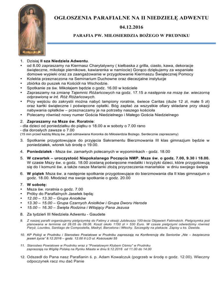 OGŁOSZENIA PARAFIALNE NA II NIEDZIELĘ ADWENTU 04.12.2016 PARAFIA PW. MIŁOSIERDZIA BOŻEGO W PRUDNIKU 1. Dzisiaj II sza Niedziela Adwentu. • od 8.00 zapraszamy na Kiermasz Charytatywny ( kiełbaska z grilla, ciasto, kawa, dekoracje świąteczne, mikołaje piernikowe, kawiarenka w namiocie) Gorąco dziękujemy za wspaniałe domowe wypieki oraz za zaangażowanie w przygotowanie Kiermaszu Świątecznej Pomocy • Kolekta przeznaczona na Seminarium Duchowne oraz diecezjalne instytucje • zbiórka do puszek na Kościół na Wschodzie. • Spotkanie ze św. Mikołajem będzie o godz. 16.00 w kościele • Zapraszamy na zmianę Tajemnic Różańcowych na godz. 17.15 a następnie na mszę św. wieczorną odprawioną w int. Róż Różańcowych. • Przy wejściu do zakrystii można nabyć lampiony roratnie, świece Caritas (duże 12 zł, małe 5 zł) oraz kartki świąteczne i poświęcone opłatki. Bóg zapłać za wszystkie ofiary składane przy okazji nabywania opłatków – przeznaczamy je na potrzeby naszego kościoła • Polecamy również nowy numer Gościa Niedzielnego i Małego Gościa Niedzielnego 2. Zapraszamy na Msze św. Roratnie: - dla dzieci od poniedziałku do piątku o 18.00 a w soboty o 7.00 rano - dla dorosłych zawsze o 7.00 (15 min przed każdą Mszą św. jest odmawiana Koronka do Miłosierdzia Bożego. Serdecznie zapraszamy) 3. Spotkanie przygotowujące do przyjęcia Sakramentu Bierzmowania III klas gimnazjum będzie w poniedziałek, wtorek lub środę o 19.00. 4. Poniedziałek - Msza św. zamarłych polecanych w wypominkach - godz. 18.00 5. W czwartek – uroczystość Niepokalanego Poczęcia NMP. Msze św. o godz. 7.00, 9.30 i 18.00. W czasie Mszy św. o godz. 18.00 zostaną poświęcone medaliki i krzyżyki dzieci, które przygotowują się do I komunii św. a także nasze Marianki złożą przyrzeczenia mariańskie w dniu swojego święta 6. W piątek Msza św. a następnie spotkanie przygotowujące do bierzmowania dla II klas gimnazjum o godz. 18.00. Młodzież ma swoje spotkanie o godz. 20.00 7. • • • • • W sobotę: Msza św. roratnia o godz. 7.00 Próby do Parafialnych Jasełek będą: 12.00 – 13.30 – Grupa Aniołków 13.30 – 15.00 – Grupa Czarnych Aniołków i Grupa Dworu Heroda 15.00 – 16.30 – Święta Rodzina i Witający Pana Jezusa 8. Za tydzień III Niedziela Adwentu - Gaudete 9. Z naszej parafii organizujemy pielgrzymkę do Fatimy z okazji Jubileuszu 100-lecia Objawień Fatimskich. Pielgrzymka jest planowana w terminie od 28.05 do 09.06. Koszt około 1150 zł + 530 Euro. W czasie pielgrzymi odwiedzimy również Paryż, Lourdes, Santiago de Compostella, Madryt, Barcelona i Włochy. Szczegóły na plakacie. Zapisy u ks. Dawida. 10. KP Policji w Prudniku i Starostwo Powiatowe w Prudniku zapraszają na Konferencję dla Seniorów „Nie – bezpieczna jesień życia” 8.12.2016 – godz. 12.00 II LO ul. Kościuszki 55 11. Starostwo Powiatowe w Prudniku wraz z "Powiatowym Klubem Ośmiu" w Prudniku zapraszają na Wigilię Polską na Rynku Miasta w dniu 9.12.2016 od 11.00 do 14.00 12. Odszedł do Pana nasz Parafianin ś. p. Adam Kowalczuk (pogrzeb w środę o godz. 12.00). Wieczny odpoczynek racz mu dać Panie ZAPOWIEDZI PRZEDŚLUBNE 1. Lizak Michał –Trojniak Ewa (I) 2. Dyc Marcin – Cibis Patrycja (I)