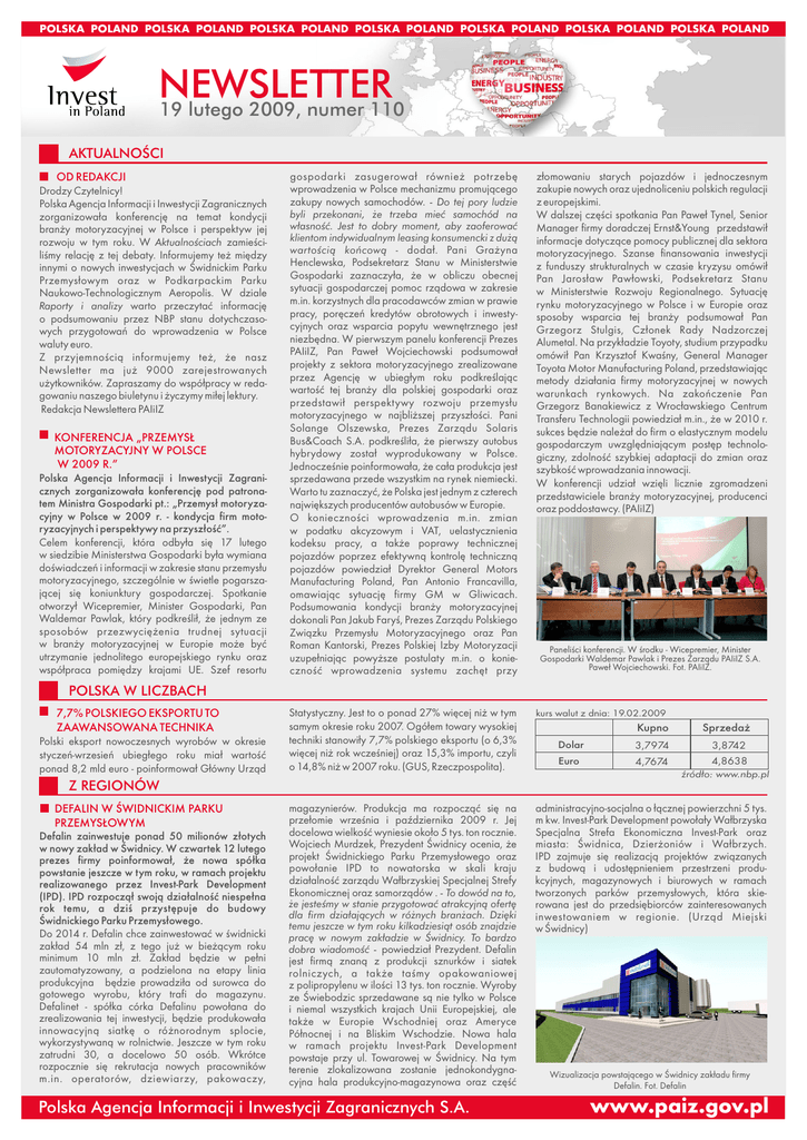 POLSKA POLAND POLSKA POLAND POLSKA POLAND POLSKA POLAND POLSKA POLAND POLSKA POLAND POLSKA POLAND NEWSLETTER 19 lutego 2009, numer 110 AKTUALNOŚCI OD REDAKCJI Drodzy Czytelnicy! Polska Agencja Informacji i Inwestycji Zagranicznych zorganizowała konferencję na temat kondycji branży motoryzacyjnej w Polsce i perspektyw jej rozwoju w tym roku. W Aktualnościach zamieściliśmy relację z tej debaty. Informujemy też między innymi o nowych inwestycjach w Świdnickim Parku Przemysłowym oraz w Podkarpackim Parku Naukowo-Technologicznym Aeropolis. W dziale Raporty i analizy warto przeczytać informację o podsumowaniu przez NBP stanu dotychczasowych przygotowań do wprowadzenia w Polsce waluty euro. Z przyjemnością informujemy też, że nasz Newsletter ma już 9000 zarejestrowanych użytkowników. Zapraszamy do współpracy w redagowaniu naszego biuletynu i życzymy miłej lektury. Redakcja Newslettera PAIiIZ KONFERENCJA „PRZEMYSŁ MOTORYZACYJNY W POLSCE W 2009 R.” Polska Agencja Informacji i Inwestycji Zagranicznych zorganizowała konferencję pod patronatem Ministra Gospodarki pt.: „Przemysł motoryzacyjny w Polsce w 2009 r. - kondycja firm motoryzacyjnych i perspektywy na przyszłość”. Celem konferencji, która odbyła się 17 lutego w siedzibie Ministerstwa Gospodarki była wymiana doświadczeń i informacji w zakresie stanu przemysłu motoryzacyjnego, szczególnie w świetle pogarszającej się koniunktury gospodarczej. Spotkanie otworzył Wicepremier, Minister Gospodarki, Pan Waldemar Pawlak, który podkreślił, że jednym ze sposobów przezwyciężenia trudnej sytuacji w branży motoryzacyjnej w Europie może być utrzymanie jednolitego europejskiego rynku oraz współpraca pomiędzy krajami UE. Szef resortu gospodarki zasugerował również potrzebę wprowadzenia w Polsce mechanizmu promującego zakupy nowych samochodów. - Do tej pory ludzie byli przekonani, że trzeba mieć samochód na własność. Jest to dobry moment, aby zaoferować klientom indywidualnym leasing konsumencki z dużą wartością końcową - dodał. Pani Grażyna Henclewska, Podsekretarz Stanu w Ministerstwie Gospodarki zaznaczyła, że w obliczu obecnej sytuacji gospodarczej pomoc rządowa w zakresie m.in. korzystnych dla pracodawców zmian w prawie pracy, poręczeń kredytów obrotowych i inwestycyjnych oraz wsparcia popytu wewnętrznego jest niezbędna. W pierwszym panelu konferencji Prezes PAIiIZ, Pan Paweł Wojciechowski podsumował projekty z sektora motoryzacyjnego zrealizowane przez Agencję w ubiegłym roku podkreślając wartość tej branży dla polskiej gospodarki oraz przedstawił perspektywy rozwoju przemysłu motoryzacyjnego w najbliższej przyszłości. Pani Solange Olszewska, Prezes Zarządu Solaris Bus&Coach S.A. podkreśliła, że pierwszy autobus hybrydowy został wyprodukowany w Polsce. Jednocześnie poinformowała, że cała produkcja jest sprzedawana przede wszystkim na rynek niemiecki. Warto tu zaznaczyć, że Polska jest jednym z czterech największych producentów autobusów w Europie. O konieczności wprowadzenia m.in. zmian w podatku akcyzowym i VAT, uelastycznienia kodeksu pracy, a także poprawy technicznej pojazdów poprzez efektywną kontrolę techniczną pojazdów powiedział Dyrektor General Motors Manufacturing Poland, Pan Antonio Francavilla, omawiając sytuację firmy GM w Gliwicach. Podsumowania kondycji branży motoryzacyjnej dokonali Pan Jakub Faryś, Prezes Zarządu Polskiego Związku Przemysłu Motoryzacyjnego oraz Pan Roman Kantorski, Prezes Polskiej Izby Motoryzacji uzupełniając powyższe postulaty m.in. o konieczność wprowadzenia systemu zachęt przy złomowaniu starych pojazdów i jednoczesnym zakupie nowych oraz ujednoliceniu polskich regulacji z europejskimi. W dalszej części spotkania Pan Paweł Tynel, Senior Manager firmy doradczej Ernst&Young przedstawił informacje dotyczące pomocy publicznej dla sektora motoryzacyjnego. Szanse finansowania inwestycji z funduszy strukturalnych w czasie kryzysu omówił Pan Jarosław Pawłowski, Podsekretarz Stanu w Ministerstwie Rozwoju Regionalnego. Sytuację rynku motoryzacyjnego w Polsce i w Europie oraz sposoby wsparcia tej branży podsumował Pan Grzegorz Stulgis, Członek Rady Nadzorczej Alumetal. Na przykładzie Toyoty, studium przypadku omówił Pan Krzysztof Kwaśny, General Manager Toyota Motor Manufacturing Poland, przedstawiając metody działania firmy motoryzacyjnej w nowych warunkach rynkowych. Na zakończenie Pan Grzegorz Banakiewicz z Wrocławskiego Centrum Transferu Technologii powiedział m.in., że w 2010 r. sukces będzie należał do firm o elastycznym modelu gospodarczym uwzględniającym postęp technologiczny, zdolność szybkiej adaptacji do zmian oraz szybkość wprowadzania innowacji. W konferencji udział wzięli licznie zgromadzeni przedstawiciele branży motoryzacyjnej, producenci oraz poddostawcy. (PAIiIZ) Paneliści konferencji. W środku - Wicepremier, Minister Gospodarki Waldemar Pawlak i Prezes Zarządu PAIiIZ S.A. Paweł Wojciechowski. Fot. PAIiIZ. POLSKA W LICZBACH 7,7% POLSKIEGO EKSPORTU TO ZAAWANSOWANA TECHNIKA Polski eksport nowoczesnych wyrobów w okresie styczeń-wrzesień ubiegłego roku miał wartość ponad 8,2 mld euro - poinformował Główny Urząd Statystyczny. Jest to o ponad 27% więcej niż w tym samym okresie roku 2007. Ogółem towary wysokiej techniki stanowiły 7,7% polskiego eksportu (o 6,3% więcej niż rok wcześniej) oraz 15,3% importu, czyli o 14,8% niż w 2007 roku. (GUS, Rzeczpospolita). kurs walut z dnia: 19.02.2009 magazynierów. Produkcja ma rozpocząć się na przełomie września i października 2009 r. Jej docelowa wielkość wyniesie około 5 tys. ton rocznie. Wojciech Murdzek, Prezydent Świdnicy ocenia, że projekt Świdnickiego Parku Przemysłowego oraz powołanie IPD to nowatorska w skali kraju działalność zarządu Wałbrzyskiej Specjalnej Strefy Ekonomicznej oraz samorządów . - To dowód na to, administracyjno-socjalna o łą