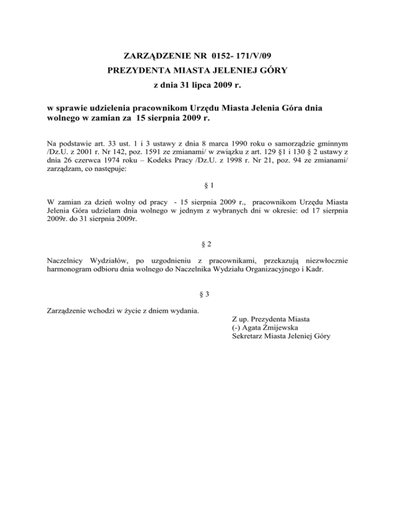 ZARZĄDZENIE NR 0152- 171/V/09 PREZYDENTA MIASTA JELENIEJ GÓRY z dnia 31 lipca 2009 r. w sprawie udzielenia pracownikom Urzędu Miasta Jelenia Góra dnia wolnego w zamian za 15 sierpnia 2009 r. Na podstawie art. 33 ust. 1 i 3 ustawy z dnia 8 marca 1990 roku o samorządzie gminnym /Dz.U. z 2001 r. Nr 142, poz. 1591 ze zmianami/ w związku z art. 129 §1 i 130 § 2 ustawy z dnia 26 czerwca 1974 roku – Kodeks Pracy /Dz.U. z 1998 r. Nr 21, poz. 94 ze zmianami/ zarządzam, co następuje: §1 W zamian za dzień wolny od pracy - 15 sierpnia 2009 r., pracownikom Urzędu Miasta Jelenia Góra udzielam dnia wolnego w jednym z wybranych dni w okresie: od 17 sierpnia 2009r. do 31 sierpnia 2009r. §2 Naczelnicy Wydziałów, po uzgodnieniu z pracownikami, przekazują niezwłocznie harmonogram odbioru dnia wolnego do Naczelnika Wydziału Organizacyjnego i Kadr. §3 Zarządzenie wchodzi w Ŝycie z dniem wydania. Z up. Prezydenta Miasta (-) Agata śmijewska Sekretarz Miasta Jeleniej Góry