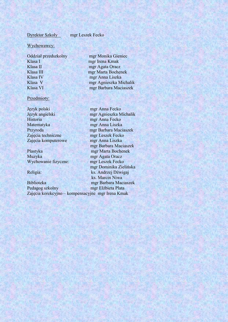 Dyrektor Szkoły mgr Leszek Fecko Wychowawcy: Oddział przedszkolny Klasa I Klasa II Klasa III Klasa IV Klasa V Klasa VI mgr Monika Gieniec mgr Irena Kmak mgr Agata Oracz mgr Marta Bochenek mgr Anna Liszka mgr Agnieszka Michalik mgr Barbara Maciaszek Przedmioty: Język polski Język angielski Historia Matematyka Przyroda Zajęcia techniczne Zajęcia komputerowe mgr Anna Fecko mgr Agnieszka Michalik mgr Anna Fecko mgr Anna Liszka mgr Barbara Maciaszek mgr Leszek Fecko mgr Anna Liszka mgr Barbara Maciaszek Plastyka mgr Marta Bochenek Muzyka mgr Agata Oracz Wychowanie fizyczne: mgr Leszek Fecko mgr Dominika Zielińska Religia: ks. Andrzej Dźwigaj ks. Marcin Niwa Biblioteka mgr Barbara Maciaszek Pedagog szkolny mgr Elżbieta Plata Zajęcia korekcyjno – kompensacyjne mgr Irena Kmak
