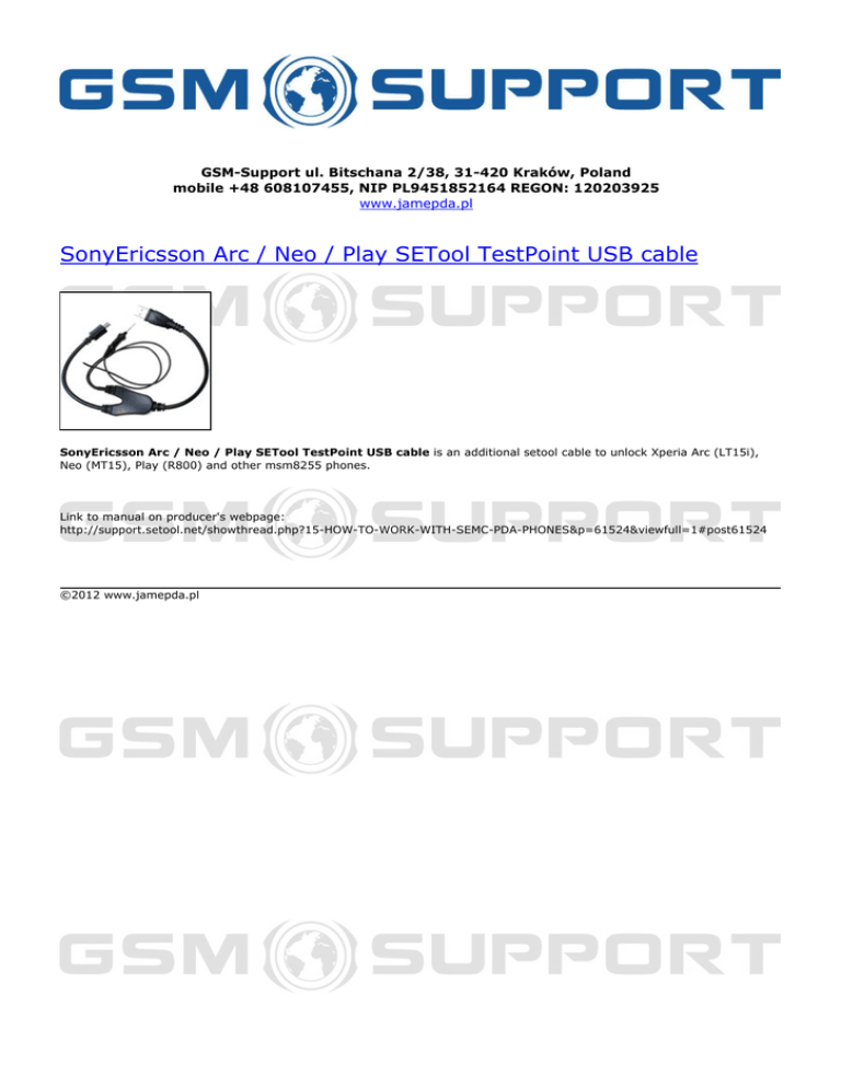 GSM-Support ul. Bitschana 2/38, 31-420 Kraków, Poland mobile +48 608107455, NIP PL9451852164 REGON: 120203925 www.jamepda.pl SonyEricsson Arc / Neo / Play SETool TestPoint USB cable SonyEricsson Arc / Neo / Play SETool TestPoint USB cable is an additional setool cable to unlock Xperia Arc (LT15i), Neo (MT15), Play (R800) and other msm8255 phones. Link to manual on producer's webpage: http://support.setool.net/showthread.php?15-HOW-TO-WORK-WITH-SEMC-PDA-PHONES&p=61524&viewfull=1#post61524 ©2012 www.jamepda.pl Powered by TCPDF (www.tcpdf.org)
