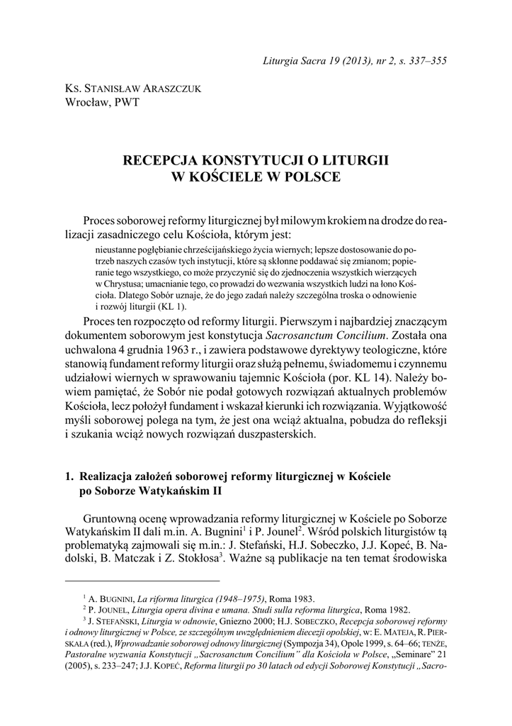 Liturgia Sacra 19 (2013), nr 2, s. 337–355 KS. STANISŁAW ARASZCZUK Wrocław, PWT RECEPCJA KONSTYTUCJI O LITURGII W KOŚCIELE W POLSCE Proces soborowej reformy liturgicznej był milowym krokiem na drodze do realizacji zasadniczego celu Kościoła, którym jest: nieustanne pogłębianie chrześcijańskiego życia wiernych; lepsze dostosowanie do potrzeb naszych czasów tych instytucji, które są skłonne poddawać się zmianom; popieranie tego wszystkiego, co może przyczynić się do zjednoczenia wszystkich wierzących w Chrystusa; umacnianie tego, co prowadzi do wezwania wszystkich ludzi na łono Kościoła. Dlatego Sobór uznaje, że do jego zadań należy szczególna troska o odnowienie i rozwój liturgii (KL 1). Proces ten rozpoczęto od reformy liturgii. Pierwszym i najbardziej znaczącym dokumentem soborowym jest konstytucja Sacrosanctum Concilium. Została ona uchwalona 4 grudnia 1963 r., i zawiera podstawowe dyrektywy teologiczne, które stanowią fundament reformy liturgii oraz służą pełnemu, świadomemu i czynnemu udziałowi wiernych w sprawowaniu tajemnic Kościoła (por. KL 14). Należy bowiem pamiętać, że Sobór nie podał gotowych rozwiązań aktualnych problemów Kościoła, lecz położył fundament i wskazał kierunki ich rozwiązania. Wyjątkowość myśli soborowej polega na tym, że jest ona wciąż aktualna, pobudza do refleksji i szukania wciąż nowych rozwiązań duszpasterskich. 1. Realizacja założeń soborowej reformy liturgicznej w Kościele po Soborze Watykańskim II Gruntowną ocenę wprowadzania reformy liturgicznej w Kościele po Soborze Watykańskim II dali m.in. A. Bugnini1 i P. Jounel2. Wśród polskich liturgistów tą problematyką zajmowali się m.in.: J. Stefański, H.J. Sobeczko, J.J. Kopeć, B. Nadolski, B. Matczak i Z. Stokłosa3. Ważne są publikacje na ten temat środowiska 1 A. BUGNINI, La riforma liturgica (1948–1975), Roma 1983. P. JOUNEL, Liturgia opera divina e umana. Studi sulla reforma liturgica, Roma 1982. 3 J. STEFAŃSKI, Liturgia w odnowie, Gniezno 2000; H.J. SOBECZKO, Recepcja soborowej reformy i odnowy liturgicznej w Polsce, ze szczególnym uwzględnieniem diecezji opolskiej, w: E. MATEJA, R. PIERSKAŁA (red.), Wprowadzanie soborowej odnowy liturgicznej (Sympozja 34), Opole 1999, s. 64–66; TENŻE, Pastoralne wyzwania Konstytucji „Sacrosanctum Concilium” dla Kościoła w Polsce, „Seminare” 21 (2005), s. 233–247; J.J. KOPEĆ, Reforma liturgii po 30 latach od edycji Soborowej Konstytucji „Sacro2 338 KS. STANISŁAW ARASZCZUK naukowców związanych z Instytutem Liturgiczno-Homiletycznym Katolickiego Uniwersytetu Lubelskiego. Instytut ten zorganizował sympozjum na temat reformy liturgicznej, a jego owoce zostały opublikowane w „Rocznikach Teologicznych”4. Z podobną inicjatywą wyszło środowisko Wydziału Teologicznego Uniwersytetu Opolskiego, które w Kamieniu Śląskim, w dniach 15–17.03.1999 r., zorganizowało sympozjum na temat wprowadzenia soborowej odnowy liturgicznej5. Powstały także całościowe opracowania dotyczące recepcji zasad odnowy liturgicznej w poszczególnych diecezjach w Polsce6. Od samego początku wprowadzenie reformy liturgicznej napotykało na pewne trudności, a nawet formy otwartej kontestacji wobec ducha odnowy, reprezentowanego przez konstytucję liturgiczną oraz wytyczne duszpasterskiej władzy kościelnej, promującej zasady tego dokumentu. Pewne kręgi duchownych i świeckich opowiedziały się za zachowaniem dawnych form liturgicznych, widząc w nich gwarancję w przekazie wiary. W sporadycznych przypadkach podczas realizacji reformy pojawiły się mniej lub bardziej poważne dewiacje u tych, którzy wprowadzali nowości podyktowane fantazją w postaci wymyślonych obrzędów, nowych rytów sprawowania sakramentów, własnych modlitw eucharystycznych, pozwalając sobie niekiedy na zastępowanie tekstów biblijnych sentencjami świeckimi. U źródeł tych trudności leży sprawa podejścia do reformy liturgicznej7. sanctum Concilium”, w: H.J. SOBECZKO (red.), Studia liturgiczno-pastoralne, t. II, Opole 1994, s. 23–24; B. NADOLSKI, Recepcja Konstytucji „Sacrosanctum Concilium” w Polsce, RBL 39 (1986), s. 15–20; B. MATCZAK, Cipriano Vagaggini OSB i reforma liturgiczna, Tyniec 2013; Z. STOKŁOSA, Die Rezeption der Liturgiereform in Polen nach dem Zweiten Vatikanischen Konzil, w: J. BÄRSCH, W. HAUNERLAND (red.), Liturgiereform und Bistum. Gottesdienstliche Erneuerung nach dem Zweiten Vatikanischen Konzil, Regensburg 2013, s. 487–512. 4 Por. artykuły liturgistów polskich zawarte w „Roczniki Teologiczne” 40 (2003), z. 8: J.J. KOPEĆ, Reforma liturgii Soboru Watykańskiego II w czterdziestą rocznicę ogłoszenia konstytucji „Sacrosanctum Concilium”, s. 11–48; S. KOPEREK, Odnowiona liturgia szansą pogłębienia życia duchowego i apostolatu wspólnot zakonnych, s. 267–277; H.J. SOBECZKO, Inicjatywy Komisji Liturgicznej Episkopatu Polski dotyczące wprowadzenia soborowej reformy liturgicznej w Polsce, s. 69–88; H. BOLCZYK, Liturgia ruchów eklezjalnych w życiu wspólnoty parafialnej, s. 278–288; B. NADOLSKI, Liturgia jako serce życia w seminarium, s. 341–346; G. MAJKA, Odnowa liturgii w Zakonie Kapucynów w Polsce po Soborze Watykańskim II, s. 347–352; A. RUTKOWSKI, Uporządkowanie w Kościele w Polsce dni świątecznych, s. 355–368; S. CICHY, Reforma liturgiczna w Kościele katowickim w latach 1975–2000, s. 289–295; G. BERESZYŃSKI, Odnowa liturgii w archidiecezji warszawskiej, s. 296–309; J. SROKA, Reforma liturgii w diecezji przemyskiej (dawniej i dziś), s. 310–318; A. ROJEWSKI, Recepcja reformy liturgii w diecezji płockiej po Soborze Watykańskim II, s. 319–325; P. PETRYK, Reforma liturgiczna w diecezji lubelskiej, s. 326–333; K. MATWIEJUK, Reforma liturgiczna w diecezji siedleckiej, s. 334–339; M. TSCHUSCHKE, Reforma liturgii w archidiecezji poznańskiej, s. 340–341. 5 MATEJA, PIERSKAŁA (red.), Wprowadzenie sobo