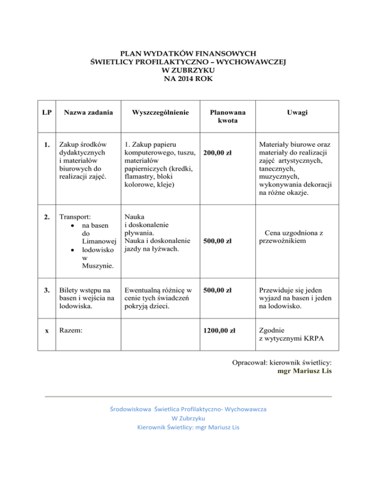 PLAN WYDATKÓW FINANSOWYCH ŚWIETLICY PROFILAKTYCZNO – WYCHOWAWCZEJ W ZUBRZYKU NA 2014 ROK LP Nazwa zadania Wyszczególnienie Zakup środków dydaktycznych i materiałów biurowych do realizacji zajęć. 1. Zakup papieru komputerowego, tuszu, materiałów papierniczych (kredki, flamastry, bloki kolorowe, kleje) Transport: na basen do Limanowej lodowisko w Muszynie. Nauka i doskonalenie pływania. Nauka i doskonalenie jazdy na łyżwach. 3. Bilety wstępu na 1. basen i wejścia na lodowiska. 2. Ewentualną różnicę w cenie tych świadczeń pokryją dzieci. x Razem: 1. 2. Planowana kwota Uwagi Materiały biurowe oraz materiały do realizacji zajęć artystycznych, tanecznych, muzycznych, wykonywania dekoracji na różne okazje. 200,00 zł Cena uzgodniona z przewoźnikiem 500,00 zł 500,00 zł Przewiduje się jeden wyjazd na basen i jeden na lodowisko. 1200,00 zł Zgodnie z wytycznymi KRPA Opracował: kierownik świetlicy: mgr Mariusz Lis Środowiskowa Świetlica Profilaktyczno- Wychowawcza W Zubrzyku Kierownik Świetlicy: mgr Mariusz Lis PLAN WYDATKÓW FINANSOWYCH ŚWIETLICY PROFILAKTYCZNO – WYCHOWAWCZEJ W ZUBRZYKU NA 2014 ROK NA 2014 ROK – wersja 2 – sprzęt za 1000,00 zł – rekompensata za wynajem obiektu LP Nazwa zadania Wyszczególnienie Planowana kwota Uwagi 1. Zakup gir planszowych, przyborów do zabaw i gier ruchowych. Niezbędne do prowadzenia zajęć w zakresie rozwijania zdolności umysłowych jak i fizycznych. 550 zł Brak takich pomocy w świetlicy. 2. Zakup drukarki Urządzenie potrzebne do wykonywania dokumentacji, sprawozdań, zestawień i prowadzenia zajęć. 450 zł Świetlica nie posiada takiego sprzętu x Razem 1000,00 zł Zgodnie z wytycznymi KRPA Środowiskowa Świetlica Profilaktyczno- Wychowawcza W Zubrzyku Kierownik Świetlicy: mgr Mariusz Lis