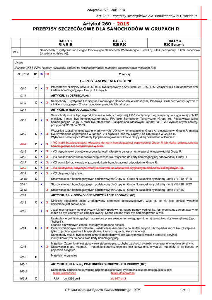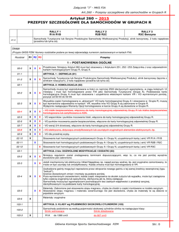 Załącznik “J” - MKS FIA Art.260 – Przepisy szczegółowe dla samochodów w Grupach R Artykuł 260 – 2015 PRZEPISY SZCZEGÓŁOWE DLA SAMOCHODÓW W GRUPACH R RALLY 1 R1A R1B RALLY 2 R2B R2C RALLY 3 R3C Benzyna Samochody Turystyczne lub Seryjne Produkcyjne Samochody Wielkoseryjnej Produkcji, silnik benzynowy, 2 koła napędowe (przednia lub tylna oś). 01-3 Uwaga (Przypis GKSS PZM: Numery rozdziałów podane po lewej odpowiadają numerom zastosowanym w kartach FIA) Rozdział R1 R2 R3 Przepisy 1 – POSTANOWIENIA OGÓLNE 00-0 X X X ARTYKUŁ 1 : DEFINICJA (01) 01-1 01-2 Przedmowa: Niniejszy Artykuł 260 musi być stosowany z Artykułami 251, 252 i 253 Załącznika J oraz odpowiednimi kartami homologacyjnymi Grupy R, Grupy A. X X X Samochody Turystyczne lub Seryjne Produkcyjne Samochody Wielkoseryjnej Produkcji, silnik benzynowy (łącznie z silnikiem rotacyjnym), 2 koła napędowe (przednia lub tylna oś). 02-1 ARTYKUŁ 2: HOMOLOGACJA (02) 02-2 X X X Samochody muszą być wyprodukowane w ilości co najmniej 2500 identycznych egzemplarzy, w ciągu kolejnych 12 miesięcy i musi być homologowane przez FIA jako Samochody Turystyczne (Grupa A). Podstawowa karta homologacyjna Grupy A musi być stosowana i uzupełniona właściwymi kartami VR i VO wymienionymi poniżej, pozycje od 02-03 do 02-09. 02-3 X X X Wszystkie części homologowane w „aktywnych” VO karty homologacyjnej Grupy A i stosowane w Grupie R, muszą być wymienione odpowiednio w kartach VR, wszelkie inne VO Grupy A są zabronione w Grupie R. Wyłącznie następujące Warianty Opcji homologowane w karcie Grupy A są dozwolone w Grupie R. 02-4 X X X - VO klatki bezpieczeństwa, włączona do karty homologacyjnej odpowiedniej Grupy R lub klatka bezpieczeństwa homologowana lub certyfikowana w ASN. 02-5 X X X - VO wsporników i punktów mocowania foteli, włączone do karty homologacyjnej odpowiedniej Grupy R. 02-6 X X X - VO punków mocowania pasów bezpieczeństwa, włączone do karty homologacyjnej odpowiedniej Grupy R. 02-7 X X X - VO wersji 2/4 drzwiowej, włączone do karty homologacyjnej odpowiedniej Grupy R. 02-8 X X X - VO elektryczna, dotycząca zmodyfikowanych lub usuniętych oryginalnych elementów elektrycznych, itp. 02-9 X X X - VO dla przedniej szyby. 02-10 X Stosowanie kart homologacyjnych podstawowych Grupy A i Grupy N, uzupełnionych kartą (-ami) VR R1A i R1B X 02-11 Stosowanie kart homologacyjnych podstawowych Grupy A i Grupy N, uzupełnionych kartą (-ami) VR R2B i R2C X 02-12 03-2 X 03-3 03-4 X 03-5 03-6 Stosowanie kart homologacyjnych podstawowych Grupy A i Grupy N, uzupełnionych kartą (-ami) VR R3C ARTYKUŁ 2 bis: DOZWOLONE MODYFIKACJE I DODATKI (03) 03-1 X X X Niniejszy regulamin został zredagowany terminami dopuszczającymi, więc to, co nie jest poniżej wyraźnie dozwolone jest zabronione. X X Jeżeli mechaniczny lub elektryczny Układ Napędowy np. napęd pompy wodnej, itp. jest oryginalne zamontowany, to może on być usunięty lub zmodyfikowany. Każda zmiana musi być homologowana w VR. X X Uszkodzone gwinty mogą być naprawione przez wkręcenie nowego gwintu o tej samej średnicy wewnętrznej (typu "helicoil"). Granice dozwolonych zmian i montaży są podane poniżej. Poza wymienionymi zezwoleniami, każda część niesprawna na skutek zużycia lub wypadku, może być zastąpiona tylko częścią oryginalną lub specyficzną, identyczną jak ta, którą zastępuje. Samochody muszą być egzemplarzami pochodzącymi bez żadnych wątpliwości z produkcji seryjnej, identyfikowanymi na podstawie karty homologacyjnej. X X Materiały: Zabronione jest stosowanie stopu magnezu, chyba że chodzi o części montowane w modelu seryjnym. Stosowanie stopu magnezu i materiału ceramicznego nie jest dozwolone, chyba że materiały te są obecne w pojeździe seryjnym. Materiały: oryginalne 103-1 ARTYKUŁ 3: KLASY wg POJEMNOŚCI SKOKOWEJ CYLINDRÓW (103) 103-2 Samochody podzielone są według pojemności skokowej cylindrów silnika na następujące klasy: Silniki wolnossące Silniki doładowane 103-3 X R1A do 1390 cm3 do 927 cm3 Główna Komisja Sportu Samochodowego PZM Str. 0 Załącznik “J” MKS FIA Art.260 – Przepisy szczegółowe dla samochodów Grupy R 103-4 X R1B ponad 1390 cm3 do 1600 cm3 powyżej 927 cm3 do 1067 cm3 103-5 X R2B ponad 1390 cm3 do 1600 cm3 powyżej 927 cm3 do 1067 cm3 103-6 X R2C ponad 1600 cm3 do 2000 cm3 powyżej 1067 cm3 do 1333 cm3 R3C ponad 1600 cm3 do 2000 cm3 powyżej 1067 cm3 do 1333 cm3 X 103-7 ARTYKUŁ 4 : LICZBA MIEJSC (106) 106-1 106-2 X X X Samochody muszą mieć co najmniej cztery miejsca do siedzenia, zgodnie z wymiarami określonymi dla Samochodów Turystycznych (Grupa A). 2 – WYMIARY, MASA 201-01 MASA MINIMALNA (201) 201-02 Samochody muszą mieć co najmniej następującą masę: 201-03 X R1A 980 Kg X R1B 1030 Kg X R2B 1030 Kg X R2C 1080 Kg R3C 1080 Kg 201-04 X 201-05 201-06 X X X PRZEŚWIT (205) 205-1 205-2 Jest to rzeczywista masa samochodu, bez kierowcy, bez pilota, bez ich wyposażenia i maksymalnie z jednym kołem zapasowym. W przypadku, gdy w samochodzie są przewożone 2 koła zapasowe, drugie koło zapasowe musi być usunięte przed ważeniem. Stosowanie balastu jest dozwolone zgodnie z Art. 252-2.2. Wszystkie zbiorniki płynów (do smarowania, chłodzenia, hamowania, ewentualnie ogrzewania) muszą być napełnione do poziomu przewidzianego przez producenta. Nie dotyczy to jednak zbiorników spryskiwacza przedniej szyby, i reflektorów świateł przednich, oraz zbiornika paliwa i zbiornika wody do spryskiwacza intercoolera (jeżeli jest homologowany), które muszą być puste. Minimalna masa samochodu może być zmierzona razem z załogą znajdująca się w kabinie (kierowca + pilot + kompletne wyposażenie kierowcy i pilota) i wynosić: minimalna masa określona w ustępach 201-03&04&05 + 160 kg. Ponadto, masa określona w ustępach 201-03&04&05 musi być również przestrzegana. X Musi być w każdej chwili większy lub równy wartości podanej w 