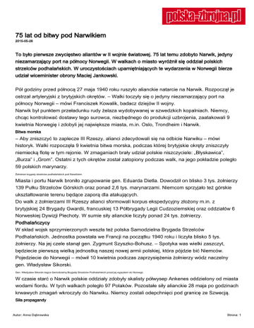 75 lat od bitwy pod Narwikiem 2015-05-28 To było pierwsze zwycięstwo aliantów w II wojnie światowej. 75 lat temu zdobyto Narwik, jedyny niezamarzający port na północy Norwegii. W walkach o miasto wyróżnił się oddział polskich strzelców podhalańskich. W uroczystościach upamiętniających te wydarzenia w Norwegii bierze udział wiceminister obrony Maciej Jankowski. Pół godziny przed północą 27 maja 1940 roku ruszyło alianckie natarcie na Narwik. Rozpoczął je ostrzał artyleryjski z brytyjskich okrętów. – Walki toczyły się o jedyny niezamarzający port na północy Norwegii – mówi Franciszek Kowalik, badacz dziejów II wojny. Narwik był punktem przeładunku rudy żelaza wydobywanej w szwedzkich kopalniach. Niemcy, chcąc kontrolować dostawy tego surowca, niezbędnego do produkcji uzbrojenia, zaatakowali 9 kwietnia Norwegię i zdobyli jej największe miasta, m.in. Oslo, Trondheim i Narwik. Bitwa morska – Aby zniszczyć to zaplecze III Rzeszy, alianci zdecydowali się na odbicie Narwiku – mówi historyk. Walki rozpoczęła 9 kwietnia bitwa morska, podczas której brytyjskie okręty zniszczyły niemiecką flotę w tym rejonie. W zmaganiach brały udział polskie niszczyciele: „Błyskawica”, „Burza” i „Grom”. Ostatni z tych okrętów został zatopiony podczas walk, na jego pokładzie poległo 59 polskich marynarzy. Żołnierze brygady strzelców podhalańskich pod Narwikiem. Miasta i portu Narwik broniło zgrupowanie gen. Eduarda Dietla. Dowodził on blisko 3 tys. żołnierzy 139 Pułku Strzelców Górskich oraz ponad 2,6 tys. marynarzami. Niemcom sprzyjało też górskie ukształtowanie terenu będące zaporą dla atakujących. Do walk z żołnierzami III Rzeszy alianci sformowali korpus ekspedycyjny złożony m.in. z brytyjskiej 24 Brygady Gwardii, francuskiej 13 Półbrygady Legii Cudzoziemskiej oraz oddziałów 6 Norweskiej Dywizji Piechoty. W sumie siły alianckie liczyły ponad 24 tys. żołnierzy. Podhalańczycy W skład wojsk sprzymierzonych weszła też polska Samodzielna Brygada Strzelców Podhalańskich. Jednostka powstała we Francji na początku 1940 roku i liczyła blisko 5 tys. żołnierzy. Na jej czele stanął gen. Zygmunt Szyszko-Bohusz. – Spotyka was wielki zaszczyt, będziecie pierwszą wielką jednostką naszej nowej armii polskiej, która pójdzie bić Niemców. Pojedziecie do Norwegii – mówił 10 kwietnia podczas zaprzysiężenia żołnierzy wódz naczelny gen. Władysław Sikorski. Gen. Władysław Sikorski żegna Samodzielną Brygadę Strzelców Podhalańskich przed jej wyjazdem do Norwegii. W czasie starć o Narwik polskie oddziały zdobyły skalisty półwysep Ankenes oddzielony od miasta wodami fiordu. W tych walkach poległo 97 Polaków. Pozostałe siły alianckie 28 maja po godzinach krwawych zmagań wkroczyły do Narwiku. Niemcy zostali odepchnięci pod granicę ze Szwecją. Siła propagandy Autor: Anna Dąbrowska Strona: 1 Alianci nie wykorzystali jednak tego zwycięstwa. Niemiecka ofensywa we Francji zmusiła ich do wycofania sił z Norwegii. Od 3 czerwca rozpoczęła się w tajemnicy przed nieprzyjacielem ewakuacja wojsk do Francji i Wielkiej Brytanii. Ostatnie oddziały, niszcząc zabudowania portu, odpłynęły z Narwiku 8 czerwca, a wieczorem tego dnia miasto znów znalazło się w rękach Niemców. Mimo to zdobycie Narwiku miało ogromne znaczenie propagandowe. – Był to pierwszy triumf aliantów w wojnie z III Rzeszą, a udział w nim Polaków przyniósł nam rozgłos i nadzieję na zwycięstwo – tłumaczy Kowalik. W 75. rocznicę tych wydarzeń polska delegacja z wiceministrem obrony Maciejem Jankowskim uczestniczyła w uroczystościach w Narwiku. Przed pomnikami upamiętniającymi bitwę oraz na cmentarzu wojennym wiceminister złożył kwiaty. Po południu spotka się z Ine Eriksen Soreide, ministrem obrony Królestwa Norwegii. Autor: Anna Dąbrowska Strona: 2