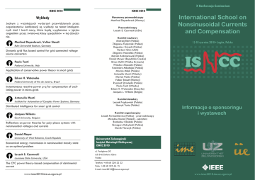 X Konferencja-Seminarium ISNCC 2010 ISNCC 2010 Wykłady Honorowy przewodniczący Manfred Depenbrock (Niemcy) Jednym z ważniejszych wydarzeń przewidzianych przez organizatorów konferencji są wykłady na temat inteligentnych sieci i teorii mocy, które będą wygłaszane w języku angielskim przez światowej klasy specjalistów w tej dziedzinie. Przewodniczący Leszek S. Czarnecki (USA) Manfred Depenbrock, Volker Staudt Ruhr-Universität Bochum, Germany Dynamic grid flux based control for grid connected voltage source converters Paolo Tenti Padova University, Italy Application of conservative power theory in smart grids Edson H. Watanabe Federal University of Rio de Janeiro, Brazil Instantaneous reactive power p-q for compensation of oscillating power in micro-grids Antonello Monti Institute for Automation of Complex Power Systems, Germany Distributed intelligence for smart grid control Jacques Willems Gent University, Belgium Reflections on power theories for poly-phase systems with nonsinusoidal voltages and currents Komitet naukowy Andrzej Bień (Polska) Zbigniew Fedyczak (Polska) Bogusław Grzesik (Polska) Herbert Ginn (USA) Zbigniew Hanzelka (Polska) Marian Kaźmierowski (Polska) Daniel Mayer (Republika Czeska) Brian Mellit (Wielka Brytania) Wiesław Miczulski (Polska) Kazimierz Mikołajuk (Polska) Marian Miłek (Polska) Antonello Monti (Włochy) Marian Pasko (Polska) Volker Staudt (Niemcy) Ryszard Strzelecki (Polska) Paulo Tenti (Włochy) Edson H. Watanabe (Brazylia) Jacques L. Willems (Belgia) Komitet doradczy Leszek Frąckowiak (Polska) Henryk Tunia (Polska) Komitet organizacyjny Leszek Furmankiewicz (Polska) - przewodniczący Mirosław Kozioł (Poland) - sekretarz Radosław Kłosiński (Polska) Grzegorz Kobyłecki (Polska) Marek Florczyk (Polska) International School on Nonsinusoidal Currents and Compensation 15-18 czerwiec 2010 • Łagów, Polska IS CC Informacje o sponsoringu i wystawach Daniel Mayer University of West Bohemia, Czech Republic Economical energy transmission in nonsinusoidal steady state as an optimal problem Leszek S. Czarnecki Louisiana State University, USA The CPC power theory-based compensation of detrimental current www.isncc2010.iee.uz.zgora.pl Uniwersytet Zielonogórski Instytut Metrologii Elektrycznej ISNCC 2010 ul. Podgórna 50 65-246 Zielona Góra Polska ime UNIWE RSY TYET ZIELONOGÓRSKI Telefon: +48 68 328 22 22 Faks: +48 68 325 46 15 E-mail: [email protected] www.isncc2010.iee.uz.zgora.pl ISNCC 2010 International School on Nonsinusoidal Currents and Compensation Celem konferencji jest zachęcenie uczestników do prowadzenia prac badawczych w tych obszarach oraz przedyskutowanie wymienionych zagadnień z punktu widzenia ich zastosowania w inteligentnych sieciach energetycznych. Znaczna część konferencji przeznaczona będzie na wykłady dotyczące tematyki NNiP. Tematyka konferencji dotyczy układów z niesiKonferencja stanowi forum dla prezentacji nowych nusoidalnymi napięciami i prądami (NNiP), a w poglądów i wyników badań jak również umożliwia szczególności właściwości energetycznych Zamek Joannitów wybudowany w XIV wieku przekazanie obecnej wiedzy o układach niesinusotakich układów, kompensacji, identyfikacji, idalnych, przez wykłady, młodszej generacji inżynierów i naukowmodelowania, metod i układów pomiarowych, jakości energii ców. Konferencja ma umożliwić również dyskusję i wymianę pogląelektrycznej jak również jej rozliczania w systemach z NNiP. Sponsoring Chcielibyśmy zachęcić Państwa do zapoznania się z możliwościami sponsoringu organizowanej konferencji, jak również prezentacji produktów oferowanych przez Państwa firmy podczas wystawy organizowanej w trakcie konferencji. Jest to niespotykana okazja do prezentacji osiągnięć na międzynarodowym forum energoelektroniki i metrologii elektrycznej. Jako sponsor konferencji będą mieli Państwo prawo np. do: • prezentacji lago firmy na internetowej stronie konferencji, • reklamy firmy w programie konferencji (1 strona , format A5), • umieszczenia logo firmy na płycie CD-ROM zawierającej materiały konferencyjne, • możliwości umieszczenia materiałów promocyjnych firmy w torbie konferencyjnej. Istnieje również możliwość wybrania tylko niektórych opcji z wymienionych powyżej. Jesteśmy także otwarci na inne propozycje sponsoringu bazujące na indywidualnym uzgodnieniu. cję na stronie internetowej konferencji wybierając opcję „Participant”. Istnieje również możliwość uczestniczenia przedstawicieli firm bez sponsoringu. W takim wypadku prosimy również o rejestrację na internetowej stronie konferencji, w sposób podany powyżej. Wystawa W ramach konferencji przewiduje się możliwość przeprowadzenia wystawy, będącej znakomitą okazją do prezentacji produktów Państwa firmy. Przewiduje się trwanie wystawy przez cały czas trwania konferencji. Istnieje również możliwość prezentacji produktów firmy przez jeden lub dwa dni. Jezioro Trześniowskie W celu rezerwacji zakwaterowania dla przedstawicieli firmy w ośrodku wypoczynkowym „Spa Morena” prosimy o rejestrację na internetowej stronie konferencji wybierając opcję „Participant”. Koszty Koszt sponsoringu zależy od ilości przywilejów, jakie chcą Państwo otrzymać. Z kolei koszt wystawy zależy od jej powierzchni, dlatego w celu uzgodnienia dokładnych szczegółów prosimy o kontakt z wymienioną poniżej osobą. Informacje kontaktowe Więcej informacji mogą Państwo znaleźć na internetowej stronie konferencji. Jeśli mają państwo dodatkowe pytania prosimy o kontakt. Osoba do kontaktów: Leszek Furmankiewicz Uniwersytet Zielonogórski Instytut Metrologii Elektrycznej Telefon: +48 68 328 2234 Faks: +48 68 325 4615 E-mail: [email protected] Jeśli zdecydują się Państwo sponsorować konferencję i chcieliby delegować na nią swojego przedstawiciela, prosimy o rejestrawww.isncc2010.iee.uz.zgora.pl Miejsce Konferencji: Spa Morena (Ła