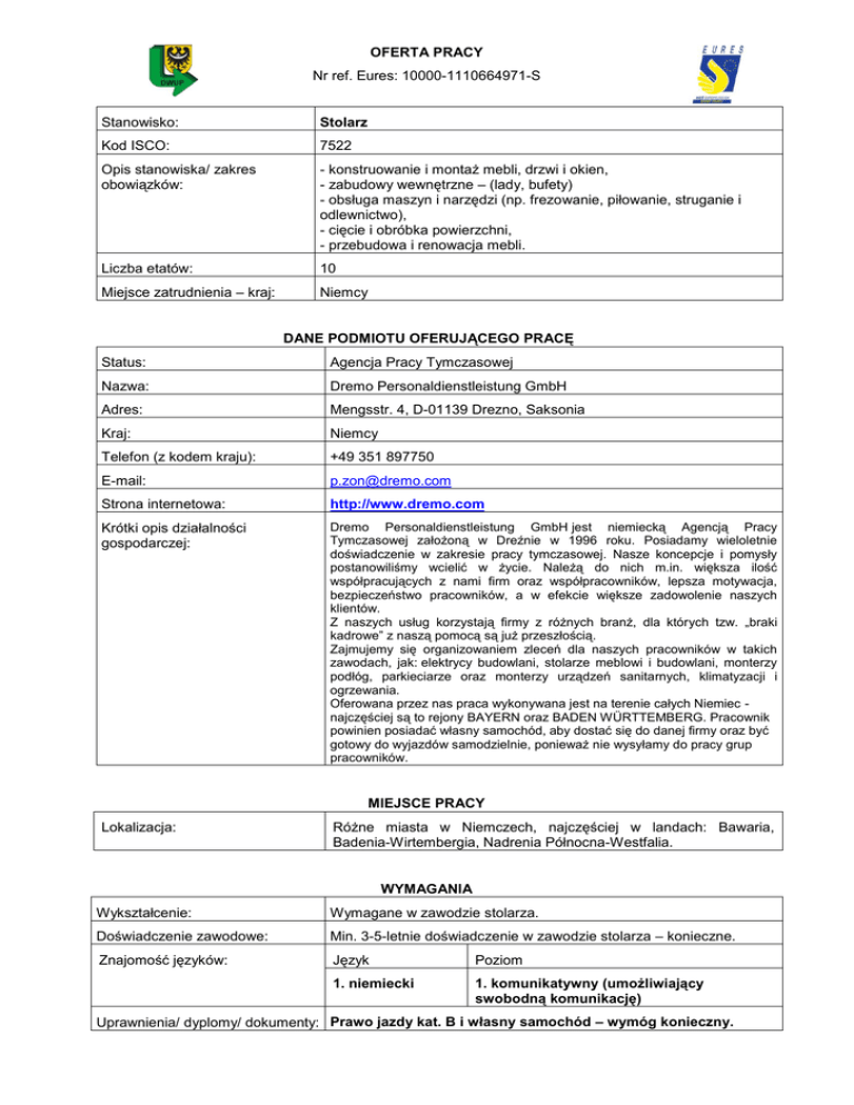 OFERTA PRACY Nr ref. Eures: 10000-1110664971-S Stanowisko: Stolarz Kod ISCO: 7522 Opis stanowiska/ zakres obowiązków: - konstruowanie i montaż mebli, drzwi i okien, - zabudowy wewnętrzne – (lady, bufety) - obsługa maszyn i narzędzi (np. frezowanie, piłowanie, struganie i odlewnictwo), - cięcie i obróbka powierzchni, - przebudowa i renowacja mebli. Liczba etatów: 10 Miejsce zatrudnienia – kraj: Niemcy DANE PODMIOTU OFERUJĄCEGO PRACĘ Status: Agencja Pracy Tymczasowej Nazwa: Dremo Personaldienstleistung GmbH Adres: Mengsstr. 4, D-01139 Drezno, Saksonia Kraj: Niemcy Telefon (z kodem kraju): +49 351 897750 E-mail: [email protected] Strona internetowa: http://www.dremo.com Krótki opis działalności gospodarczej: Dremo Personaldienstleistung GmbH jest niemiecką Agencją Pracy Tymczasowej założoną w Dreźnie w 1996 roku. Posiadamy wieloletnie doświadczenie w zakresie pracy tymczasowej. Nasze koncepcje i pomysły postanowiliśmy wcielić w życie. Należą do nich m.in. większa ilość współpracujących z nami firm oraz współpracowników, lepsza motywacja, bezpieczeństwo pracowników, a w efekcie większe zadowolenie naszych klientów. Z naszych usług korzystają firmy z różnych branż, dla których tzw. „braki kadrowe” z naszą pomocą są już przeszłością. Zajmujemy się organizowaniem zleceń dla naszych pracowników w takich zawodach, jak: elektrycy budowlani, stolarze meblowi i budowlani, monterzy podłóg, parkieciarze oraz monterzy urządzeń sanitarnych, klimatyzacji i ogrzewania. Oferowana przez nas praca wykonywana jest na terenie całych Niemiec najczęściej są to rejony BAYERN oraz BADEN WÜRTTEMBERG. Pracownik powinien posiadać własny samochód, aby dostać się do danej firmy oraz być gotowy do wyjazdów samodzielnie, ponieważ nie wysyłamy do pracy grup pracowników. MIEJSCE PRACY Lokalizacja: Różne miasta w Niemczech, najczęściej w landach: Bawaria, Badenia-Wirtembergia, Nadrenia Północna-Westfalia. WYMAGANIA Wykształcenie: Wymagane w zawodzie stolarza. Doświadczenie zawodowe: Min. 3-5-letnie doświadczenie w zawodzie stolarza – konieczne. Znajomość języków: Język Poziom 1. niemiecki 1. komunikatywny (umożliwiający swobodną komunikację) Uprawnienia/ dyplomy/ dokumenty: Prawo jazdy kat. B i własny samochód – wymóg konieczny. - mile widziana umiejętność obsługi maszyn CNC, - ostrożna i odpowiedzialna praca, - zdolności manualne, - dobra kondycja fizyczna, - niezawodność, elastyczność, umiejętność pracy w zespole, - gotowość do podróży służbowych i pracy zmianowej. Inne istotne wymagania: WYNAGRODZENIE I WARUNKI ZATRUDNIENIA Wysokość pensji brutto: W przypadku pracy w landach zachodnich: - z wykształceniem w zawodzie - 10,61 euro/h brutto - bez wykształcenia w zawodzie, ale z min.5-letnim doświadczeniem - 9,07 euro/h brutto W przypadku pracy w landach wschodnich: - z wykształceniem w zawodzie - 9,36 euro/h brutto - bez wykształcenia w zawodzie, ale z min.5-letnim doświadczeniem - 8,01 euro/h brutto + dzienna nieopodatkowana dieta w wysokości od 30 do 44 Euro, dodatki za nadgodziny, zmiany nocne, pracę w dni wolne. Waluta, w jakiej wypłacana jest pensja: Euro Rodzaj stawki wynagrodzenia: Godzinowa Dodatkowe świadczenia: pracodawca organizuje zakwaterowanie płatne przez pracownika w wysokości max. 20 Euro/nocleg oraz zapewnia opiekę przez osobistego partnera. - dodatki do wyżywienia i kosztów podróży związanych z pracą w różnych miejscach - dodatek świąteczny i urlopowy - na życzenie wypłacanie tygodniowej zaliczki - dotacje dla pracowniczych programów emerytalnych - pracodawca zapewnia odzież ochronną i narzędzia. Nazwa firmy, z którą zostanie podpisana umowa: Dremo Personaldienstleistung GmbH Rodzaj umowy: Umowa o pracę Wymiar czasu pracy Pełen etat Czas trwania umowy: Na czas nieokreślony Liczba godzin tygodniowo: 40 Zmiany i praca w dni wolne: Tak Data rozpoczęcia: Od zaraz po przejściu procesu rekrutacji Inne informacje: Możliwość rozwoju i dokształcania się, interesujące i różnorodne zadania. Oprócz tego jesteśmy w stanie zagwarantować fachowe przygotowanie i planowanie zleceń oraz zorganizowanie zakwaterowania. Wspieramy również naszych pracowników posiadających dzieci podczas załatwiania formalności związanych z KINDERGELD. SPOSÓB SKŁADANIA WNIOSKU Wymagane dokumenty: CV w j. niemieckim Język, w którym muszą być sporządzone przedkładane dokumenty: Niemiecki Do kogo należy wysłać dokumenty: Do pracodawcy Gdzie należy wysłać dokumenty: Drogą elektroniczną na adres: [email protected] (w tytule maila proszę wpisać „EURES Tischler”). Dane teleadresowe doradcy EURES lub przedstawiciela pracodawcy: Pani Patrycja Zoń, tel. +49 (351) 89775-26, +48 32-74-66222. DODATKOWE INFORMACJE Rekrutacja wstępna odbywa się telefonicznie w j. niemieckim z wybranymi kandydatami. Agencja pracy tymczasowej Dremo Personaldienstleistung GmbH będzie obecna podczas „Targów Pracy i Informacji o Mobilności” w następujących terminach: - 20.05.2014 w Legnicy - 21.05.2014 w Jeleniej Górze - 22.05.2014 w Wałbrzychu - 23.05.2014 we Wrocławiu WAŻNOŚĆ Data publikacji: 31.03.2014 r. / aktualizacja 05.05.2014 r. Termin przedkładania podań o pracę / zakończenia ważności oferty: Do odwołania Agencja pracy tymczasowej Dremo Personaldienstleistung GmbH oświadczyła, że prowadzi działalność zgodnie z przepisami obowiązującymi na terenie Niemiec. Uprzejmie informujemy, że skontaktujemy się wyłącznie z wybranymi kandydatami. UWAGA: 1. Umowa z zagranicznym pracodawcą zostanie zawarta zgodnie z prawem kraju zatrudnienia. Oznacza to, że wszystkie roszczenia odnośnie do warunków, które obejmuje umowa, można kierować wyłącznie do odpowiedniego sądu w kraju zatrudnienia. Publiczne służby zatrudnienia (EURES) nie mogą pośredniczyć ani reprezentować pracownika w sądzie kraju zatrudnienia w przypadku sporu z pracodaw