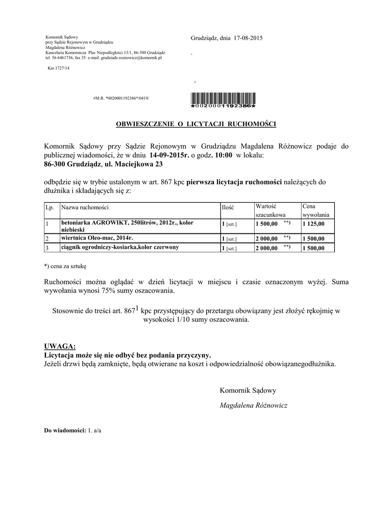 Komornik Sądowy przy Sądzie Rejonowym w Grudziądzu Magdalena Różnowicz Kancelaria Komornicza Plac Niepodległości 13/1, 86-300 Grudziądz tel. 56 6461736, fax 35 e-mail: [email protected] Grudziądz, dnia 17-08-2015 . Km 1727/14 #M.R. *0020001192386*/0419/ *0020001192386* OBWIESZCZENIE O LICYTACJI RUCHOMOŚCI Komornik Sądowy przy Sądzie Rejonowym w Grudziądzu Magdalena Różnowicz podaje do publicznej wiadomości, że w dniu 14-09-2015r. o godz. 10:00 w lokalu: 86-300 Grudziądz, ul. Maciejkowa 23 odbędzie się w trybie ustalonym w art. 867 kpc pierwsza licytacja ruchomości należących do dłużnika i składających się z: Lp. Nazwa ruchomości Ilość 1 betoniarka AGROWIKT, 250litrów, 2012r., kolor niebieski wiertnica Oleo-mac, 2014r. ciągnik ogrodniczy-kosiarka,kolor czerwony 1 [szt.] Wartość szacunkowa 1 500,00 **) 1 [szt.] 1 [szt.] 2 000,00 2 000,00 2 3 **) **) Cena wywołania 1 125,00 1 500,00 1 500,00 *) cena za sztukę Ruchomości można oglądać w dzień licytacji w miejscu i czasie oznaczonym wyżej. Suma wywołania wynosi 75% sumy oszacowania. Stosownie do treści art. 8671 kpc przystępujący do przetargu obowiązany jest złożyć rękojmię w wysokości 1/10 sumy oszacowania. UWAGA: Licytacja może się nie odbyć bez podania przyczyny. Jeżeli drzwi będą zamknięte, będą otwierane na koszt i odpowiedzialność obowiązanegodłużnika. Komornik Sądowy Magdalena Różnowicz Do wiadomości: 1. a/a