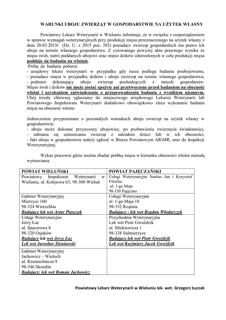 WARUNKI UBOJU ZWIERZĄT W GOSPODARSTWIE NA UŻYTEK WŁASNY Powiatowy Lekarz Weterynarii w Wieluniu informuje, że w związku z rozporządzeniem w sprawie wymagań weterynaryjnych przy produkcji mięsa przeznaczonego na użytek własny z dnia 20.03.2015r (Dz. U. z 2015 poz. 392) posiadacz zwierząt gospodarskich ma prawo ich uboju na terenie własnego gospodarstwa. Z cytowanego powyżej aktu prawnego wynika że mięso świń, nutrii poddanych ubojowi oraz mięso dzików odstrzelonych w celu produkcji mięsa poddaje się badaniu na włośnie.---------------------------------------------------------------------------Próbę do badania pobiera: ----------------------------------------------------------------------------------..urzędowy lekarz weterynarii w przypadku gdy tusza podlega badaniu poubojowemu, - posiadacz mięsa w przypadku dzików i uboju zwierząt na terenie własnego gospodarstwa, -..podmiot dokonujący uboju zwierząt pochodzących z innych gospodarstw. Mięso świń i dzików nie może zostać spożyte ani przetworzone przed badaniem na obecność włośni i uzyskaniem zaświadczenia o przeprowadzeniu badania z wynikiem ujemnym. Ubój trzody chlewnej zgłaszamy do miejscowego urzędowego Lekarza Weterynarii lub Powiatowego Inspektoratu Weterynarii dodatkowo obowiązkowo zleca wykonanie badania mięsa na obecność włośni. Jednocześnie przypominam o pozostałych warunkach uboju zwierząt na użytek własny w gospodarstwie: - uboju może dokonać przyuczony ubojowiec, po pozbawieniu zwierzęcia świadomości, - zabrania się uśmiercania zwierząt z udziałem dzieci lub w ich obecności, - fakt uboju w gospodarstwie należy zgłosić w Biurze Powiatowym ARiMR, oraz do Inspekcji Weterynaryjnej. Wykaz pracowni gdzie można zbadać próbkę mięsa w kierunku obecności włośni metodą wytrawiania POWIAT PAJĘCZAŃSKI POWIAT WIELUŃSKI Powiatowy Inspektorat Weterynarii w Usługi Weterynaryjne Sanitas Jan i Krzysztof Filocha, Wieluniu, ul. Kolejowa 63; 98-300 Wieluń ul. 1-go Maja 98-330 Pajęczno Gabinet Weterynaryjny Mierzyce 160 98-324 Wierzchlas Badający lek wet Artur Piosczek Usługi Weterynaryjne Jerzy Łaz ul. Spacerowa 8 98-320 Osjaków Badający lek wet Jerzy Łaz Lek wet Jarosław Sieniawski Usługi Weterynaryjne ul. 1-go Maja 18 98-332 Rząśnia Badający : lek wet Bogdan Włodarczyk Przychodnia Weterynaryjna Lek wet Piotr Gwoździk ul. Mickiewicza 1 98-338 Sulmierzyce Badający lek wet Piotr Gwoździk Lek wet Kazimierz Jacek Gwoździk Gabinet Weterynaryjny Jachowicz – Wieloch ul. Rzemieślnicza 9 98-346 Skomlin Badający: lek wet Roman Jachowicz Powiatowy Lekarz Weterynarii w Wieluniu lek. wet. Grzegorz Łuczak