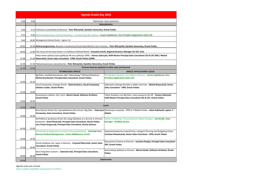 Agenda Oracle Day 2014 Rejestracja i kawa powitalna Sesja plenarna 8:00 9:00 9:00 9:15 Powitanie uczestników konferencji - Piotr Witczyński, Dyrektor Generalny, Oracle Polska 9:15 9:45 Referat programowy: Cyfrowa Rewolucja – transformacja dla sukcesu - Cesare Capobianco, Vice President Applications Sales CEE 9:45 10:05 Wystąpienie klienta Oracle - Agora S.A. 10:05 10:40 Referat programowy: Nowości z konferencji Oracle OpenWorld w San Francisco - Piotr Witczyński, Dyrektor Generalny, Oracle Polska 10:40 11:00 The Future of the Data Center in a Software-Defined World - Krzysztof Janicki, Regional Business Manager for CEE, Intel 11:00 Pokaz demo aplikacji SaaS (aplikacje HR oraz aplikacje CRM) - Tomasz Zubrzycki, HCM Master Principal Sales Consultant CEE & CAT (HR) / Michał 11:30 Skowroński, Senior Sales Consultant - CRM, Oracle Polska (CRM) 11:30 11:35 11:35 Podsumowanie po sesji plenarnej - Piotr Witczyński, Dyrektor Generalny, Oracle Polska Przerwa kawowa (podział na dwie sesje tematyczne) 12:00 TECHNOLOGIA ORACLE 12:00 12:30 ORACLE APPLICATIONS CLOUD Big Data i analityka biznesowa: jako "lokomotywy" Cyfrowej Rewolucji Michał Grochowski, Principal Sales Consultant, Oracle Polska The Modern Cloud for Your Modern Business - Cesare Capobianco, Vice President Applications Sales CEE Cloud Computing: strategia Oracle - Rafał Szafulera, Cloud Computing Solution Leader, Oracle Polska Optymalna obsługa klientów w dobie Internetu - Michał Skowroński, Senior Sales Consultant - CRM, Oracle Polska Rozwiązania mobilne: dziś i jutro -Marcin Kozak, Software Architect, Oracle Polska Talent Analytics oraz Big Data: nowe wyzwania dla HR - Tomasz Zubrzycki, HCM Master Principal Sales Consultant CEE & CAT, Oracle Polska 12:30 13:00 13:00 13:30 13:30 14:00 Lunch Baza Danych Oracle 12c: zaprojektowana dla chmury i Big Data - Katarzyna Rewolucja w ewolucji – EPM w T-Mobile Polska - Adam Kuklewski, expert, TTarnowska, Sales Consultant, Oracle Polska Mobile 14:00 14:30 Architektura sprzętowa Oracle dla usługi Database as a Service w chmurze Modern Marketing: Personalising the Digital Dialogue - Lee Randle, Sales prywatnej - Karol Płuciennik, Principal Sales Consultant, Oracle Polska Manager - ECEMEA, Oracle oraz Paweł Gregorczyk, Principal Sales Consultant, Oracle Systems 14:30 15:00 Infrastruktura aplikacyjna w czasach Cyfrowej Rewolucji: - Kulvinder Hari, Director Product Management - Fusion Middleware, Oracle 15:00 15:30 16:00 Zapewnij bezpieczny rozwój firmy z usługami Planning and Budgeting Cloud Jarosław Nowakowski, Senior Sales Consultant - EPM, Oracle Polska 15:30 16:00 16:30 Oracle Database 12c: opcja In-Memory - Krzysztof Marciniak, Senior Sales Consultant, Oracle Polska Data Integration Systems - Sylwester Deć, Principal Sales Consultant, Oracle Polska 16:00 Agenda może ulec zmianie Sesje w języku angielskim są oznaczone na zielono Nowoczesne finanse w Chmurze - Jarosław Poręba, Principal Sales Consultant ERP, Oracle Polska Komunikacja aplikacji w chmurze - Marcin Kozak, Software Architect, Oracle Polska Zakończenie