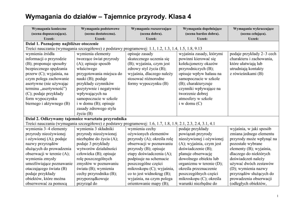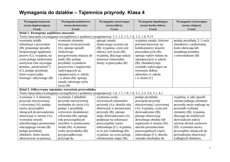 Wymagania do działów – Tajemnice przyrody. Klasa 4 Wymagania konieczne (ocena dopuszczająca). Uczeń: Wymagania podstawowe (ocena dostateczna). Uczeń: Wymagania rozszerzające (ocena dobra). Uczeń: Wymagania dopełniające (ocena bardzo dobra). Uczeń: Dział 1. Poznajemy najbliższe otoczenie Treści nauczania (wymagania szczegółowe) z podstawy programowej: 1.1, 1.2, 1.3, 1.4, 1.5, 1.8, 9.13 wymienia źródła wymienia elementy opisuje zasady wyjaśnia zasady, którymi informacji o przyrodzie tworzące świat przyrody skutecznego uczenia się powinni kierować się (B); proponuje sposoby (A); opisuje sposób (B); wyjaśnia, czym jest kolekcjonerzy okazów bezpiecznego spędzania właściwego zdrowy styl życia (B); przyrodniczych (B); przerw (C); wyjaśnia, na przygotowania miejsca do wyjaśnia, dlaczego należy opisuje wpływ hałasu na czym polega zachowanie nauki (B); podaje stosować różnorodne samopoczucie w szkole asertywne (nie używając przykłady czynników formy wypoczynku (B) (B); charakteryzuje terminu „asertywność”) pozytywnie i negatywnie czynniki wpływające na (C); podaje przykłady wpływających na tworzenie dobrej form wypoczynku samopoczucie w szkole atmosfery w szkole biernego i aktywnego (B) i w domu (B); opisuje i w domu (C) zasady zdrowego stylu życia (B) Dział 2. Odkrywamy tajemnice warsztatu przyrodnika Treści nauczania (wymagania szczegółowe) z podstawy programowej: 1.6, 1.7, 1.8, 1.9, 2.1, 2.3, 2.4, 3.1, 4.1 wymienia 3–4 elementy wymienia 3 składniki wymienia cechy podaje przykłady przyrody nieożywionej przyrody nieożywionej ożywionych elementów powiązań przyrody i ożywionej (A); podaje niezbędne do życia (A); przyrody (A); określa rolę nieożywionej i ożywionej nazwy przyrządów podaje 3 przykłady obserwacji w poznawaniu (A); wyjaśnia, czym jest służących do prowadzenia wytworów działalności przyrody (B); opisuje doświadczenie (B); obserwacji w terenie (A); człowieka (B); opisuje etapy doświadczenia (A); planuje obserwację wymienia zmysły rolę poszczególnych podpisuje na schemacie dowolnego obiektu lub umożliwiające poznawanie zmysłów w poznawaniu poszczególne części organizmu w terenie (D); otaczającego świata (B) świata (B); wymienia mikroskopu (C); wyjaśnia, określa przeznaczenie podaje przykłady cechy przyrodnika (B); co to jest widnokrąg (B); poszczególnych części obiektów, które można przyporządkowuje wyjaśnia, na czym polega mikroskopu (C); określa obserwować za pomocą przyrząd do orientowanie mapy (B); warunki niezbędne do Wymagania wykraczające (ocena celująca). Uczeń: podaje przykłady 2–3 cech charakteru i zachowania, które ułatwiają lub utrudniają kontakty z rówieśnikami (B) wyjaśnia, w jaki sposób zmiana jednego elementu przyrody może wpłynąć na pozostałe wybrane elementy (B); wyjaśnia, dlaczego do niektórych doświadczeń należy używać dwóch zestawów (D); wymienia nazwy przyrządów służących do prowadzenia obserwacji (odległych obiektów, 1 Wymagania do działów – Tajemnice przyrody. Klasa 4 Wymagania konieczne (ocena dopuszczająca). Uczeń: Wymagania podstawowe (ocena dostateczna). Uczeń: Wymagania rozszerzające (ocena dobra). Uczeń: Wymagania dopełniające (ocena bardzo dobra). Uczeń: obserwowanego obiektu podaje nazwy etapów prowadzenia uprawy roślin (C); opisuje sposób rozwoju rośliny (A); (C); porównuje budowę wyznaczania kierunków rozpoznaje drzewa zewnętrzną drzew, geograficznych za i krzewy rosnące w krzewów i roślin zielnych pomocą kompasu najbliższym otoczeniu (C); (C) i gnomonu (C); rysuje określa cel hodowli różę głównych zwierząt (B); wyjaśnia, i pośrednich kierunków dlaczego nie wszystkie geograficznych (B); zwierzęta możemy rozpoznaje obiekty hodować w domu (B) przedstawione na planie za pomocą znaków topograficznych (C); określa położenie innych obiektów na mapie w stosunku do podanego obiektu (C); opisuje zasady pielęgnacji roślin (B); podaje przykłady drzew, krzewów i roślin zielnych rosnących w ogrodach (C); opisuje zasady opieki nad zwierzętami (B) Dział 3. Odkrywamy tajemnice zjawisk przyrodniczych Treści nauczania (wymagania szczegółowe) z podstawy programowej: 2.2, 3.2, 3.3, 3.9, 3.10, 3.11, 3.12, 3.13, 14.4 podaje przykłady opisuje budowę wyjaśnia zasadę działania analizuje wpływ zmian występowania wody termometru (B); wymienia termometru (B); wymienia temperatury powietrza na w różnych stanach czynniki wywołujące przyrządy służące do życie organizmów żywych mikroskopu (B); podaje nazwy głównych kierunków geograficznych (C); rysuje różę głównych kierunków geograficznych (B); wymienia rodzaje map (A); wymienia zasady pielęgnacji roślin (B); dzieli rośliny na drzewa, krzewy i rośliny zielne (B); podaje przykłady zwierząt hodowanych przez człowieka (B) Wymagania wykraczające (ocena celująca). Uczeń: głębin) (B) wymienia nazwy kilku roślin leczniczych uprawianych w domu lub w ogrodzie (B) wyjaśnia, popierając przykładami, zjawiska sublimacji i resublimacji 2 Wymagania do działów – Tajemnice przyrody. Klasa 4 Wymagania konieczne (ocena dopuszczająca). Uczeń: Wymagania podstawowe (ocena dostateczna). Uczeń: Wymagania rozszerzające (ocena dobra). Uczeń: skupienia (B); odczytuje wskazania termometru (C); podaje nazwy przemian stanów skupienia wody (C); przyporządkowuje stany skupienia wody do właściwych przedziałów temperaturowych (B); wymienia składniki pogody (A); rozpoznaje rodzaje opadów (C); przyporządkowuje nazwy 3 przyrządów do rodzajów obserwacji meteorologicznych (C); odczytuje symbole umieszczone na mapie pogody (C); wyjaśnia pojęcia: wschód Słońca, zachód Słońca (B); wymienia daty rozpoczęcia kalendarzowych pór roku (A); podaje po 3 przykłady zmian zachodzących w przyrodzie w poszczególnych porach roku (C) topnienie, krzepnięcie parowanie i skraplanie (A); zapisuje temperaturę 
