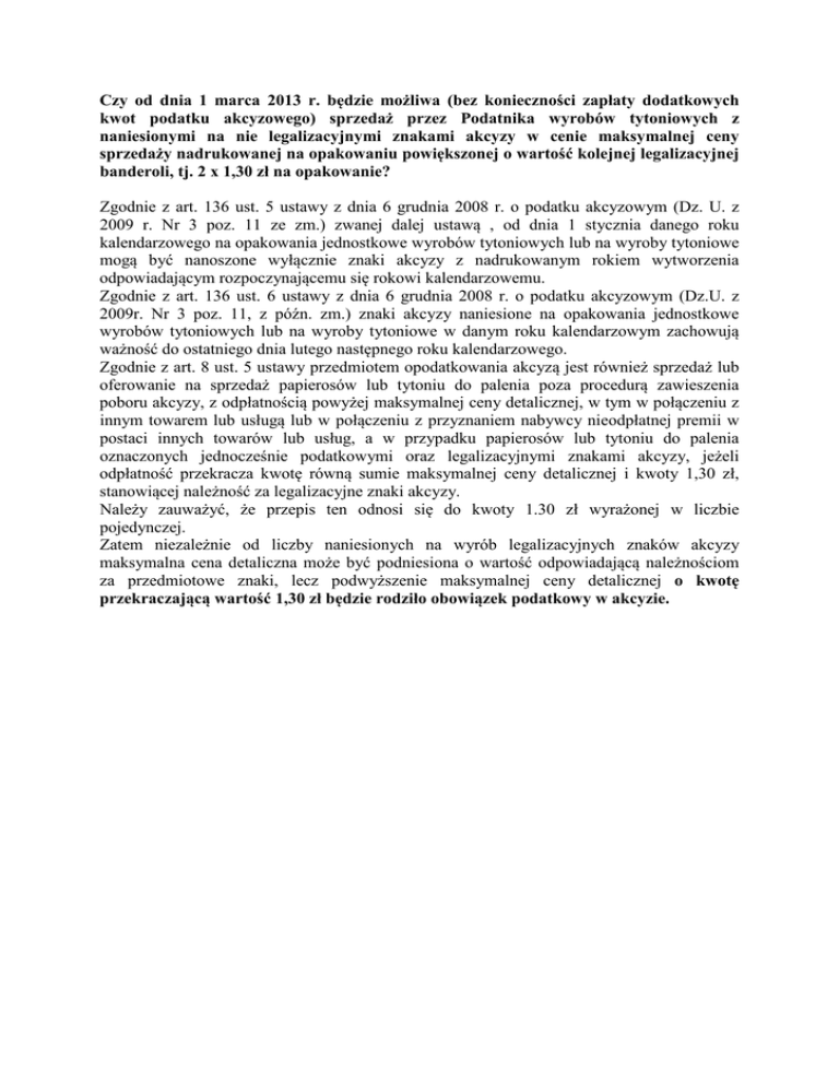 Czy od dnia 1 marca 2013 r. będzie możliwa (bez konieczności zapłaty dodatkowych kwot podatku akcyzowego) sprzedaż przez Podatnika wyrobów tytoniowych z naniesionymi na nie legalizacyjnymi znakami akcyzy w cenie maksymalnej ceny sprzedaży nadrukowanej na opakowaniu powiększonej o wartość kolejnej legalizacyjnej banderoli, tj. 2 x 1,30 zł na opakowanie? Zgodnie z art. 136 ust. 5 ustawy z dnia 6 grudnia 2008 r. o podatku akcyzowym (Dz. U. z 2009 r. Nr 3 poz. 11 ze zm.) zwanej dalej ustawą , od dnia 1 stycznia danego roku kalendarzowego na opakowania jednostkowe wyrobów tytoniowych lub na wyroby tytoniowe mogą być nanoszone wyłącznie znaki akcyzy z nadrukowanym rokiem wytworzenia odpowiadającym rozpoczynającemu się rokowi kalendarzowemu. Zgodnie z art. 136 ust. 6 ustawy z dnia 6 grudnia 2008 r. o podatku akcyzowym (Dz.U. z 2009r. Nr 3 poz. 11, z późn. zm.) znaki akcyzy naniesione na opakowania jednostkowe wyrobów tytoniowych lub na wyroby tytoniowe w danym roku kalendarzowym zachowują ważność do ostatniego dnia lutego następnego roku kalendarzowego. Zgodnie z art. 8 ust. 5 ustawy przedmiotem opodatkowania akcyzą jest również sprzedaż lub oferowanie na sprzedaż papierosów lub tytoniu do palenia poza procedurą zawieszenia poboru akcyzy, z odpłatnością powyżej maksymalnej ceny detalicznej, w tym w połączeniu z innym towarem lub usługą lub w połączeniu z przyznaniem nabywcy nieodpłatnej premii w postaci innych towarów lub usług, a w przypadku papierosów lub tytoniu do palenia oznaczonych jednocześnie podatkowymi oraz legalizacyjnymi znakami akcyzy, jeżeli odpłatność przekracza kwotę równą sumie maksymalnej ceny detalicznej i kwoty 1,30 zł, stanowiącej należność za legalizacyjne znaki akcyzy. Należy zauważyć, że przepis ten odnosi się do kwoty 1.30 zł wyrażonej w liczbie pojedynczej. Zatem niezależnie od liczby naniesionych na wyrób legalizacyjnych znaków akcyzy maksymalna cena detaliczna może być podniesiona o wartość odpowiadającą należnościom za przedmiotowe znaki, lecz podwyższenie maksymalnej ceny detalicznej o kwotę przekraczającą wartość 1,30 zł będzie rodziło obowiązek podatkowy w akcyzie.