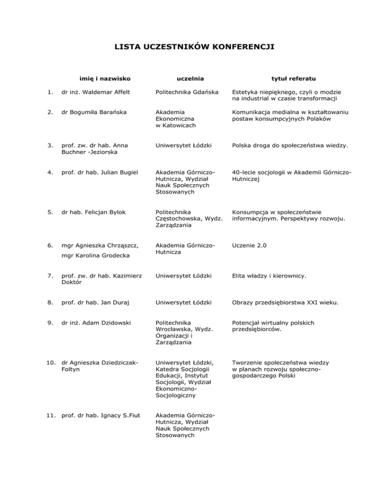 LISTA UCZESTNIKÓW KONFERENCJI imię i nazwisko uczelnia tytuł referatu 1. dr inŜ. Waldemar Affelt Politechnika Gdańska Estetyka niepięknego, czyli o modzie na industrial w czasie transformacji 2. dr Bogumiła Barańska Akademia Ekonomiczna w Katowicach Komunikacja medialna w kształtowaniu postaw konsumpcyjnych Polaków 3. prof. zw. dr hab. Anna Buchner -Jeziorska Uniwersytet Łódzki Polska droga do społeczeństwa wiedzy. 4. prof. dr hab. Julian Bugiel Akademia GórniczoHutnicza, Wydział Nauk Społecznych Stosowanych 40-lecie socjologii w Akademii GórniczoHutniczej 5. dr hab. Felicjan Bylok Politechnika Częstochowska, Wydz. Zarządzania Konsumpcja w społeczeństwie informacyjnym. Perspektywy rozwoju. 6. mgr Agnieszka Chrząszcz, Akademia GórniczoHutnicza Uczenie 2.0 mgr Karolina Grodecka 7. prof. zw. dr hab. Kazimierz Doktór Uniwersytet Łódzki Elita władzy i kierownicy. 8. prof. dr hab. Jan Duraj Uniwersytet Łódzki Obrazy przedsiębiorstwa XXI wieku. 9. dr inŜ. Adam Dzidowski Politechnika Wrocławska, Wydz. Organizacji i Zarządzania Potencjał wirtualny polskich przedsiębiorców. 10. dr Agnieszka DziedziczakFoltyn Uniwersytet Łódzki, Katedra Socjologii Edukacji, Instytut Socjologii, Wydział EkonomicznoSocjologiczny Tworzenie społeczeństwa wiedzy w planach rozwoju społecznogospodarczego Polski 11. prof. dr hab. Ignacy S.Fiut Akademia GórniczoHutnicza, Wydział Nauk Społecznych Stosowanych 12. dr Michał Goliński Szkoła Główna Handlowa Postrzegana gotowość do funkcjonowania w sieci. 13. mgr Anetta Janowska Szkła Główna Handlowa Netokracja czy konsumariat? Jaka ewolucja konsumpcji muzyki w świetle rewolucji cyfrowej? 14. dr Agnieszka Jeran WyŜsza Szkoła Gospodarki w Bydgoszczy Wykluczenie cyfrowe – aspekty normatywne a rzeczywistość. 15. prof. dr hab.Ewa JurczyńskaMcCluskey Akademia TechnicznoHumanistyczna w Bielsku-Białej Od społeczeństwa informacyjnego do społeczeństwa wiedzy. Dylematy modernizacyjne na początku XXI wieku. 16. dr Łucja Kapralska Akademia GórniczoHutnicza, Wydział Nauk Społecznych Stosowanych 1.Śmierć w internecie 17. mgr Anna Kulpa Akademia GórniczoHutnicza, Wydział Nauk Społecznych Stosowanych Deregulacje i próby ponownej regulacji stosunków pracy w wybranych krajach europejskich. 18. prof. zw. dr hab. Jolanta Kulpińska Społeczna WyŜsza Szkoła Przedsiębiorczości i Zarządzania w Łodzi Społeczeństwo wiedzy – praca nad wiedzą. 19. dr Renata Maćkowska Akademia Ekonomiczna w Katowicach Rola Internetu w kreowaniu wizerunku organizacji politycznej 20. dr Agata Maksymowicz Akademia GórniczoHutnicza, Wydział Nauk Społecznych Stosowanych Śmierć w internecie 21. dr Anna Małecka Akademia GórniczoHutnicza, Wydział Nauk Społecznych Stosowanych Od muzeów epoki przemysłowej do muzeów multimedialnych 22. dr Marzena MamakZdanecka Akademia GórniczoHutnicza, Wydział Nauk Społecznych Stosowanych Zmiany w technologii a zmiany w organizacjach gospodarczych. 23. prof. dr hab. Daniel Markowski Uniwersytet Rzeszowski, Instytut Socjologii Typy struktur społecznych w powstającym społeczeństwie informacyjnym. 2. Internet a problem kapitału społecznego 24. mgr Tomasz Masłyk Akademia GórniczoHutnicza, Wydział Nauk Społecznych Stosowanych ZróŜnicowany świat sieci – charakter działań podejmowanych przez uŜytkowników Internetu. 25. prof. dr hab. Tadeusz Michalczyk Szkoła Główna Gospodarstwa Wiejskiego Ontologiczne aspekty zjawisk społeczncyh. 26. prof. dr hab. Lech Milian Gdańska WyŜsza Szkoła Administracji Przewodniczący sesji tematycznej „Uwarunkowania kulturowe transformacji” 27. dr Małgorzata MolędaZdziech Szkoła Główna Handlowa Mediatyzacja Ŝycia publicznego. 28. mgr Aleksandra Nowakowska WyŜsza Szkoła Gospodarki w Bydgoszczy Wirtualny pielgrzym – o idei pieszego pielgrzymowania i jej obecności w Internecie. 29. dr BoŜena Pactwa Uniwersytet Śląski Instytut Socjologii Kościół Ŝywy – Grekokatolicy w sieci. 30. prof. dr hab. Zbigniew Pasek Akademia GórniczoHutnicza, Wydział Nauk Społecznych Stosowanych 31. mgr Aleksandra Piekarska Społeczna WyŜsza Szkoła Przedsiębiorczości i Zarządzania w Łodzi Od kariery biurokratycznej do kariery bez granic. Wzory karier zawodowych w kontekście przemian społecznych. 32. mgr Tomasz Piróg Akademia GórniczoHutnicza Co z tą pracą? Społeczne konsekwencje przemian na rynku pracy 33. dr Lucyna Prorok Uniwersytet Łódzki, Wydz. EkonomicznoSocjologiczny. Instytut Socjologii, Katedra Socjologii Edukacji. Polityka edukacyjna wobec wyzwań społeczeństwa informacyjnego w Unii Europejskiej i w Polsce. 34. dr Magdalena Rzadkowolska Uniwersytet Łódzki, Katedra Bibliotekoznawstwa i Informacji Naukowej Rola biblioteki w społeczeństwie przemysłowym i w społeczeństwie informacyjnym 35. prof. dr hab inŜ. Piotr Sienkiewicz Akademia Obrony Narodowej Analiza systemowa ewolucji struktur organizacyjnych. Wpływ czynników technologicznych. 36. płk. dr inŜ. Jarosław Siuda Akademia Obrony Narodowej Bezpieczeństwo informacyjne jako czynnik jakości Ŝycia. 37. mgr Piotr Siuda WyŜsza Szkoła Gospodarki w Bydgoszczy „Wolna kultura” vs dyktat prawa autorskiego. Analiza ruchu społecznego „wolnej kultury”. 38. mgr Maria Stojkow Akademia GórniczoHutnicza, Wydział Nauk Społecznych Stosowanych Małe przedsiębiorstwa arabskie pomiędzy tradycją a nowoczesnością. 39. dr Anna Sołtys Społeczna WyŜsza Szkoła Przedsiębiorczości i Zarządzania w Łodzi Przemiany w zakresie relacji zatrudnienia – problem pracowników wieloetatowych i wielofunkcyjnych. 40. mgr Ewa Stroińska Społeczna WyŜsza Szkoła Przedsiębiorczości i Zarządzania Zarządzanie Pracą Wykonywaną Zdalnie. 41. dr hab. Urszula Swadźba Uniwersytet Śląski, Instytut Socjologii Od rębacza do socjologa. Zmiany struktury społeczno-zawodowej w tradycyjnej społeczności śląskiej. 42. prof. zw. dr hab.Marek S. Szczepański Uniwersytet Śląski, Wy