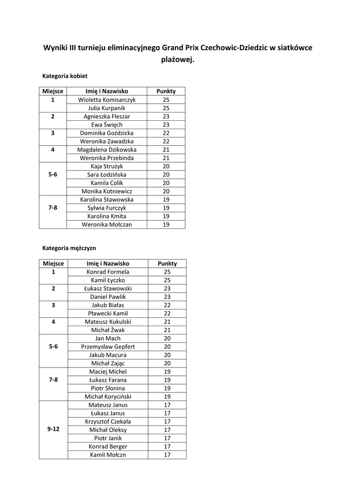 Wyniki III turnieju eliminacyjnego Grand Prix Czechowic-Dziedzic w siatkówce plażowej. Kategoria kobiet Miejsce 1 2 3 4 5-6 7-8 Imię i Nazwisko Wioletta Komisarczyk Julia Kurpanik Agnieszka Fleszar Ewa Święch Dominika Goździcka Weronika Zawadzka Magdalena Dzikowska Weronika Przebinda Kaja Strużyk Sara Łodzińska Kamila Colik Monika Kotniewicz Karolina Stawowska Sylwia Furczyk Karolina Kmita Weronika Mołczan Punkty 25 25 23 23 22 22 21 21 20 20 20 20 19 19 19 19 Kategoria mężczyzn Miejsce 1 2 3 4 5-6 7-8 9-12 Imię i Nazwisko Konrad Formela Kamil Łyczko Łukasz Stawowski Daniel Pawlik Jakub Białas Pławecki Kamil Mateusz Kukulski Michał Żwak Jan Mach Przemysław Gepfert Jakub Macura Michał Zając Maciej Michel Łukasz Farana Piotr Słonina Michał Koryciński Mateusz Janus Łukasz Janus Krzysztof Czekała Michał Oleksy Piotr Janik Konrad Berger Kamil Mołczn Punkty 25 25 23 23 22 22 21 21 20 20 20 20 19 19 19 19 17 17 17 17 17 17 17 13-16 17-18 Daniel Kmita Kai Czornik Patryk Leśniak Jakub Kasprzyk Wojciech Szwed Maciej Wiśniewski Sebastian Sykta Sebastian Popek Rafał Jezierski Maciej Tonderski Kacper Wróbel Jakub Chudyba Wojciech Majcher 17 15 15 15 15 15 15 15 15 12 12 12 12 Kategoria mikst Miejsce 1 2 3 4 5-6 7-8 9-12 13-16 Imię i Nazwisko Kamila Colik Konrad Formela Monika Kotniewicz Michał Koryciński Ewa Święch Sebastian Popek Karolina Stawowska Łukasz Stawowski Agnieszka Fleszar Rafał Jezierski Weronika Przebinda Daniel Pawlik Dominika Goździcka Krzysztof Czekała Magdalena Włodarska Piotr Słonina Weronika Zawadzka Michał Oleksy Karolina Kmita Daniel Kmita Wioletta Komisarczyk Maciej Michel Martyna Cholewa Jan Mach Kaja Strużyk Przemysław Gepfert Weronika Mołczan Kamil Mołczan Julia Kurpanik Karol Berger Weronika Wieczerzycka Filip Nowakowski Punkty 25 25 23 23 22 22 21 21 20 20 20 20 19 19 19 19 17 17 17 17 17 17 17 17 15 15 15 15 15 15 15 15 17 Magdalena Dzikowska Włodzimierz Włodyka 12 12
