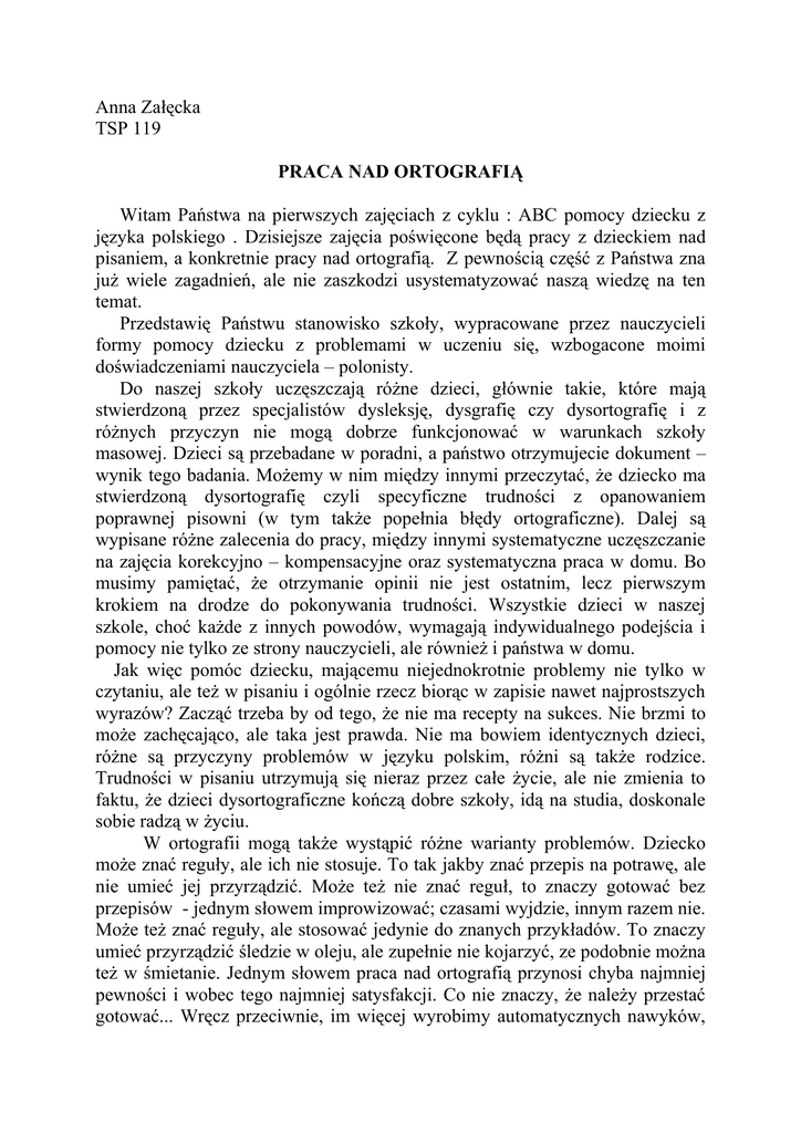 Anna Załęcka TSP 119 PRACA NAD ORTOGRAFIĄ Witam Państwa na pierwszych zajęciach z cyklu : ABC pomocy dziecku z języka polskiego . Dzisiejsze zajęcia poświęcone będą pracy z dzieckiem nad pisaniem, a konkretnie pracy nad ortografią. Z pewnością część z Państwa zna już wiele zagadnień, ale nie zaszkodzi usystematyzować naszą wiedzę na ten temat. Przedstawię Państwu stanowisko szkoły, wypracowane przez nauczycieli formy pomocy dziecku z problemami w uczeniu się, wzbogacone moimi doświadczeniami nauczyciela – polonisty. Do naszej szkoły uczęszczają różne dzieci, głównie takie, które mają stwierdzoną przez specjalistów dysleksję, dysgrafię czy dysortografię i z różnych przyczyn nie mogą dobrze funkcjonować w warunkach szkoły masowej. Dzieci są przebadane w poradni, a państwo otrzymujecie dokument – wynik tego badania. Możemy w nim między innymi przeczytać, że dziecko ma stwierdzoną dysortografię czyli specyficzne trudności z opanowaniem poprawnej pisowni (w tym także popełnia błędy ortograficzne). Dalej są wypisane różne zalecenia do pracy, między innymi systematyczne uczęszczanie na zajęcia korekcyjno – kompensacyjne oraz systematyczna praca w domu. Bo musimy pamiętać, że otrzymanie opinii nie jest ostatnim, lecz pierwszym krokiem na drodze do pokonywania trudności. Wszystkie dzieci w naszej szkole, choć każde z innych powodów, wymagają indywidualnego podejścia i pomocy nie tylko ze strony nauczycieli, ale również i państwa w domu. Jak więc pomóc dziecku, mającemu niejednokrotnie problemy nie tylko w czytaniu, ale też w pisaniu i ogólnie rzecz biorąc w zapisie nawet najprostszych wyrazów? Zacząć trzeba by od tego, że nie ma recepty na sukces. Nie brzmi to może zachęcająco, ale taka jest prawda. Nie ma bowiem identycznych dzieci, różne są przyczyny problemów w języku polskim, różni są także rodzice. Trudności w pisaniu utrzymują się nieraz przez całe życie, ale nie zmienia to faktu, że dzieci dysortograficzne kończą dobre szkoły, idą na studia, doskonale sobie radzą w życiu. W ortografii mogą także wystąpić różne warianty problemów. Dziecko może znać reguły, ale ich nie stosuje. To tak jakby znać przepis na potrawę, ale nie umieć jej przyrządzić. Może też nie znać reguł, to znaczy gotować bez przepisów - jednym słowem improwizować; czasami wyjdzie, innym razem nie. Może też znać reguły, ale stosować jedynie do znanych przykładów. To znaczy umieć przyrządzić śledzie w oleju, ale zupełnie nie kojarzyć, ze podobnie można też w śmietanie. Jednym słowem praca nad ortografią przynosi chyba najmniej pewności i wobec tego najmniej satysfakcji. Co nie znaczy, że należy przestać gotować... Wręcz przeciwnie, im więcej wyrobimy automatycznych nawyków, tym lepiej. Kształtujemy wrażliwość ortograficzną, bogacimy słownictwo, utrwalamy wzorce. Nie będę skupiała się na pomocy terapeutycznej, jedynie na rzeczywistej pomocy w pracy nad ortografią, takiej pomocy, która na co dzień przyda się dziecku. Zacznę od tego, jak pokazać dziecku, gdzie popełniło błąd. Często dzieci piszą na brudno zadania domowe. Wówczas błędny zapis zaznaczamy ołówkiem lub zamalowujemy błędną literę (np. korektorem). Jeżeli jednak zniekształcony jest cały wyraz, wówczas piszemy dziecku ten wyraz poprawnie, np. na marginesie, nad wyrazem lub na osobnej kartce, po to aby utrwalało ono poprawny zapis. Błędy poprawiamy zawsze wspólnie z dzieckiem, nie możemy dopuszczać do sytuacji, że dziecko przynosi nam zeszyt, a my oddajemy mu poprawiona w całości pracę. To mija się z celem. Dziecko musi mieć świadomość, gdzie popełniło błędy, a najlepiej samodzielnie sprawdzić wyrazy w słowniku. Idealnie byłoby, gdyby przytaczać reguły ortograficzne. Jak więc pracować nad poprawnym zapisem? 1. Ważne jest wdrażanie dziecka do samokontroli. Powinniśmy nakłaniać do używania słownika ortograficznego, nawet jeżeli będzie się to sprowadzało początkowo do sprawdzenia 2, 3 wyrazów. W szkole, na teście, sprawdzianie w gimnazjum, pomocą dla dziecka będzie tylko słownik, musi więc ono w porę się z tym słownikiem zaznajomić. 2. Dobrym ćwiczeniem ortograficznym utrwalającym pisownię jest tworzenie rodziny wyrazów. Dobrze zapisywać wyrazy w słupku, opierać się na tych, w których dziecko popełniło błąd w zeszycie. Na przykład: bohater bohaterka bohaterski bohaterska Można podkreślić wspólną cząstkę albo zakreślić ją w postaci zbioru. 3. Można następnie poszukać w słowniku ortograficznym wyrazów, które mają taki sam początek. 4. Z wyrazem takim zawsze można ułożyć zdanie. Wyraz podkreślić, trudność podkreślić odpowiednim kolorem. Powinniśmy kontrolować pisownię, by w zdaniu nie pojawił się inny błąd. 5. Dziecko może dzielić wyraz na sylaby. Potem wymyśla inne wyrazy, które rozpoczynają się daną sylabą, na przykład: bo – ha – ter: ha – la, ha - czyk 6. Powinniśmy też nakłaniać dziecko do użycia tego słowa w różnych kontekstach, połączeniach, na przykład: bohaterska postawa, bohater narodowy itp. 7. Dobrze jest stosować różne zapisy: w słupku, od strzałek, w gwiazdkach itp. 8. Zawsze, tam gdzie to możliwe przypominamy reguły, prosząc dziecko o podanie analogicznych przykładów. 9. Dobrze jest używać takich samych kolorów dla podkreślania trudności, używać zakreślaczy, karteczek – przypominajek Oczywiście nikt z nas nie jest kopalnią pomysłów na urozmaicenie dziecku nauki ortografii. Dlatego też chciałam dzisiaj pokazać państwu sprawdzone książki i serie, z których z powodzeniem dziecko może korzystać w domu. Zacznę od najbardziej podstawowej czyli słownika ortograficznego, na początek najlepiej z alfabetem. Polecam także inne książki: • Skarbczyk gramatyczno – ortograficzny: Lucyna Klimkowska, Iwona Wąsik • s