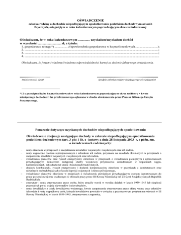 OŚWIADCZENIE członka rodziny o dochodzie niepodlegającym opodatkowaniu podatkiem dochodowym od osób fizycznych, osiągniętym w roku kalendarzowym poprzedzającym okres świadczeniowy Oświadczam, że w roku kalendarzowym .............. uzyskałam/uzyskałem dochód w wysokości ........................... zł; z tytułu: 1. gospodarstwa rolnego*) ................. zł (powierzchnia gospodarstwa w ha przeliczeniowych..............................); 2. ................................................................................................................................................................................; 3. .................................................................................................................... ...........................................................; 4. ................................................................................................................................................................................. Oświadczam, że jestem świadomy/świadoma odpowiedzialności karnej za złożenie fałszywego oświadczenia. ............................... (miejscowość, data) .............................................................. (podpis członka rodziny składającego oświadczenie) *12 x przeciętna liczba ha przeliczeniowych w roku kalendarzowym poprzedzającym okres zasiłkowy × kwota miesięcznego dochodu z 1 ha przeliczeniowego ogłaszana w drodze obwieszczenia przez Prezesa Głównego Urzędu Statystycznego. Pouczenie dotyczące uzyskanych dochodów niepodlegających opodatkowaniu Oświadczenie obejmuje następujące dochody w zakresie niepodlegającym opodatkowaniu podatkiem dochodowym (art. 3 pkt 1 lit. c (ustawy z dnia 28 listopada 2003 r. z późn. zm. o świadczeniach rodzinnych): − − − − − − − renty określone w przepisach o zaopatrzeniu inwalidów wojennych i wojskowych oraz ich rodzin, renty wypłacone osobom represjonowanym i członkom ich rodzin, przyznane na zasadach określonych w przepisach o zaopatrzeniu inwalidów wojennych i wojskowych oraz ich rodzin, świadczenia pieniężne oraz ryczałt energetyczny określone w przepisach o świadczeniu pieniężnym i uprawnieniach przysługujących żołnierzom zastępczej służby wojskowej przymusowo zatrudnianym w kopalniach węgla, kamieniołomach, zakładach rud uranu i batalionach budowlanych, dodatek kombatancki, ryczałt energetyczny i dodatek kompensacyjny określone w przepisach o kombatantach oraz niektórych osobach będących ofiarami represji wojennych i okresu powojennego, świadczenie pieniężne określone w przepisach o świadczeniu pieniężnym przysługującym osobom deportowanym do pracy przymusowej oraz osadzonym w obozach pracy przez III Rzeszę Niemiecką lub Związek Socjalistycznych Republik Radzieckich, emerytury i renty otrzymywane przez osoby, które utraciły wzrok w wyniku działań w latach 1939-1945 lub eksplozji pozostałych po tej wojnie niewypałów i niewybuchów, renty inwalidzkie z tytułu inwalidztwa wojennego, kwoty zaopatrzenia otrzymywane przez ofiary wojny oraz członków ich rodzin i renty wypadkowe osób, których inwalidztwo powstało w związku z przymusowym pobytem na robotach w III Rzeszy Niemieckiej w latach 1939-1945, otrzymywane z zagranicy, − − − − − − − − − − − − − − − − − − − − − − − − zasiłki chorobowe określone w przepisach o ubezpieczeniu społecznym rolników oraz w przepisach o systemie ubezpieczeń społecznych, środki bezzwrotnej pomocy zagranicznej otrzymywane od rządów państw obcych, organizacji międzynarodowych lub międzynarodowych instytucji finansowych, pochodzące ze środków bezzwrotnej pomocy przyznanych na podstawie jednostronnej deklaracji lub umów zawartych z tymi państwami, organizacjami lub instytucjami przez Radę Ministrów, właściwego ministra lub agencje rządowe, w tym również w przypadkach, gdy przekazanie tych środków jest dokonywane za pośrednictwem podmiotu upoważnionego do rozdzielania środków bezzwrotnej pomocy zagranicznej na rzecz podmiotów, którym służyć ma ta pomoc, należności ze stosunku pracy lub z tytułu stypendium osób fizycznych mających miejsce zamieszkania na terytorium Rzeczypospolitej Polskiej, przebywających czasowo za granicą - w wysokości odpowiadającej równowartości diet z tytułu podróży służbowej poza granicami kraju ustalonych dla pracowników zatrudnionych w państwowych lub samorządowych jednostkach sfery budżetowej na podstawie ustawy z dnia 26 czerwca 1974 r. - Kodeks pracy (Dz. U. z 1998 r. Nr 21, poz. 94, z późn. zm.2)), należności pieniężne wypłacone policjantom, żołnierzom, celnikom i pracownikom jednostek wojskowych i jednostek policyjnych użytych poza granicami państwa w celu udziału w konflikcie zbrojnym lub wzmocnienia sił państwa albo państw sojuszniczych, misji pokojowej, akcji zapobieżenia aktom terroryzmu lub ich skutkom, a także należności pieniężne wypłacone żołnierzom, policjantom, celnikom i pracownikom pełniącym funkcje obserwatorów w misjach pokojowych organizacji międzynarodowych i sił wielonarodowych, należności pieniężne ze stosunku służbowego otrzymywane w czasie służby kandydackiej przez funkcjonariuszy Policji, Państwowej Straży Pożarnej, Straży Granicznej i Biura Ochrony Rządu, obliczone za okres, w którym osoby te uzyskały dochód, dochody członków rolniczych spółdzielni produkcyjnych z tytułu członkostwa w rolniczej spółdzielni produkcyjnej, pomniejszone o składki na ubezpieczenia społeczne, alimenty na rzecz dzieci, stypendia doktoranckie i habilitacyjne przyznane na podstawie ustawy z dnia 14 marca 2003 r. o stopniach naukowych i tytule naukowym oraz o stopniach i tytule w zakresie sztuki (Dz. U. z 2014 r. poz. 1852), stypendia doktoranckie określone w art. 200 ustawy z dnia 27 lipca 2005 r. - Prawo o szkolnictwie wyższym (Dz. U. z 2012 r. poz. 572, z