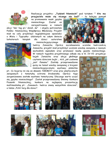 Realizacja projektu: „Tydzień Niemiecki” pod tytułem: " Kto ma przyjaciela może się niczego nie bać!" – to kolejny pomysł na promowanie nauki języka niemieckiego. Został on zarejestrowany w ramach akcji "der tag pl./ dzień. de” i objęty patronatem Polsko- Niemieckiej Współpracy Młodzieży. Projekt miał na celu przybliżyć najpiękniejsze opowieści o Misiu i Tygrysku- ulubionych na całym świecie bohaterach książek dla dzieci autorstwa niemieckojęzycznego twórcy Janoscha. Oprócz zaciekawienia uczniów twórczością Janoscha, projekt miał przybliżyć uczniom wiedzę związaną z naszym zachodnim sąsiadem oraz promować naukę języka niemieckiego. W ramach tygodnia projektowego odbyły się w kl. IV-VI: projekcje bajek Janoscha oraz akcja głośnego czytania dzieciom bajki „ Ach, jak cudowna jest Panama”. Zostały przeprowadzone quizy na temat wiedzy związanej z krajami niemieckojęzycznymi, wystawy: plakatów pt.: Co kojarzy mi się ze słowem: NIEMCY? oraz prac plastycznych związanych z tematyką ochrona środowiska. Oprócz tego zorganizowana została wystawa tematyczną: Dlaczego warto uczyć się języka niemieckiego? Został przeprowadzony Gminny Konkurs Piosenki Niemieckiej, konkurs na najlepszą prezentację multimedialną pt.: „Janosach- twórca znany wszystkim dzieciom”, a także „Pchli targ dla dzieci”.