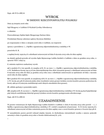 Sygn. akt II Ca 288/16 WYROK W IMIENIU RZECZYPOSPOLITEJ POLSKIEJ Dnia 25 sierpnia 2016 roku Sąd Okręgowy w Lublinie II Wydział Cywilny Odwoławczy w składzie: Przewodniczący Sędzia Sądu Okręgowego Dariusz Iskra Protokolant Starszy sekretarz sądowy Krystyna Melchior po rozpoznaniu w dniu 11 sierpnia 2016 roku w Lublinie, na rozprawie sprawy z powództwa (...) Spółki z ograniczoną odpowiedzialnością z siedzibą w W. przeciwko K. R. o zapłatę kwoty 1930,64 zł z odsetkami ustawowymi od dnia 8 stycznia 2015 roku do dnia zapłaty na skutek apelacji powoda od wyroku Sądu Rejonowego Lublin-Zachód w Lublinie z dnia 22 grudnia 2015 roku, w sprawie VIII C 1692/15 I. zmienia częściowo zaskarżony wyrok: a) w punkcie II w ten sposób, że zasądza od K. R. na rzecz (...) Spółki z ograniczoną odpowiedzialnością z siedzibą w W. dodatkowo kwotę 192,13 zł (sto dziewięćdziesiąt dwa złote trzynaście groszy) z odsetkami ustawowymi od dnia 8 stycznia 2015 roku do dnia 31 grudnia 2015 roku oraz z odsetkami ustawowymi za opóźnienie od dnia 1 stycznia 2016 roku do dnia zapłaty; b) w punkcie III w ten sposób, że zasądzoną od K. R. na rzecz (...) Spółki z ograniczoną odpowiedzialnością z siedzibą w W. kwotę 401,38 zł (czterysta jeden złoty trzydzieści osiem groszy) tytułem zwrotu kosztów procesu podwyższa do kwoty 466,42 zł (czterysta sześćdziesiąt sześć złotych czterdzieści dwa grosze); II. oddala apelację w pozostałej części; III. zasądza od K. R. na rzecz (...) Spółki z ograniczoną odpowiedzialnością z siedzibą w W. kwotę 55,69 zł (pięćdziesiąt pięć złotych sześćdziesiąt dziewięć groszy) tytułem zwrotu kosztów postępowania odwoławczego. Sygn. akt II Ca 288/16 UZASADNIENIE W pozwie wniesionym do Sądu Rejonowego Lublin-Zachód w Lublinie w dniu 8 stycznia 2015 roku powód – (...) Spółka z ograniczoną odpowiedzialnością z siedzibą w W. wniósł o zasądzenie od pozwanej – K. R. kwoty 1930,64 zł z odsetkami ustawowymi od dnia wniesienia pozwu do dnia zapłaty oraz o zwrot kosztów procesu w kwocie 630,38 zł. W uzasadnieniu pozwu powód wskazał między innymi, że dochodzona wierzytelność wynika z umowy pożyczki zawartej w dniu 10 grudnia 2013 roku w formie elektronicznej (k. 3-6). * W dniu 23 stycznia 2015 roku referendarz sądowy w Sądzie Rejonoweym Lublin-Zachód w Lublinie wydał nakaz zapłaty uwzględniający powództwo w całości (k. 6v). * Od nakazu zapłaty z dnia 23 stycznia 2015 roku pozwana wniosła sprzeciw (k. 7). * W piśmie procesowym z dnia 2 czerwca 2015 roku, wniesionym do Sądu w dniu 3 czerwca 2015 roku, powód wyjaśnił, że: 1) na roszczenie numer 1 wskazane w pozwie w kwocie 1200 zł składa się łączna kwota pożyczki wypłaconej pozwanej w dniu 12 grudnia 2013 roku – dwa przelewy po 600 zł; 2) na roszczenie numer 2 wskazane w pozwie w kwocie 192,13 zł składają się odsetki liczone od pełnej kwoty kapitału pożyczki – 1200 zł za okres od 12 grudnia 2013 roku (dzień wypłaty pożyczki) do dnia 7 stycznia 2015 roku (dzień poprzedzający dzień wniesienia pozwu) w wysokości odsetek maksymalnych; 3) na roszczenie numer 3 wskazane w pozwie w kwocie 538,51 zł składają się: a) opłata i prowizja od wypłaty środków (pierwszej transzy wypłaty) – 15 zł i 90 zł, b) opłata i prowizja od wypłaty środków (drugiej transzy wypłaty) – 15 zł i 90 zł, c) opłata miesięczna za utrzymanie konta (pierwsza) – 50 zł, d) opłata miesięczna za utrzymanie konta (druga) – 50 zł, e) opłata za pisemne upomnienie pierwsze – 45 zł, f) opłata za pisemne upomnienie drugie – 45 zł, g) opłata za pisemne upomnienie trzecie – 10 zł, h) opłata za pisemne upomnienie czwarte – 45 zł, i) opłata za pisemne upomnienie piąte – 45 zł, j) odsetki od opłat i prowizji wymienionych pod literami a)-f) za okres od dnia 13 maja 2014 roku do dnia 7 stycznia 2015 roku, obliczone według stopy odsetek maksymalnych – 38,51 zł (k. 14-14v). * Wyrokiem z dnia 22 grudnia 2015 roku Sąd Rejonowy Lublin-Zachód w Lublinie: I. zasądził od K. R. na rzecz (...) Spółki z ograniczoną odpowiedzialnością z siedzibą w W. kwotę 1200 zł z ustawowymi odsetkami od dnia 8 stycznia 2015 roku do dnia zapłaty; II. oddalił powództwo w pozostałym zakresie; III. zasądził od K. R. na rzecz (...) Spółki z ograniczoną odpowiedzialnością z siedzibą w W. kwotę 401,38 zł tytułem zwrotu kosztów procesu. W uzasadnieniu wyroku Sąd Rejonowy ustalił, że (...) Spółką z ograniczoną odpowiedzialnością w W. jest przedsiębiorcą zarobkowo zajmującym się udzielaniem kredytów w formie elektronicznej poprzez stronę www.euroloan.pl. Sąd ustalił, że w dniu 22 grudnia 2013 roku pomiędzy (...) Spółką z ograniczoną odpowiedzialnością w W., jako kredytodawcą, a K. R., jako kredytobiorcą, została zawarta umowa kredytu kwoty 1200 zł, którą powód przekazał pozwanej w dwóch ratach: pierwszą w dniu 22 grudnia 2013 roku w kwocie 600 zł i drugą w dniu 22 grudnia 2013 roku w kwocie 600 zł. Sąd Rejonowy ustalił, że termin zwrotu kredytu nie został określony przez strony. Pozwana do dnia wyrokowania nie spłaciła na rzecz powoda zobowiązania wynikającego z umowy z dnia 22 grudnia 2013 roku. Sąd wskazał, że oparł ustalenia faktyczne na dowodach w postaci dwóch potwierdzeń przelewów, które nie były kwestionowane przez żadną ze stron i co do których żadna ze stron nie zgłaszała zarzutu w zakresie prawdziwości, czy też braku autentyczności. Sąd Rejonowy uznał, że powództwo podlega uwzględnianiu częściowo, to jest co do kwoty 1200 zł z odsetkami ustawowymi za okres od dnia złożenia pozwu do dnia zapłaty. Powód, jako przedsiębiorca, którego zarobkowa działalność polega na udzielaniu kredytów w formie elektronicznej poprzez stronę www.euroloan.pl, dowiódł, że pomiędzy nim a pozwaną doszło do zawarcia w dniu 22 grudnia 2013 