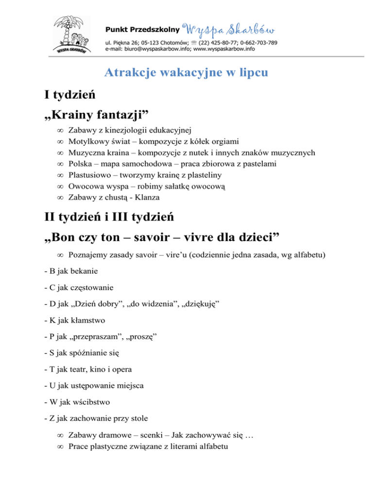 Punkt Przedszkolny Wyspa Skarbów ul. Piękna 26; 05-123 Chotomów; ℡ (22) 425-80-77; 0-662-703-789 e-mail: [email protected]; www.wyspaskarbow.info Atrakcje wakacyjne w lipcu I tydzień „Krainy fantazji” • • • • • • • Zabawy z kinezjologii edukacyjnej Motylkowy świat – kompozycje z kółek orgiami Muzyczna kraina – kompozycje z nutek i innych znaków muzycznych Polska – mapa samochodowa – praca zbiorowa z pastelami Plastusiowo – tworzymy krainę z plasteliny Owocowa wyspa – robimy sałatkę owocową Zabawy z chustą - Klanza II tydzień i III tydzień „Bon czy ton – savoir – vivre dla dzieci” • Poznajemy zasady savoir – vire’u (codziennie jedna zasada, wg alfabetu) - B jak bekanie - C jak częstowanie - D jak „Dzień dobry”, „do widzenia”, „dziękuję” - K jak kłamstwo - P jak „przepraszam”, „proszę” - S jak spóźnianie się - T jak teatr, kino i opera - U jak ustępowanie miejsca - W jak wścibstwo - Z jak zachowanie przy stole • Zabawy dramowe – scenki – Jak zachowywać się … • Prace plastyczne związane z literami alfabetu Punkt Przedszkolny Wyspa Skarbów ul. Piękna 26; 05-123 Chotomów; ℡ (22) 425-80-77; 0-662-703-789 e-mail: [email protected]; www.wyspaskarbow.info IV tydzień „Bajkoterapia – trudne, dziecięce problemy” • • • • • • Moi rodzice mnie nie kochają Dlaczego warto mieć rodzeństwo? Dlaczego nie wolno bawić się prądem? Boję się ciemności Moi rodzice się kłócą, a ja jestem smutny Praca plastyczna – Na smutki – uśmiech!