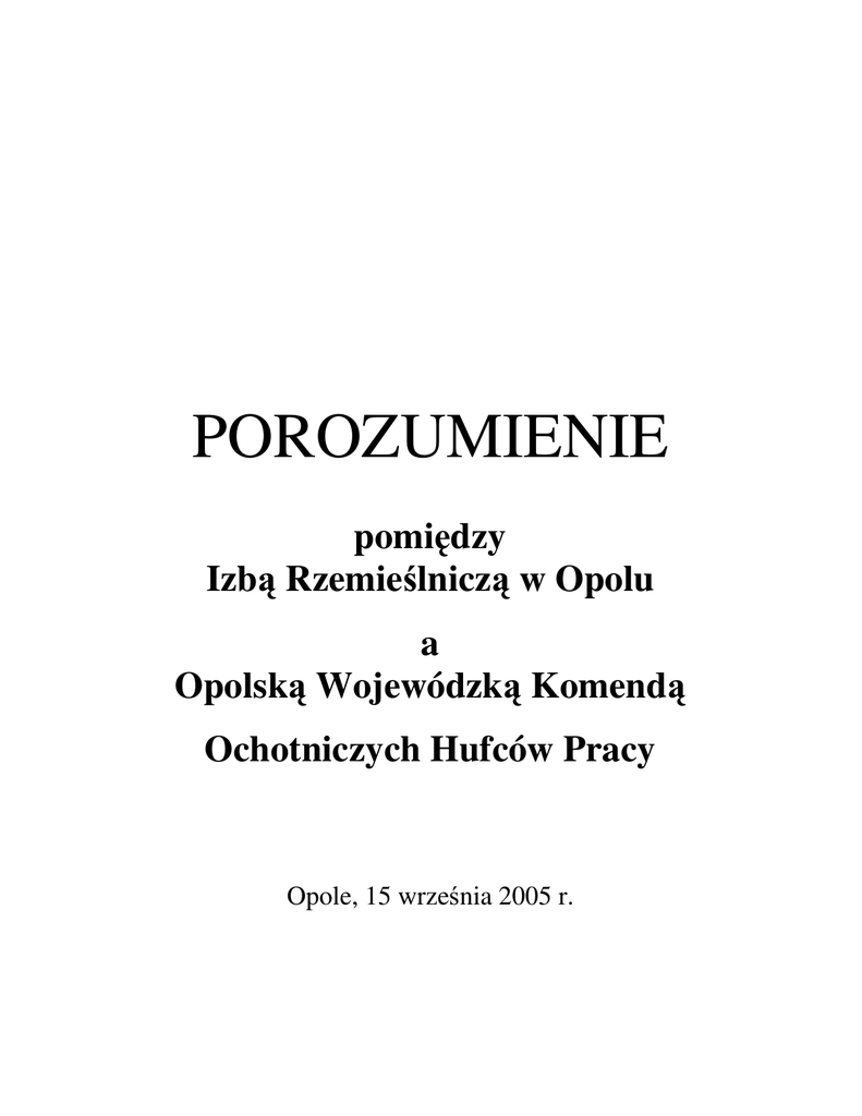 POROZUMIENIE pomiędzy Izbą Rzemieślniczą w Opolu a Opolską Wojewódzką Komendą Ochotniczych Hufców Pracy Opole, 15 września 2005 r. Porozumienie w sprawie współpracy w zakresie kształcenia zawodowego, szkolenia i wychowania młodzieży i dorosłych zawarte w dniu 15 września 2005 r. pomiędzy: Izbą Rzemieślniczą w Opolu reprezentowaną przez: ● Pana Tadeusza Starucha – Prezesa Zarządu Izby Rzemieślniczej w Opolu oraz ● Pana Rajnera Szica – Wiceprezesa Zarządu Izby Rzemieślniczej w Opolu a Opolską Wojewódzką Komendą Ochotniczych Hufców Pracy w Opolu reprezentowaną przez: ● Panią Edwardę Turkiewicz - Komendanta Wojewódzkiego. Uznając wzajemnie długoletnią praktykę, doniosły dorobek i bogate doświadczenie strony porozumienia dostrzegają wspólne płaszczyzny działalności, szczególnie na gruncie szkolenia i przeciwdziałania bezrobociu wśród młodzieży. Mając na względzie zapewnienie odpowiedniego przygotowania zawodowego młodzieży objętej szkoleniową i wychowawczą działalnością Izby Rzemieślniczej w Opolu i Opolskiej Wojewódzkiej Komendy OHP strony stwierdzają potrzebę współdziałania i rozwijania różnorodnych form dotychczasowej współpracy. §1 Współpraca stron będzie realizowana w ramach: 1. Działań na rzecz zapewnienia w zakładach rzemieślniczych miejsc praktycznej nauki zawodu dla młodzieży objętej opieką OHP, 2. Podejmowania wspólnych działań w zakresie realizacji projektów Europejskiego Funduszu Społecznego i innych programów europejskich, 3. Przedsięwzięć służących podnoszeniu poziomu kształcenia praktycznego i teoretycznego młodzieży, oraz doskonalenia zawodowego kadr szkolących obu instytucji, 4. Współpracy w zakresie propagowania przedsiębiorczości, a zwłaszcza rozwijania działalności gospodarczej w ramach rzemiosła, 5. Wspólnych przedsięwzięć dotyczących m.in. opracowywania wydawnictw metodyczno - szkoleniowych i informacyjnych oraz organizacji konferencji, seminariów itp., 6. Przedsięwzięć promocyjnych zachęcających młodzież do uzyskiwania kwalifikacji zawodowych i stałego doskonalenia zawodowego, 7. Działalności edukacyjnej w zakresie dokształcania teoretycznego młodocianych pracowników i uczniów dorosłych dotyczącego przygotowania i przeprowadzenia egzaminów czeladniczych i sprawdzających przez komisje egzaminacyjne Izby Rzemieślniczej w Opolu, 8. Wspólnych działań zmierzających do skutecznego, zgodnego z przepisami prawa realizowania refundacji ze środków Funduszu Pracy, wynagrodzeń i składek na ubezpieczenie społeczne młodocianych pracowników zatrudnionych w celu przygotowania zawodowego, 9. Inicjowania i wspierania różnorodnych form promocji zatrudnienia młodzieży §2 Dla realizacji powyższych zadań strony zobowiązują się do: Izba Rzemieślnicza w Opolu - udzielania pomocy w organizacji szkoleń dokształcających i doskonalących, - przekazywania za pośrednictwem zrzeszonych w Izbie Cechów informacji o wolnych miejscach w zakładach rzemieślniczych na naukę zawodu lub przyuczenie do wykonywania określonych prac, - udostępniania materiałów informacyjnych związanych z procesem szkolenia praktycznego i potwierdzania kwalifikacji w rzemiośle, - kierowania konsultantów, wykładowców i instruktorów wywodzących się spośród rzemieślników i pracowników Izby Rzemieślniczej do udziału w kursach i szkoleniach organizowanych przez OHP, - organizowania stosownie do potrzeb, egzaminów czeladniczych i sprawdzających. Opolska Wojewódzka Komenda Ochotniczych Hufców Pracy - organizowania szkoleń zawodowych we wszystkich przewidzianych prawem formach, stosownie do zapotrzebowania rzemieślników, - systematycznego podnoszenia poziomu działalności edukacyjnej, - zapewnienie, w miarę potrzeb bazy kształcenia teoretycznego oraz niezbędnych programów nauczania i innych materiałów związanych ze szkoleniem zawodowym, - tworzenia hufców pracy na potrzeby młodzieży kształcącej się i zatrudnionej w zakładach rzemieślniczych, - kompletowania wymaganych przepisami prawa dokumentów warunkujących dopuszczenie do egzaminów czeladniczych lub sprawdzających i udzielania pomocy Izbie Rzemieślniczej w organizacji sesji egzaminacyjnych, - wsparcia działań z zakresu poradnictwa i doradztwa zawodowego w środowisku rzemieślniczym poprzez prowadzenie warsztatów zajęciowych dla młodzieży przez doradców zawodowych Mobilnego Centrum Informacji Zawodowej dojeżdżających na zapotrzebowanie Izby Rzemieślniczej do miejsc przez nią wskazanych, oraz poprzez działalność Młodzieżowego Centrum Kariery, - współorganizowania różnych form wypoczynku młodzieży wyjazdowych i w miejscu zamieszkania w okresie ferii i wakacji, oraz stwarzania możliwości udziału w nich młodzieży zatrudnionej w zakładach rzemieślniczych. - refundowania zakładom rzemieślniczym kosztów zatrudniania młodocianych pracowników w celu nauki zawodu, §3 Strony porozumienia zobowiązują się wzajemnie informować o efektach realizowanych przedsięwzięć oraz w zależności od potrzeb wspólnie analizować realizację niniejszego porozumienia, §4 Porozumienie zostaje zawarte na czas nieokreślony, a zmiany w jego treści mogą być dokonywane za zgodą stron. §5 Porozumienie sporządzono w dwóch jednobrzmiących egzemplarzach, po jednym dla każdej ze stron. §6 Porozumienie wchodzi w życie z dniem podpisania.