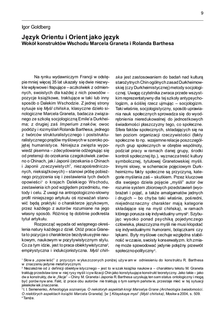 9 Igor Goldberg J zyk Orientu i Orient jako j zyk Wokół konstruktów Wschodu Marcela Graneta i Rolanda Barthesa Na rynku wydawniczym Francji w odst pie mniej wi cej 35 lat ukazały si dwie niezwykle wpływowe i frapuj ce – aczkolwiek z odmiennych, swoistych dla ka dej z nich powodów pozycje ksi kowe, traktuj ce w taki lub inny sposób o Dalekim Wschodzie. Z jednej strony sytuuje si My l chi sk a, klasyczne dzieło sinologiczne Marcela Graneta, badacza zwi zanego ze szkoł socjologiczn Emile’a Durkheima; z drugiej za Imperium z nak ów, owoc podró y i rozmy la Rolanda Barthesa, jednego z twórców strukturalistycznego i poststrukturalistycznego pr dów my lowych w szeroko poj t ej humanisty ce. Niniejsz a zwi zła wy powied pisemna – zdecydowanie od egnuj c si od pretensji do orzekania czegokolwiek zarówno o Chinach, jak i Japonii (orzekania o Chinach i Japonii „rz eczywisty ch”, niez apo redniczonych, nieksi kowych) – stanowi prób pobie nego przyjrzenia si i zestawienia tych dwóch opowie c i1 o k rajac h Dalek iego Ws chodu, zestawienia ich pod wzgl dem przedmiotu, metody i celu. Z uwagi na antropologiczno-słowny profil niniejszego artykułu o rozwa a stanowić b d praktyki o c harakterze j zykowym, przez ka dego z autorów rozumiane na jego własny sposób. Ró nic t dobitnie podkre la tytuł artykułu. Rozpocz ć wypada od wst pnego okre lenia natury ka dego z dzieł. Otó praca Graneta to pozycja o charakterze bezdyskusyjnie naukowym, naukowym w pozytywistycznym stylu. Co za tym idzie, jest to praca obiektywistyczna2, empirystyczna i indukcjonistyczna. My l chi - ska jest zastosowaniem do bada nad kultur staro ytnych Chin ogólnych zasad Durkheimowskiej (czy Durkheimistycznej) metody socjologicznej. Uwag czytelnika zwraca przede wszystkim reprezentatywny dla tej szkoły antypsychologizm, a ci lej rzecz ujmuj c – socjologizm. Taki wła nie, socjologistyczny, sposób uprawiania nauk społecznych sprowadza si do wyodr bnienia nieredukowalnej do jednost kowych wiadomo ci płaszczyzny tego, co społeczne. Sfera faktów społecznych, składaj cych si na ten poziom organizacji rzeczywist o ci (fakty społeczne to np. wzajemne relacje poszczególnych grup społecznych w obr bie wspólnoty, podz iał pracy w ramach danej grupy, rodki kontroli społecznej itp.), wyznacza tre ć kultury symbolicznej, tytułowej Granetowskiej my li. Innymi słowy, w schemacie poj ciowym Durkheimizmu fakty społeczne s przyczyn , kategorie my lenia za – skutkiem. Przez kluczowe dla swojego dzieła poj cie „my li” autor ów rozumie system zbiorowych przedstawie (wyobra e i poj ć, a tak e amalgamatów jednych i drugich – bo chy ba taki wła nie, po redni, niejednoz naczny charakter maj kategorie składaj ce si na my l c hi sk ), w ramach którego porusza si indywidualny umysł3. Szybuj c wys oko ponad psy chik pojedync zego człowieka, płaszczyzna my li nie musi kłopotać si indywidualnymi humorami, bol czkami czy l kami. Byty my lowe cechuje wzgl dna stabilno ć w czasie, swoisty konserwatyzm. Ich zmian mo e spowodować jedynie pot ny przewrót społeczno-polityczny 4. 1 Słow a „opow ie ć” z przy czyn w yłus zczonych poni ej u y w am w odniesieniu do kons truktu R. Barthesa w znaczeniu jedynie metaforycznym. 2 Niezale nie od z definicji obiektyw istycznego – jest to w szak ksi ka naukow a – charakteru tekstu M. Graneta traktuj przedstaw ione w niej rysy my li i cyw ilizacji Chin jako konstytuuj ce konstrukt teoretyczny. Jako takie – jako dw a konstrukty, dw ie „fikcje” – Chiny M. Graneta i Japonia R. Barthesa uzyskuj ten sam status ontologiczny i mog być porów nyw ane. Fakt, i prace obu autorów nie traktuj o tym samym pa stw ie, przestaje mieć w tej sytuacji jakiekolw iek znaczenie. 3 I. I. Semenenko, Arheologiya soznaniya. O nekotoryh aspektah knigi Marselya Grane (Archeologia wiadomo ci. O niektórych aspektach ksi ki Marcela Graneta), [w :] Kitayskaya mysl’ (My l chi ska), Moskw a 2004, s. 509. 4 Tam e. 10 Poz ycja j zyka w ramach Durkheimistycznego schematu poj ciowego nie jest bynajmniej uprzywilejowana. Wydaje si , e j zyk to dla Granet a jedynie no nik my li, swego rodzaju naczynie kategorii my lowych. Jakkolwiek kształt owego naczynia – cechy j zyka chi s kiego – współtworzy swoisto ć kultury chi skiej, to nie stanowi wcale jej kluczowej cz ci. Jest po prostu jednym z elementów, komponentem o charakterze raczej podrz dnym. Miejsce j zyka w Granetowskim k onstrukcie kultury Pa stwa rodka przybli a nam ju sama struktura jego dzieła – rozdział dotycz cy j zyka chi s kiego (Wyra anie my li, tytuł jak e znamienny!) zajmuje jedynie około 1/10 obj to ci pracy i stanowi margines jego rozwa a . J dro dz ieła t o c harakt ery sty ka my li, rozpatrywanej w oderwaniu od j zyka, lecz nigdy nieoddzielonej od sfery tego, co społeczne. Gdyby pokusić si o, bazuj ce na metodzie Graneta, uszeregowanie (ze wzgl du na istotno ć) poj ć składaj cych si na indoeuropejsk triad : j zyk, my l, rzeczywisto ć – to pierwsze wyró nione miejsce w tak powstałej hierarchii zaj łaby bezapelacyjnie rzeczywisto ć (z tym e rzeczywisto ć szczególna, bo zawsze i tylko społeczna). Na wzór rzeczywisto ci społecznej i za jej przyczyn powstaje my l; j zyk za jedynie zarysowuje kontury my li, wyznacza granice jej formy, tre ć pozostawiaj c nietkni t . O ile wi c przedmiot studium Graneta to sfera my li chi skiej pojmowana przeze obiektywistycznie i traktowana jako epifenomen faktów społecznych, o tyle Barthes otwarcie i rozmy lnie nadaje swojej Japonii (lub lepiej: temu, co nazywa Japoni ) status fikcji, konstruktu, który nie pretenduje do odwzorowania (czy wr cz: kategorycznie odmawia odwzorowania) czego wobec siebie zewn trznego: Mog te , nie roszcz c sob ie prawa do przedstawiania lub analizowania rzeczywisto ci (s to główne cechy zachodniego dyskursu), zaczerpn ć z któregokolwiek miejsca wiata (stamt d) pewn liczb rysów b d rys (w zale no ci od tego